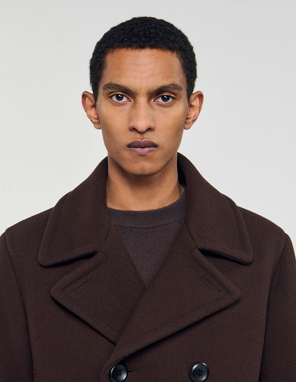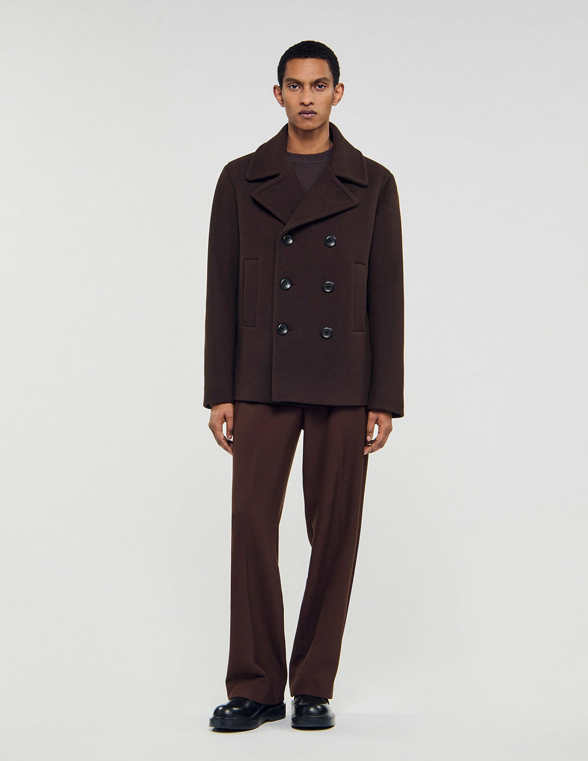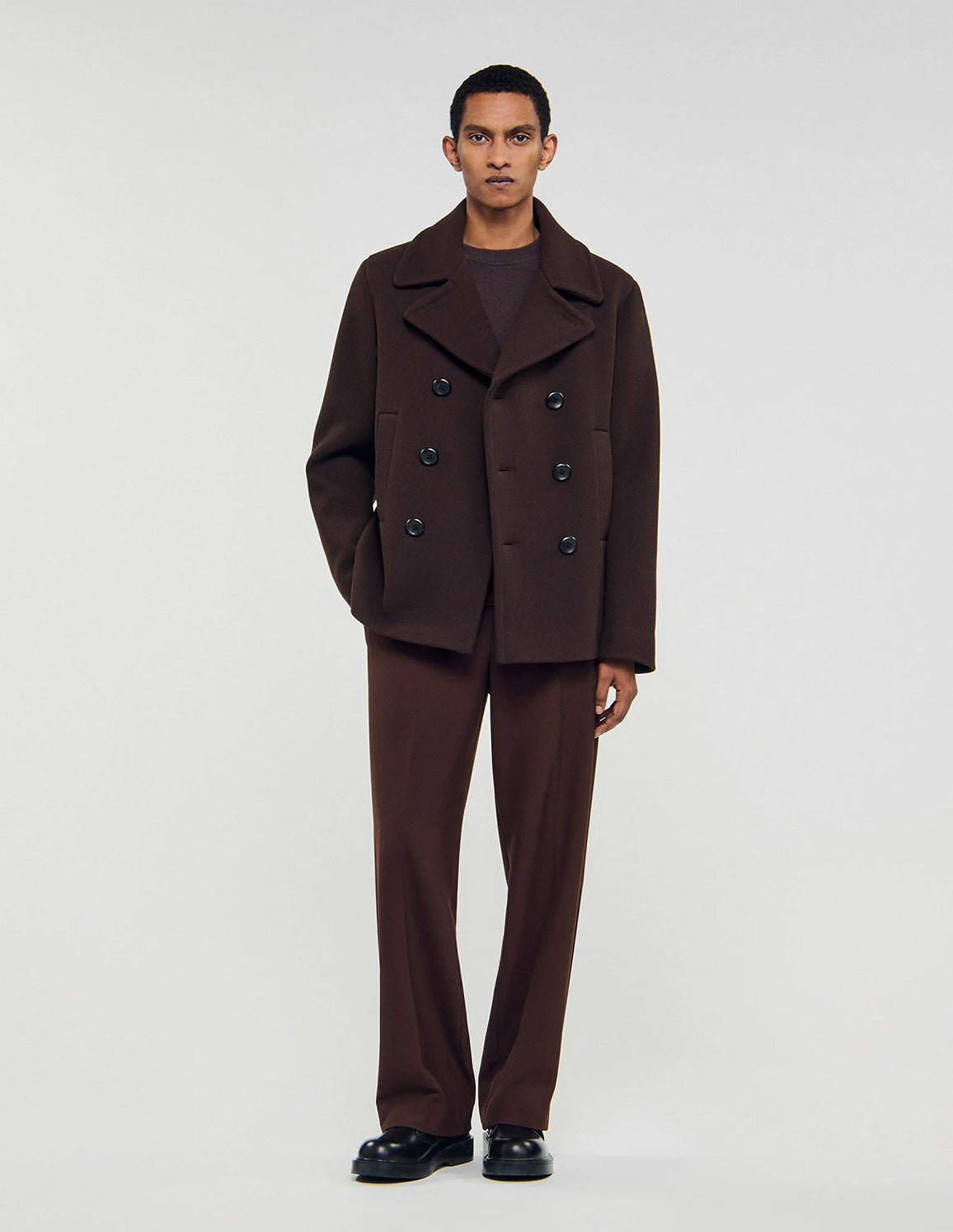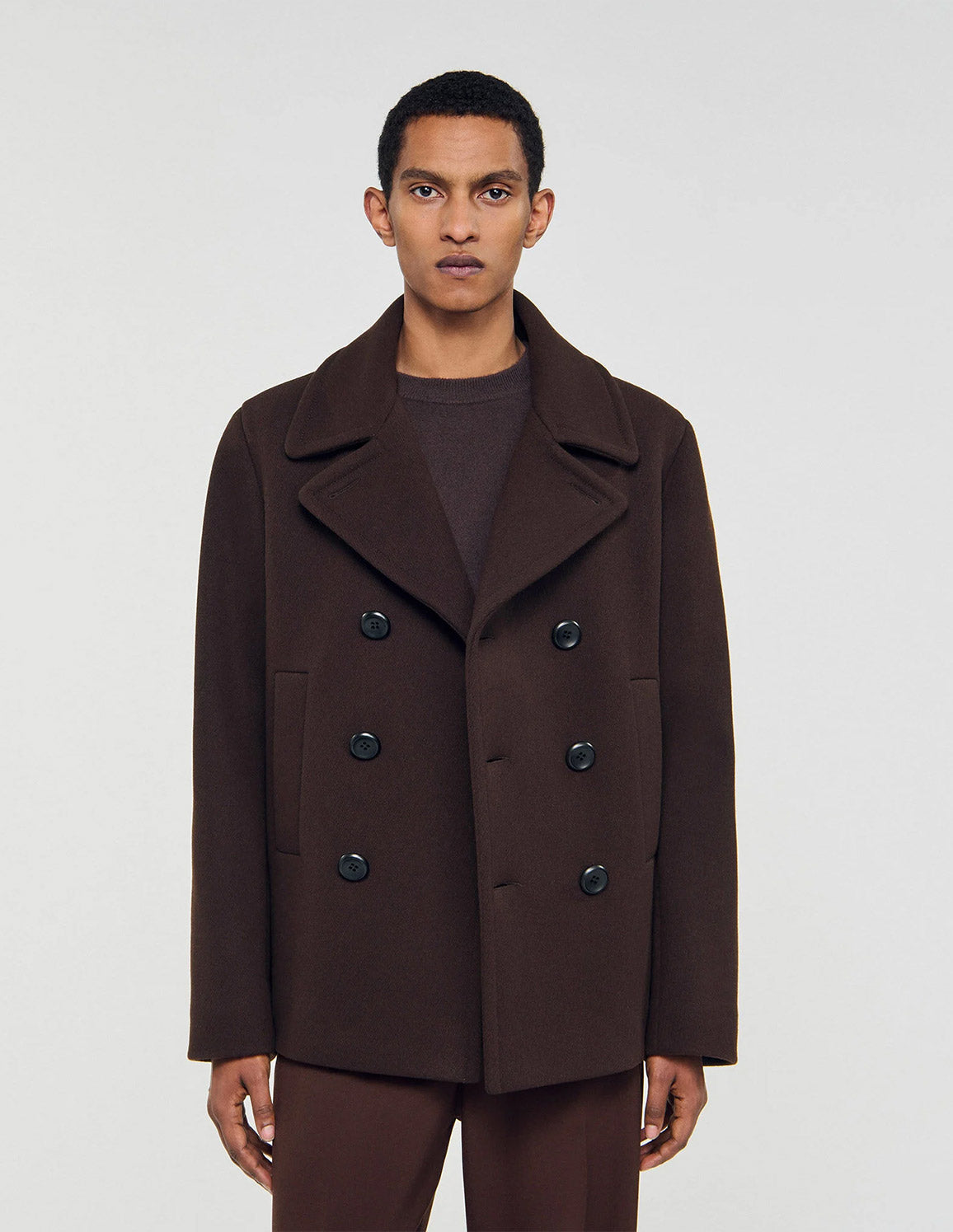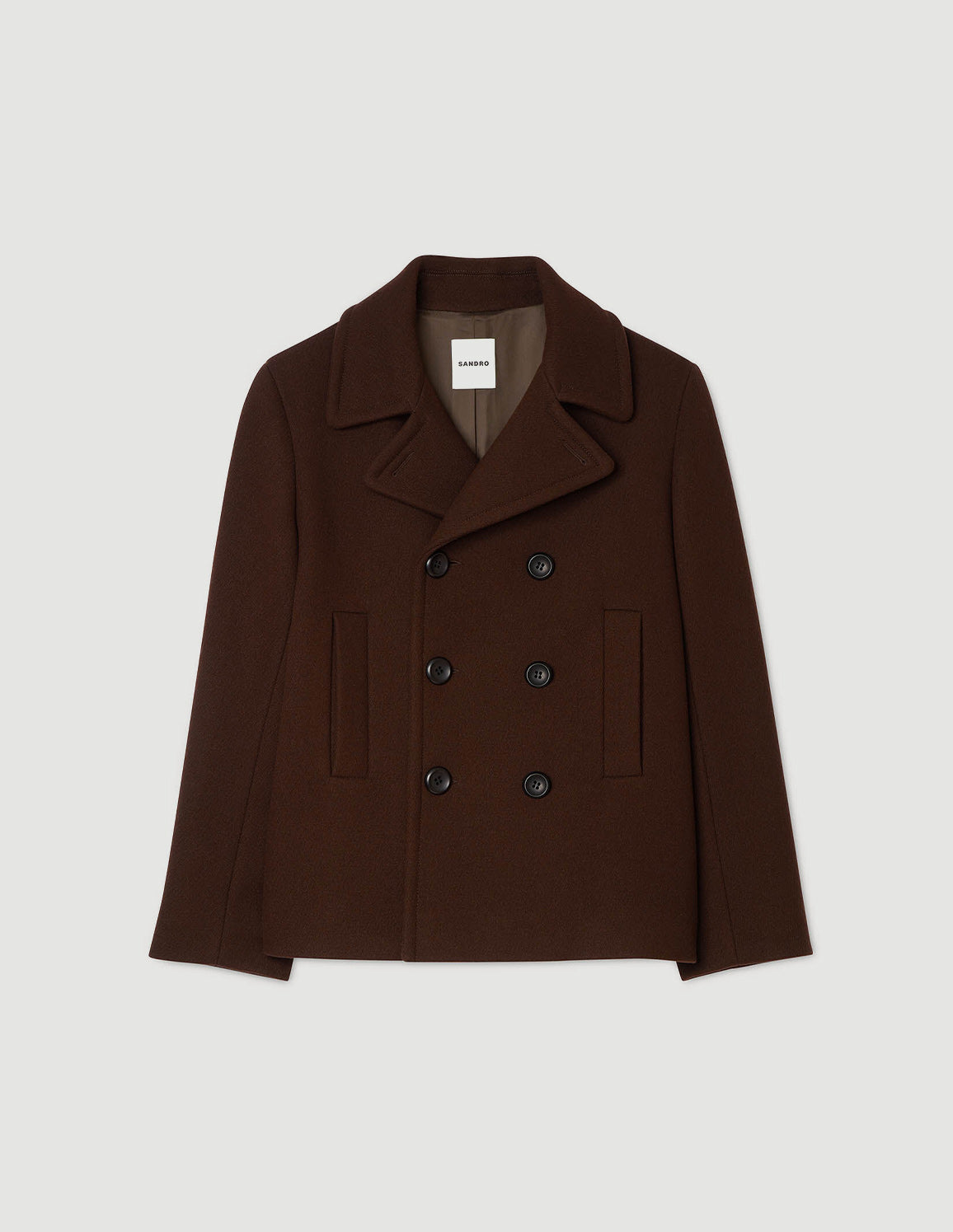 • Wool pea coat with double-breasted button fastening, long sleeves and a lapel collar.