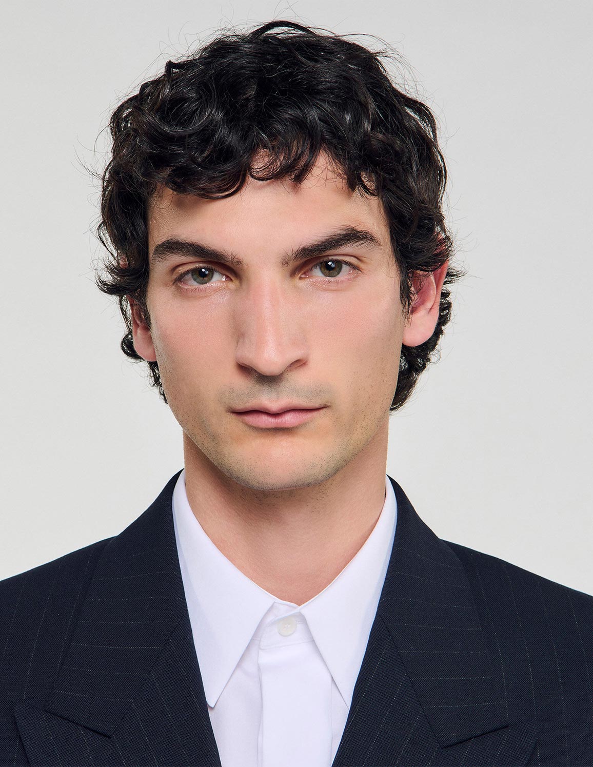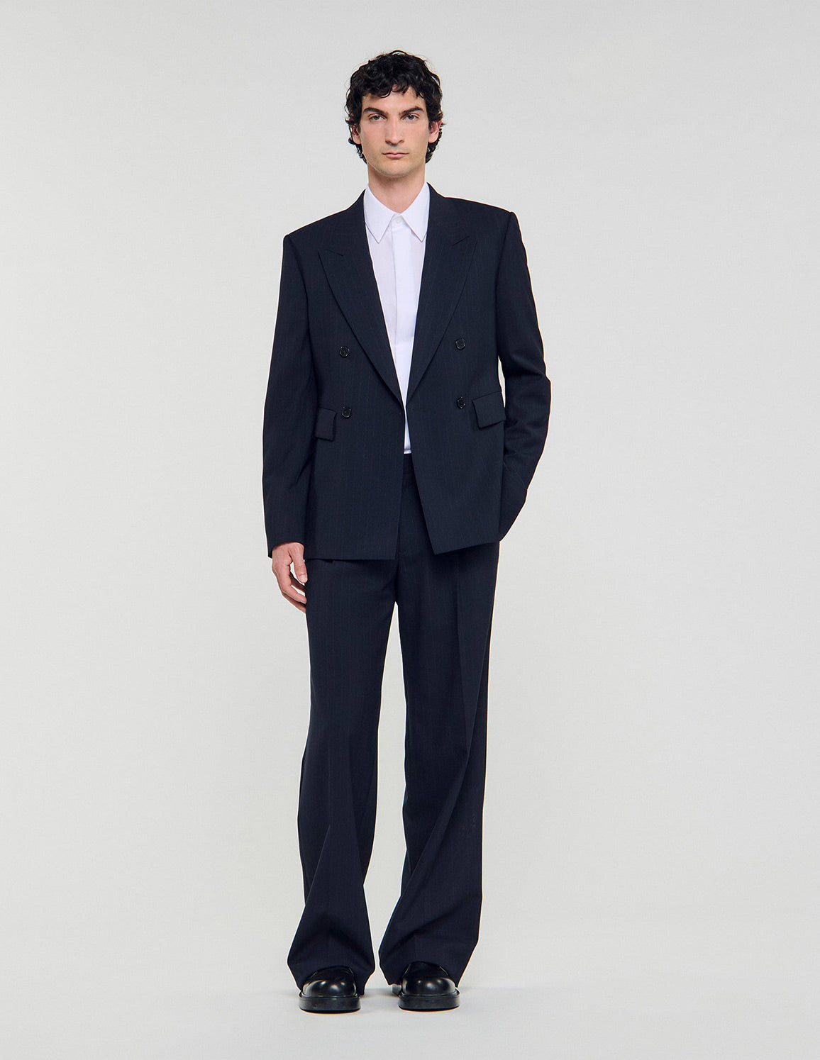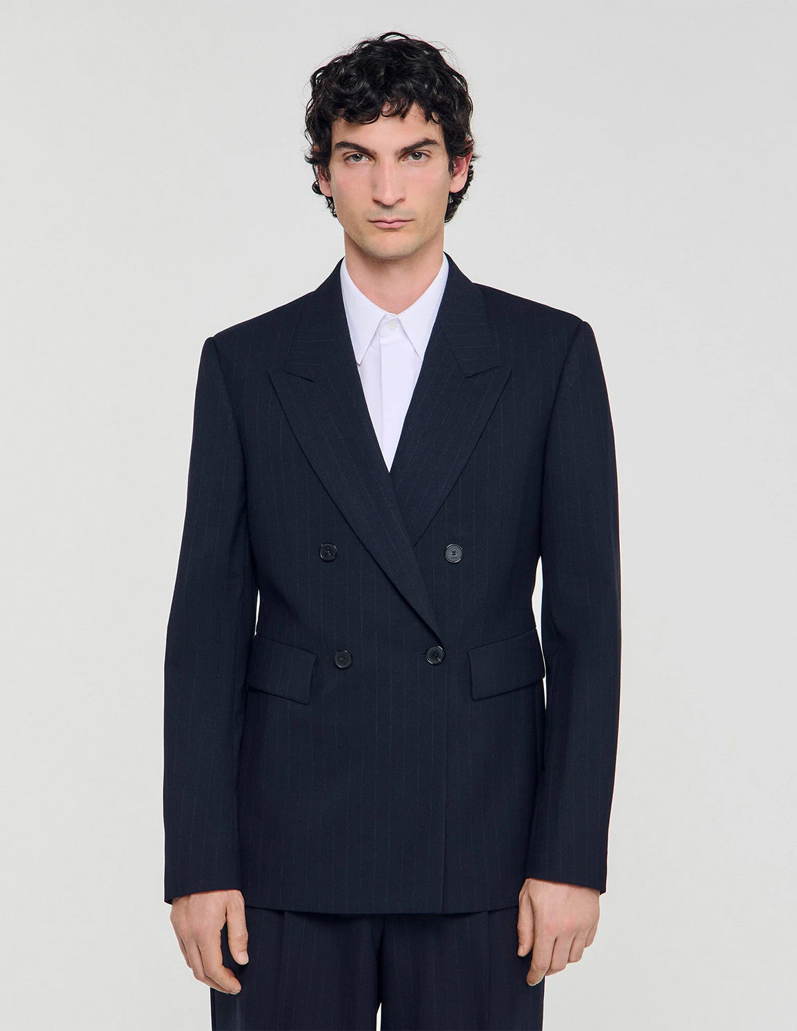• Pinstriped wool suit jacket featuring a tailored collar, double-breasted fastening and long sleeves.