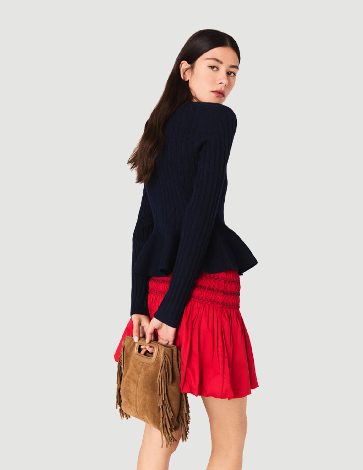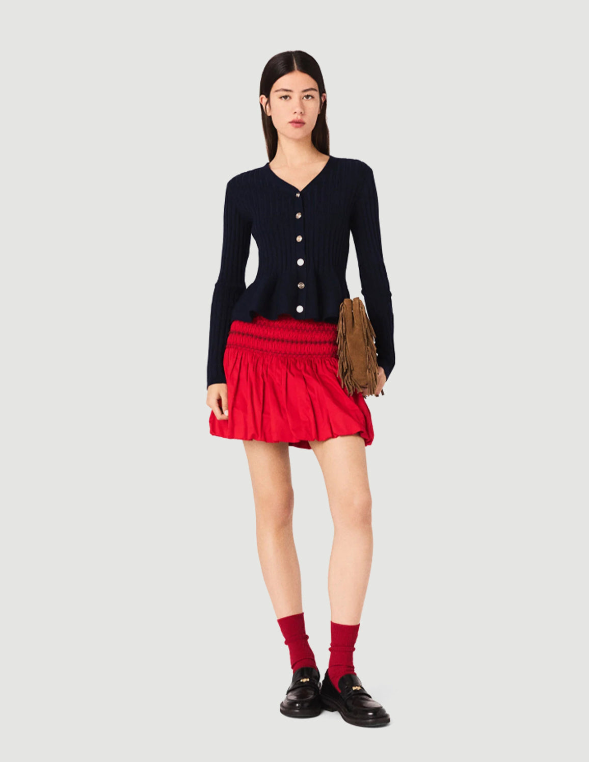 • This cardigan stands out with its peplum cut that highlights the waist while adding movement to the silhouette. The V-neck and button fastening enhance its reimagined classic spirit, while the soft knit ensures comfort and femininity.
