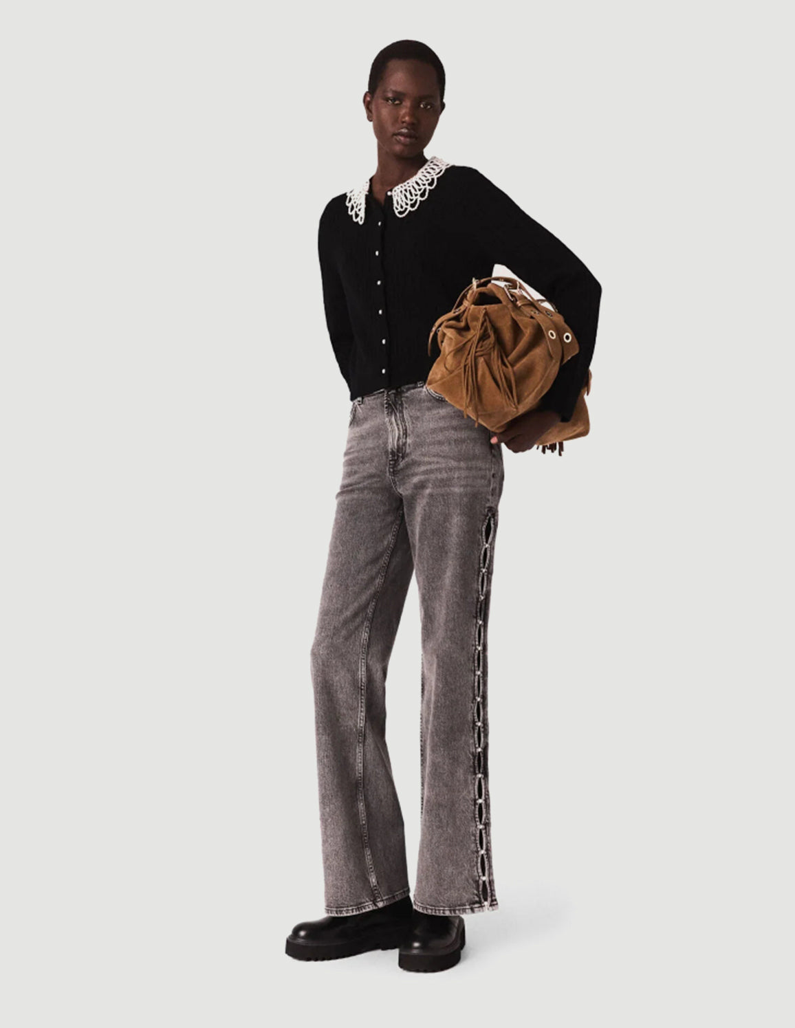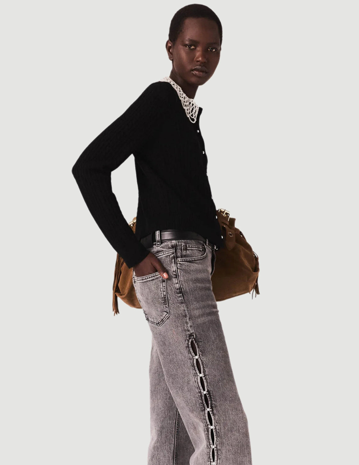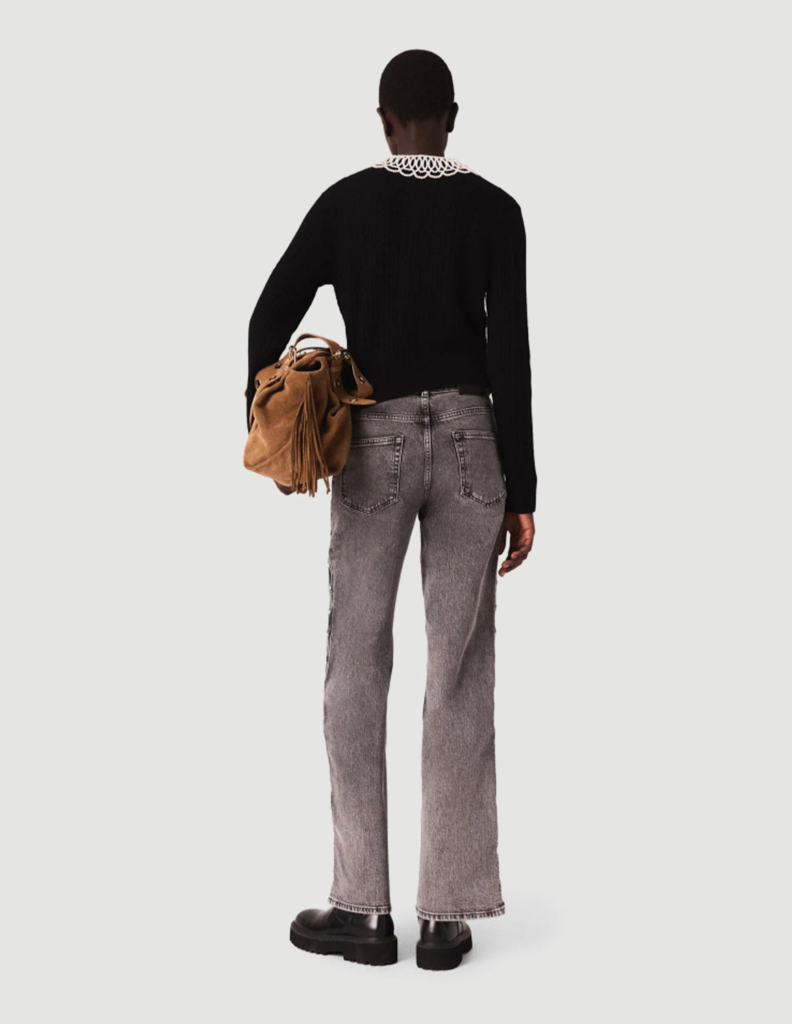 • Wear it with faded, pearl-embellished jeans with openwork sides, this season's signature suede bag and chunky-soled ankle boots.