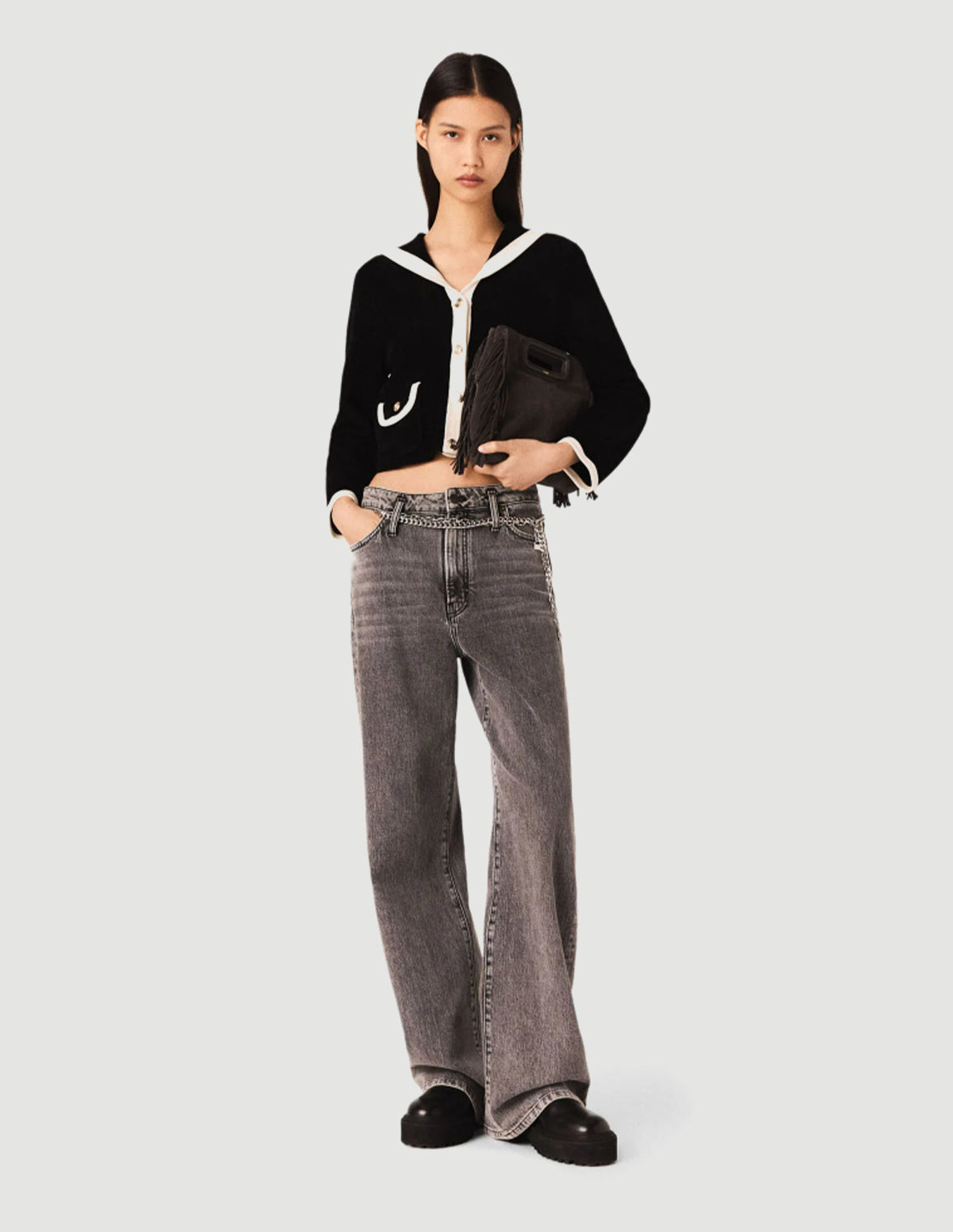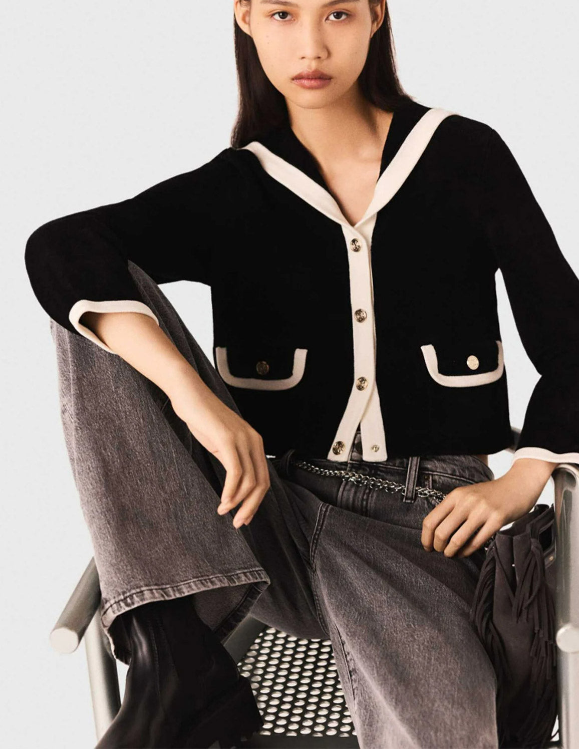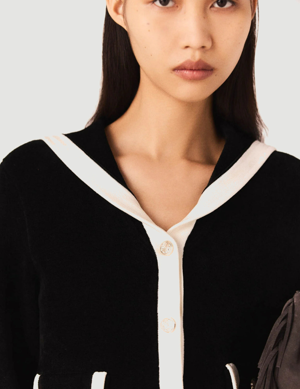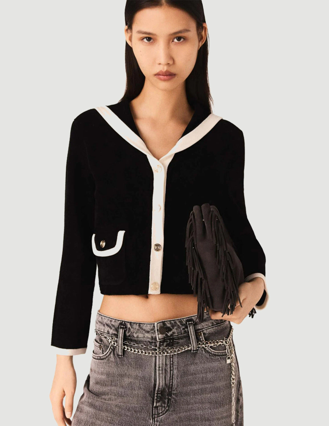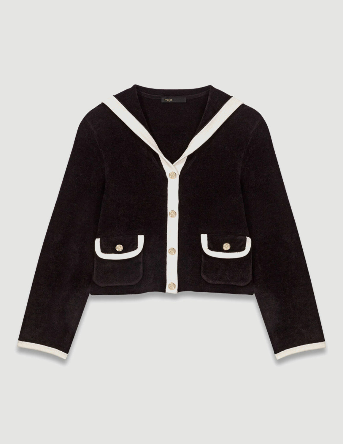 • Made from a soft, textured velvet-effect knit, this cropped cardigan stands out with its wide sailor collar inspired by nautical style and its contrasting finishes.