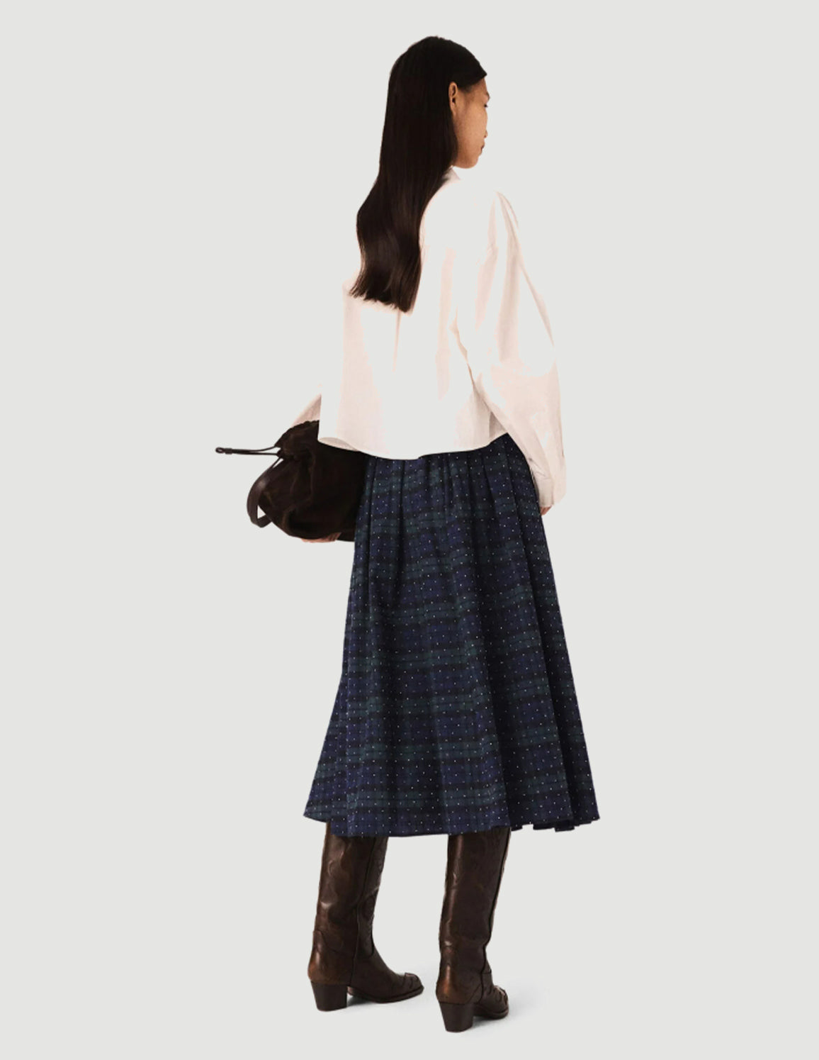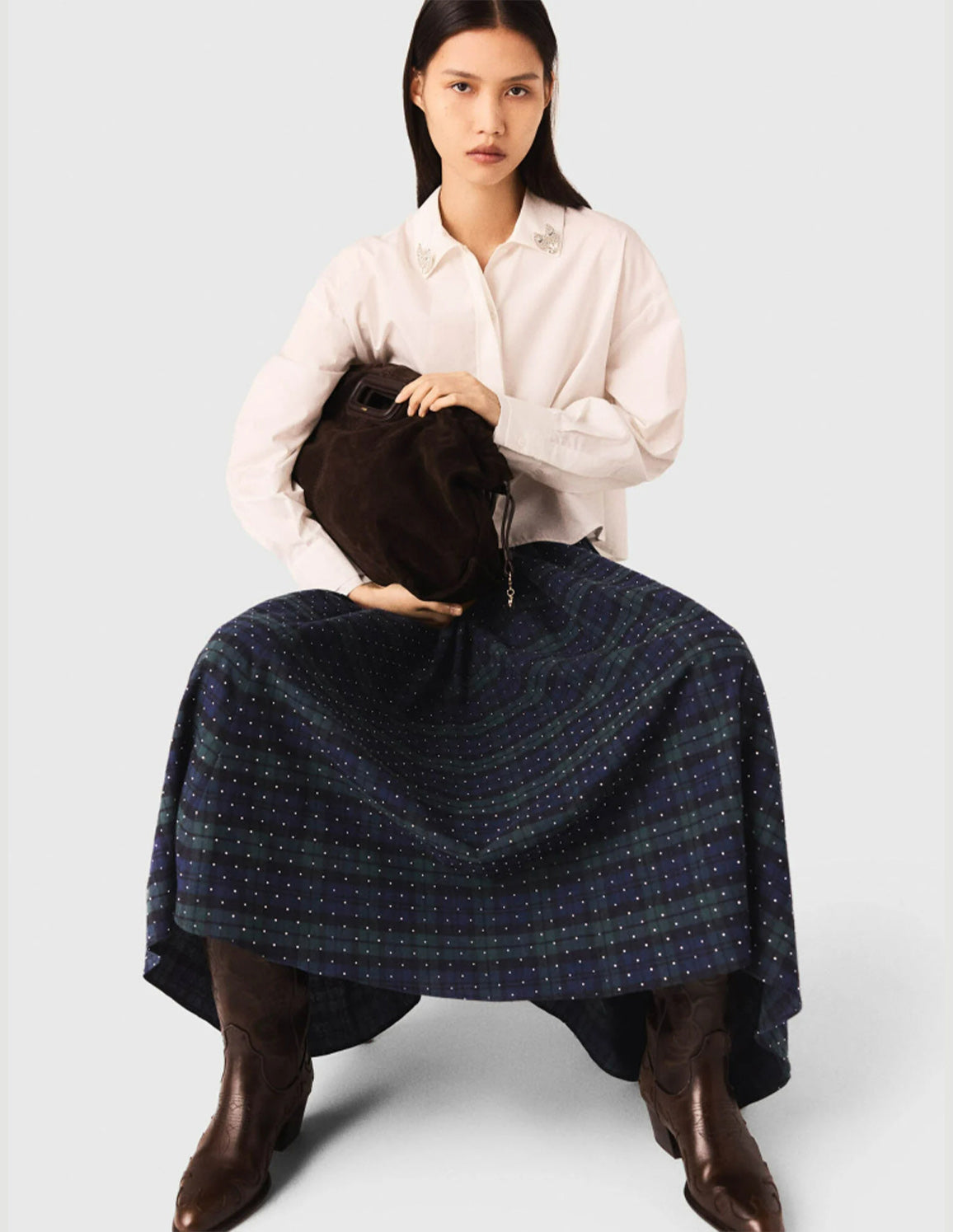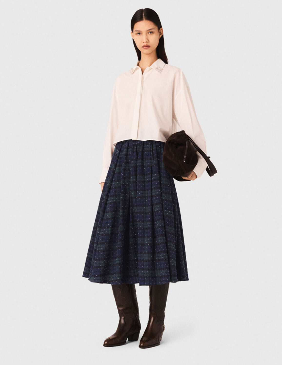 • This long skirt combines the classic look of checks with the sparkle of rhinestones. Full and flared, it offers fluid movement and a redefined silhouette. Wear it with a loose shirt with an embroidered collar and high boots for an assertive look, or create a twin set with the matching shirt.