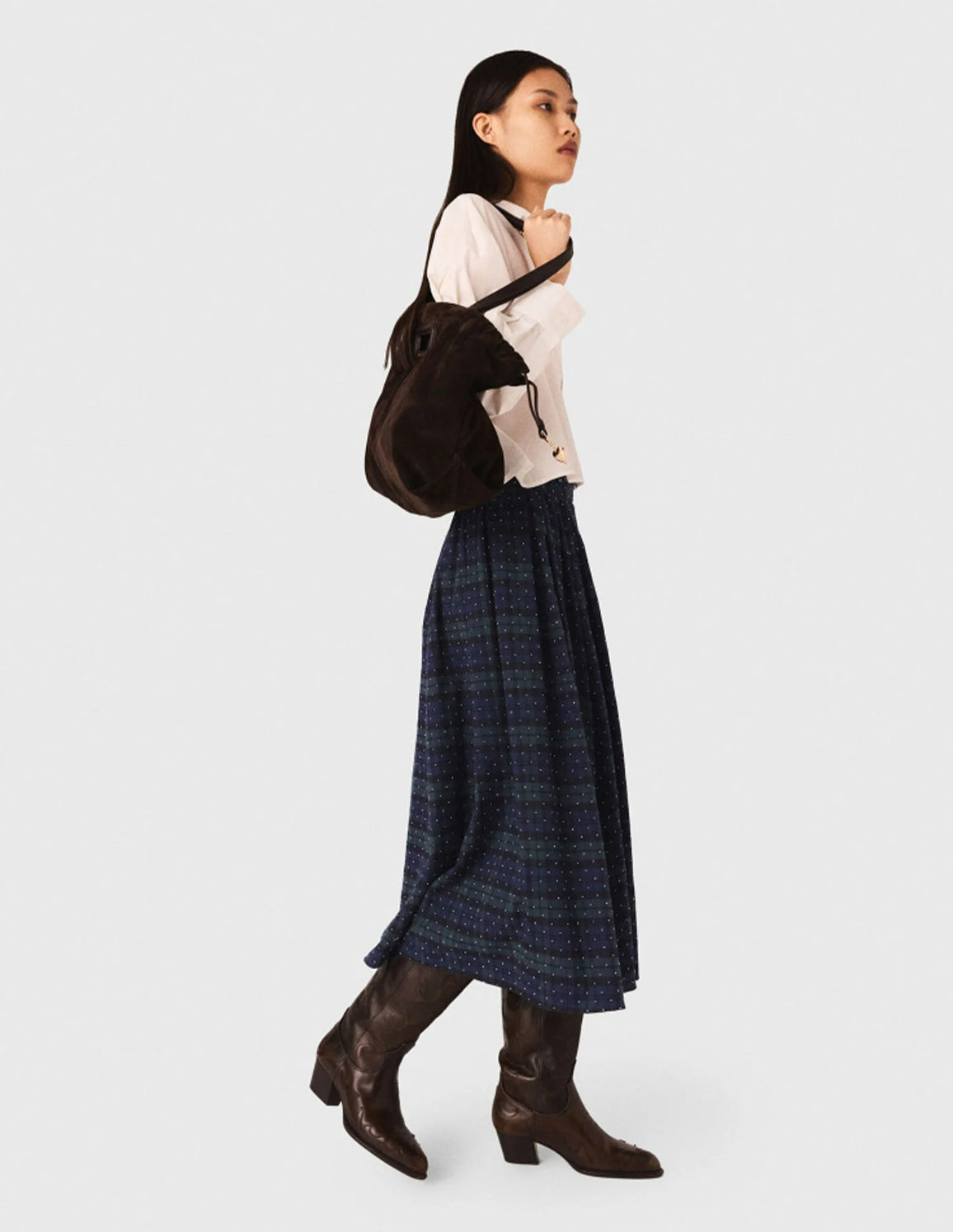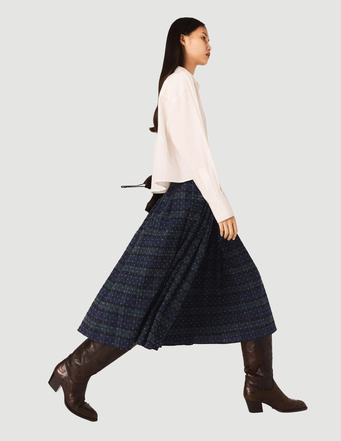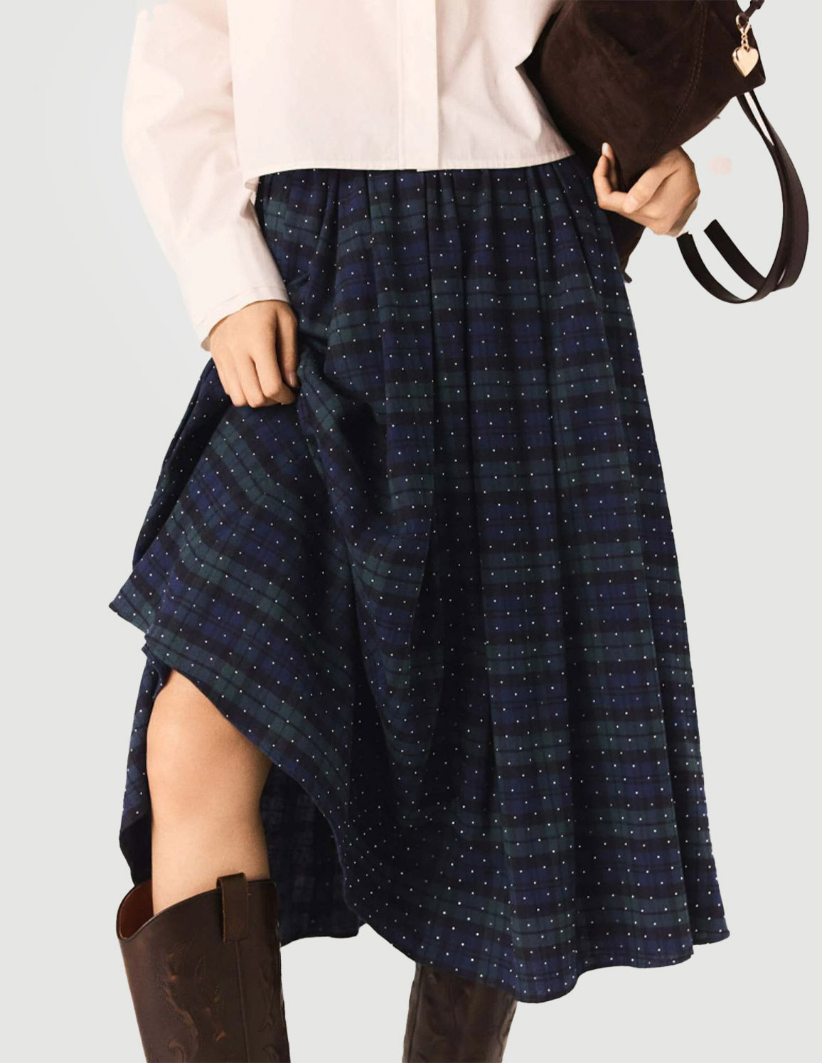 • This long skirt combines the classic look of checks with the sparkle of rhinestones. Full and flared, it offers fluid movement and a redefined silhouette. Wear it with a loose shirt with an embroidered collar and high boots for an assertive look, or create a twin set with the matching shirt.