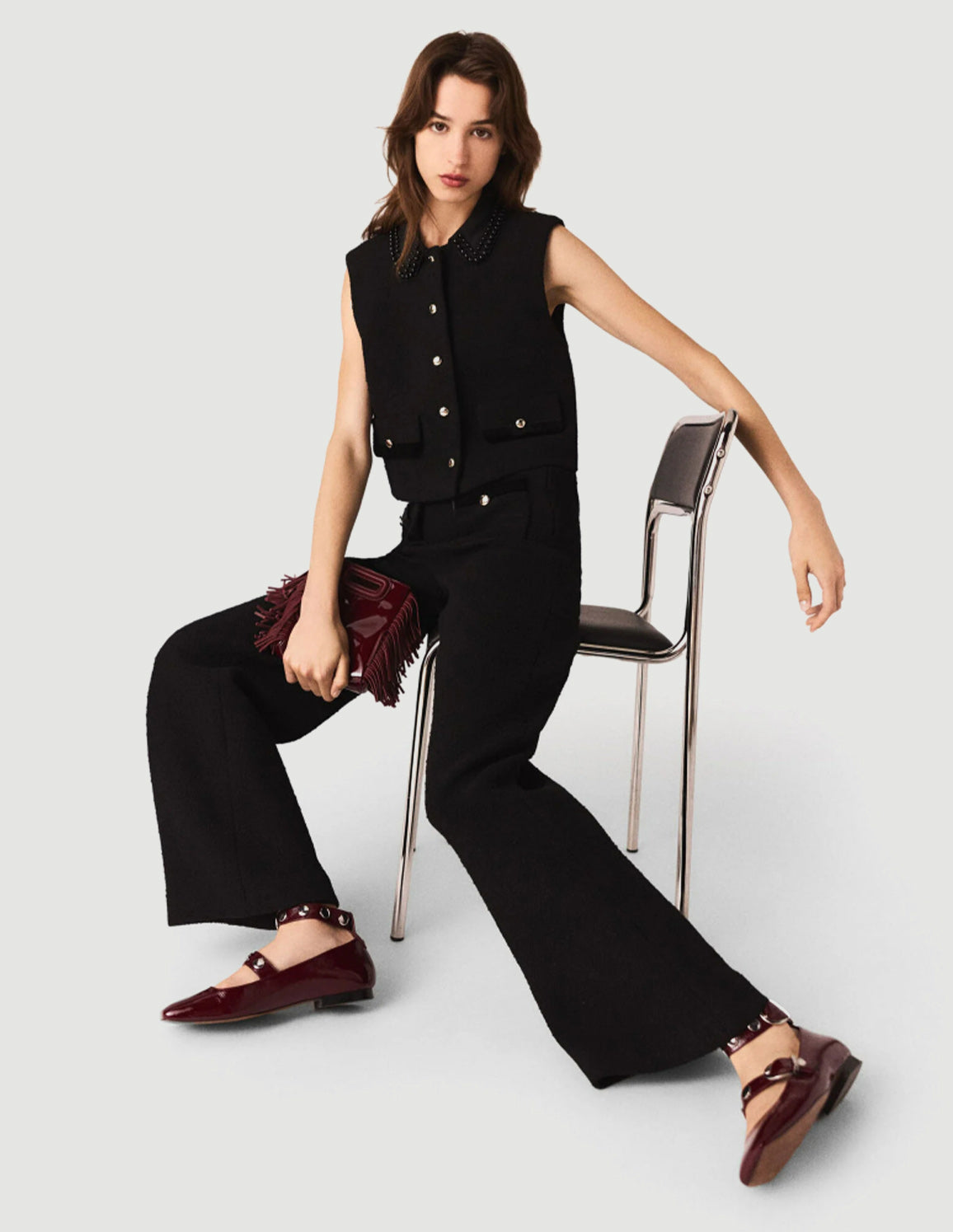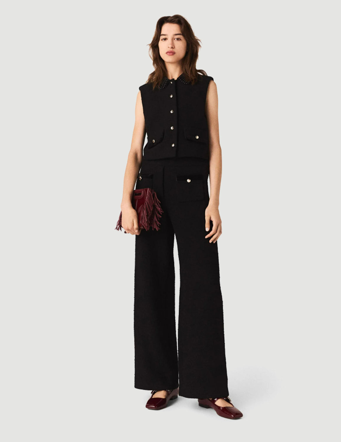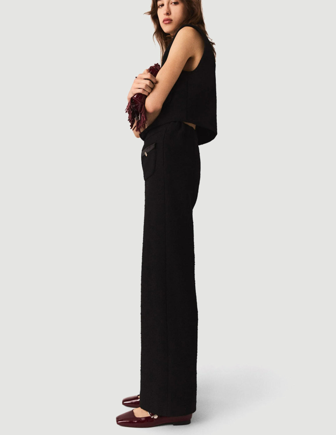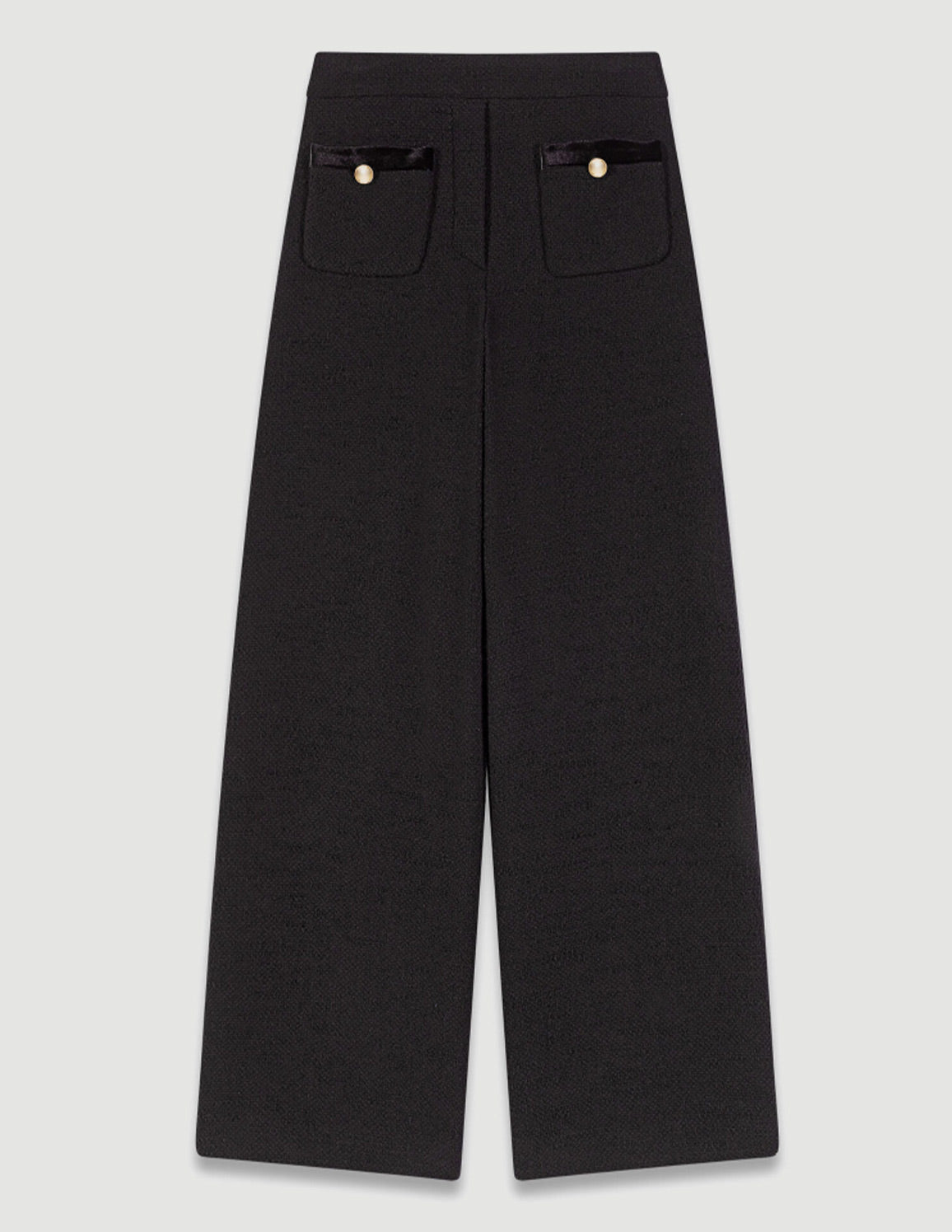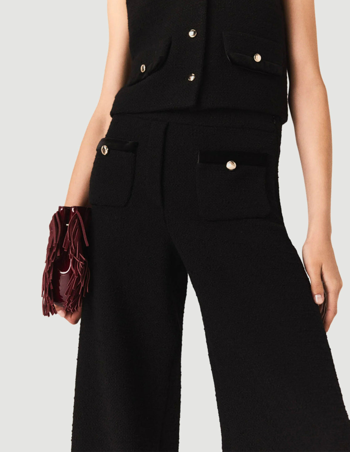 • A play on textures and a graphic look for these wide-leg tweed trousers with a floaty drape. Accented with velvet stripes that add contrast and depth, they reinvent elegance: structured, understated, but always bold. The semi-elasticated waist ensures a comfortable, fitted silhouette.