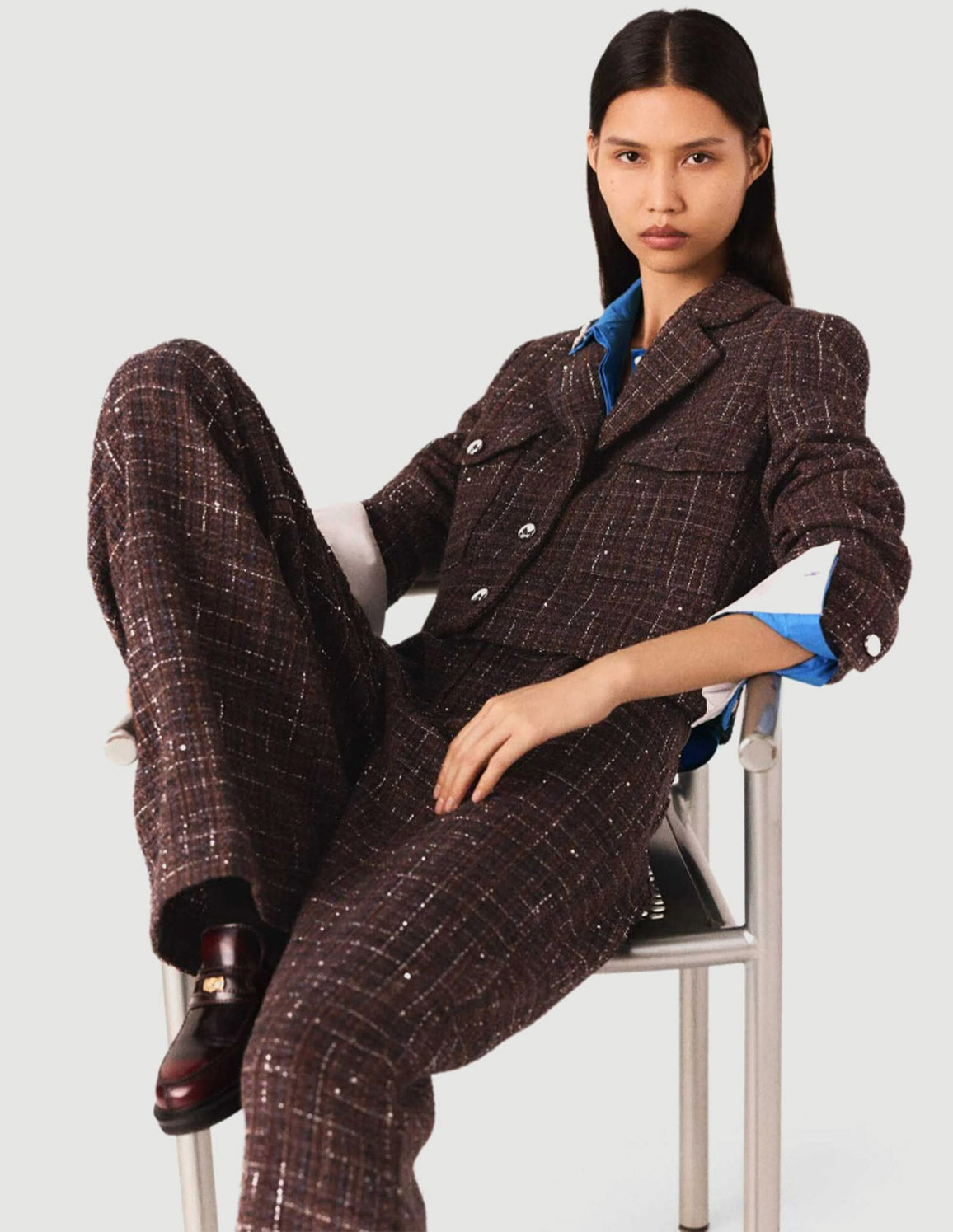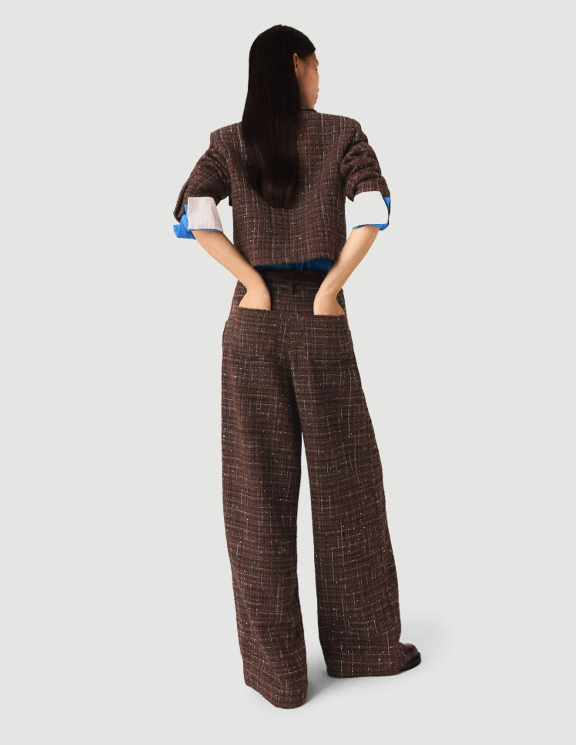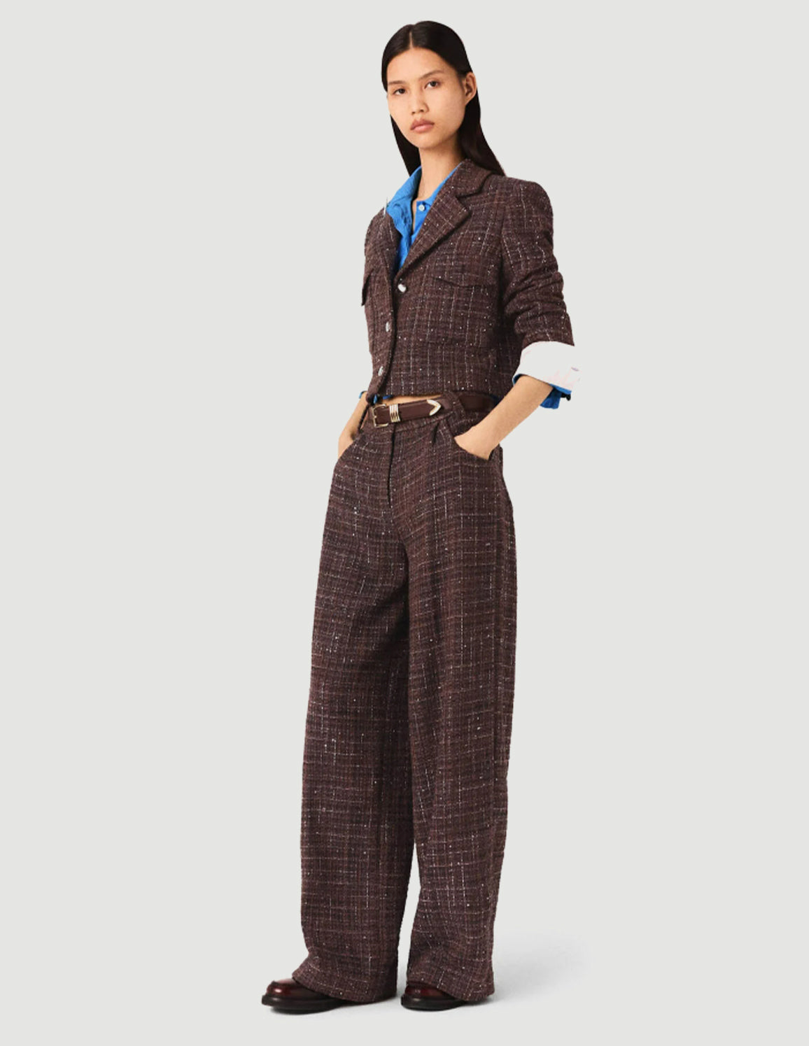 • This season, Maje has put a sparkling new spin on tailoring. These sequined tweed trousers combine a timeless fabric with sparkling sequins. Their wide cut, accentuated by box pleats, adds structure to the silhouette. Wear with the matching jacket for a bold take on the suit, and accessorise with a belt and leather boots.