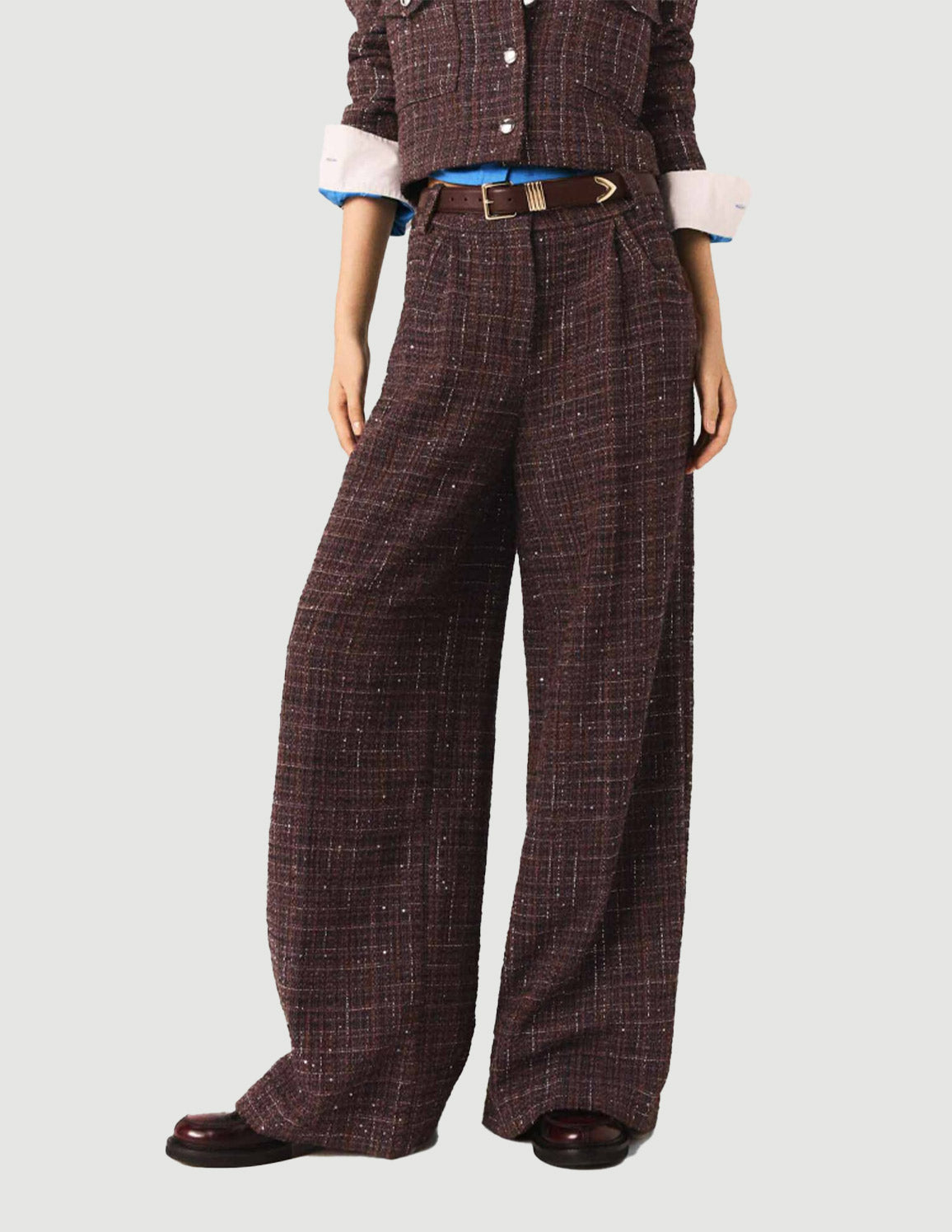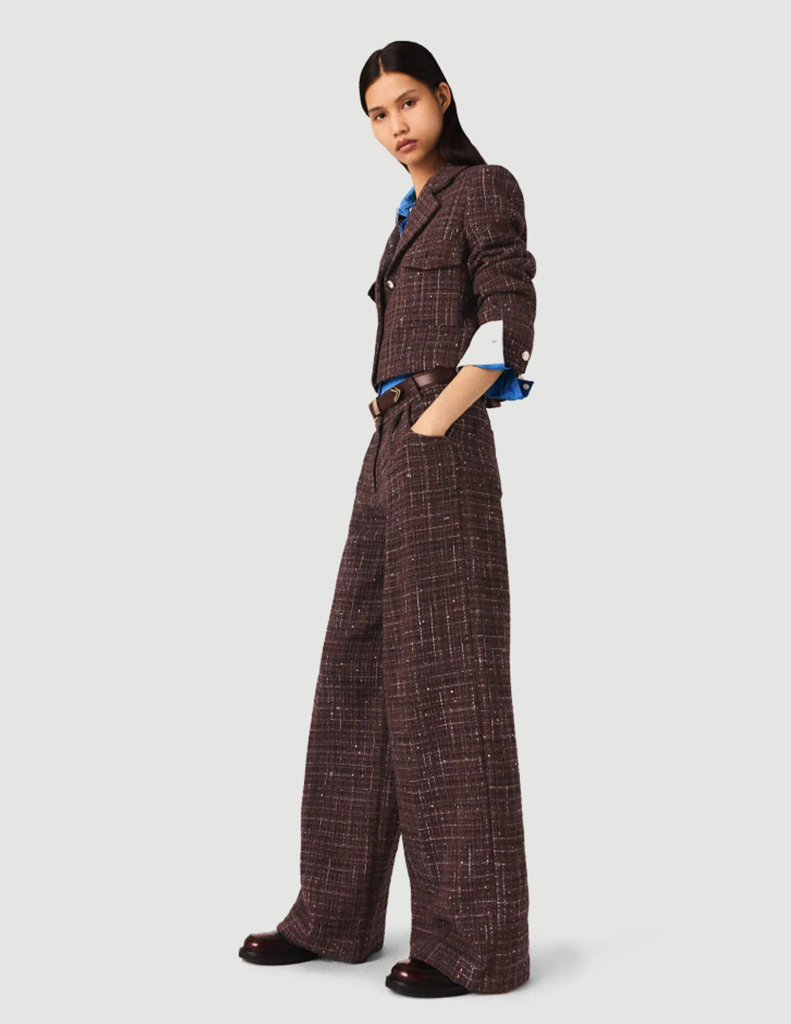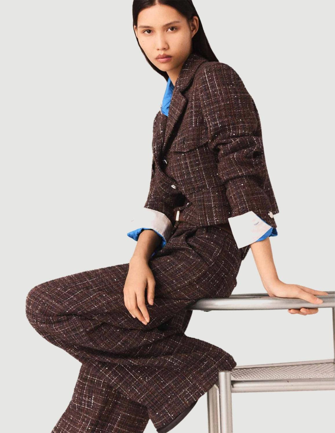 • This season, Maje has put a sparkling new spin on tailoring. These sequined tweed trousers combine a timeless fabric with sparkling sequins. Their wide cut, accentuated by box pleats, adds structure to the silhouette. Wear with the matching jacket for a bold take on the suit, and accessorise with a belt and leather boots.