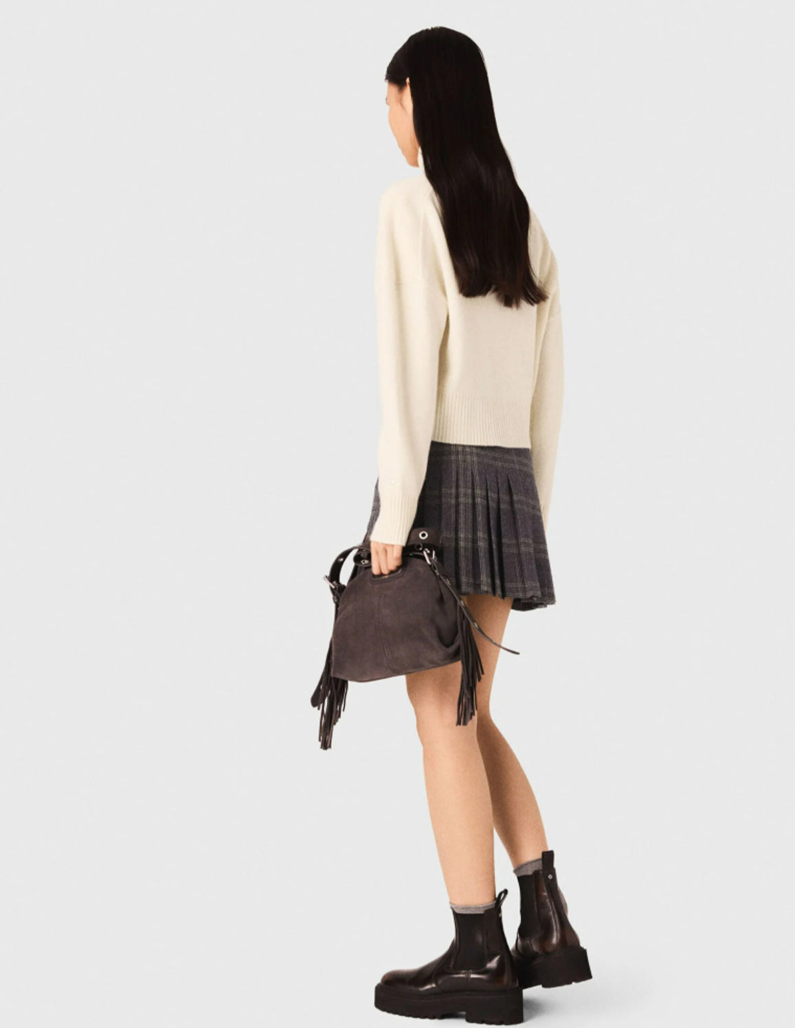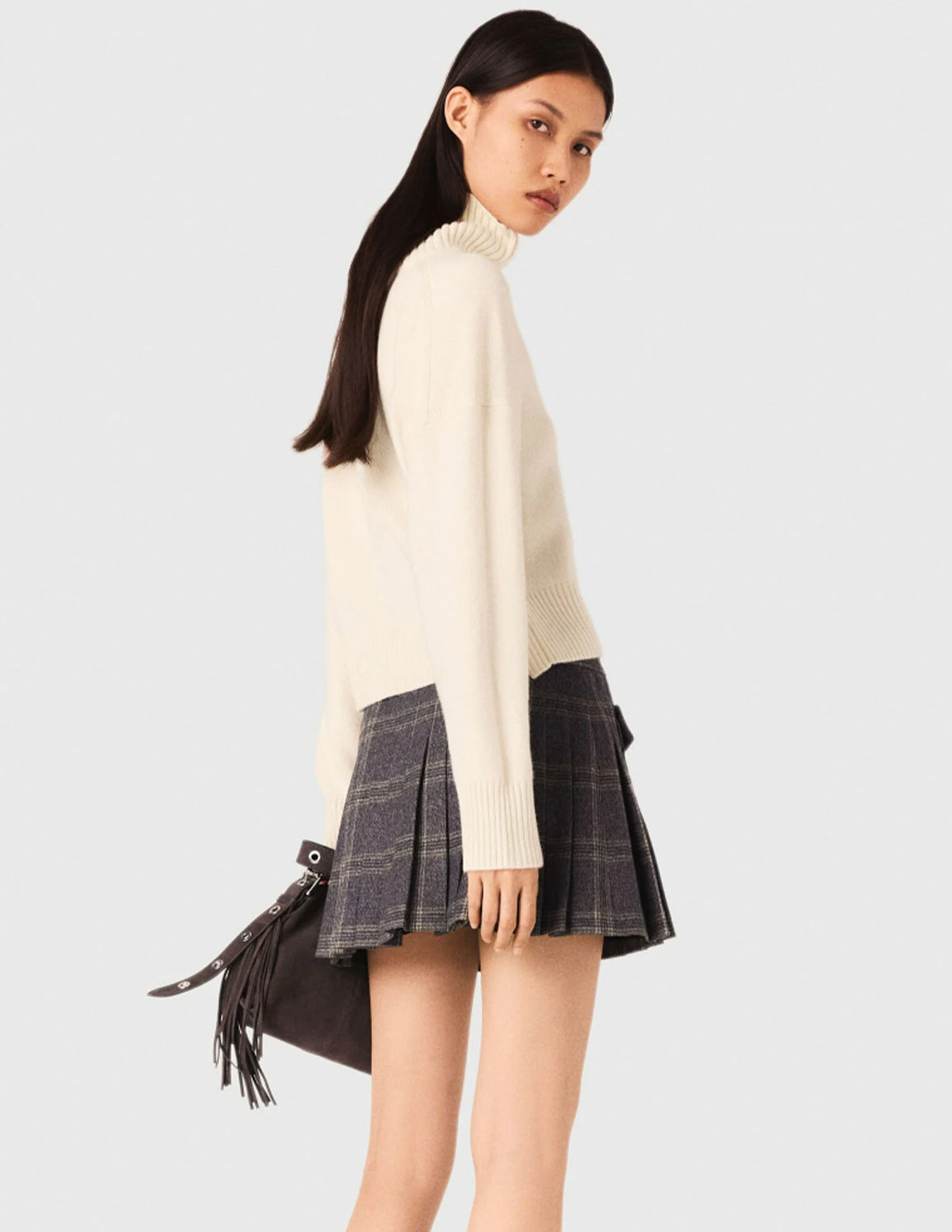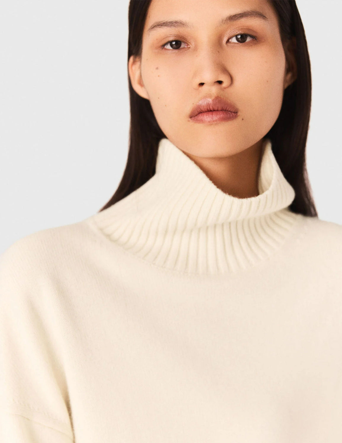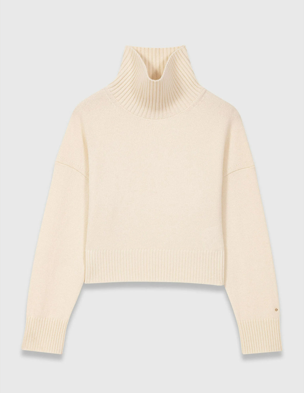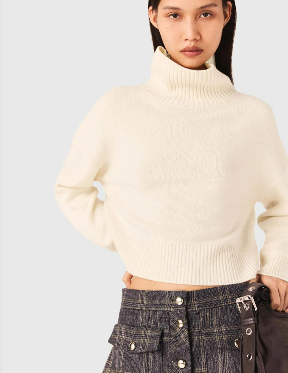 • This short jumper in soft knit combines comfort and style, with an enveloping high neck and a slightly oversized fit. Wear it over a short skirt or high-waisted trousers to reinvent the balance.