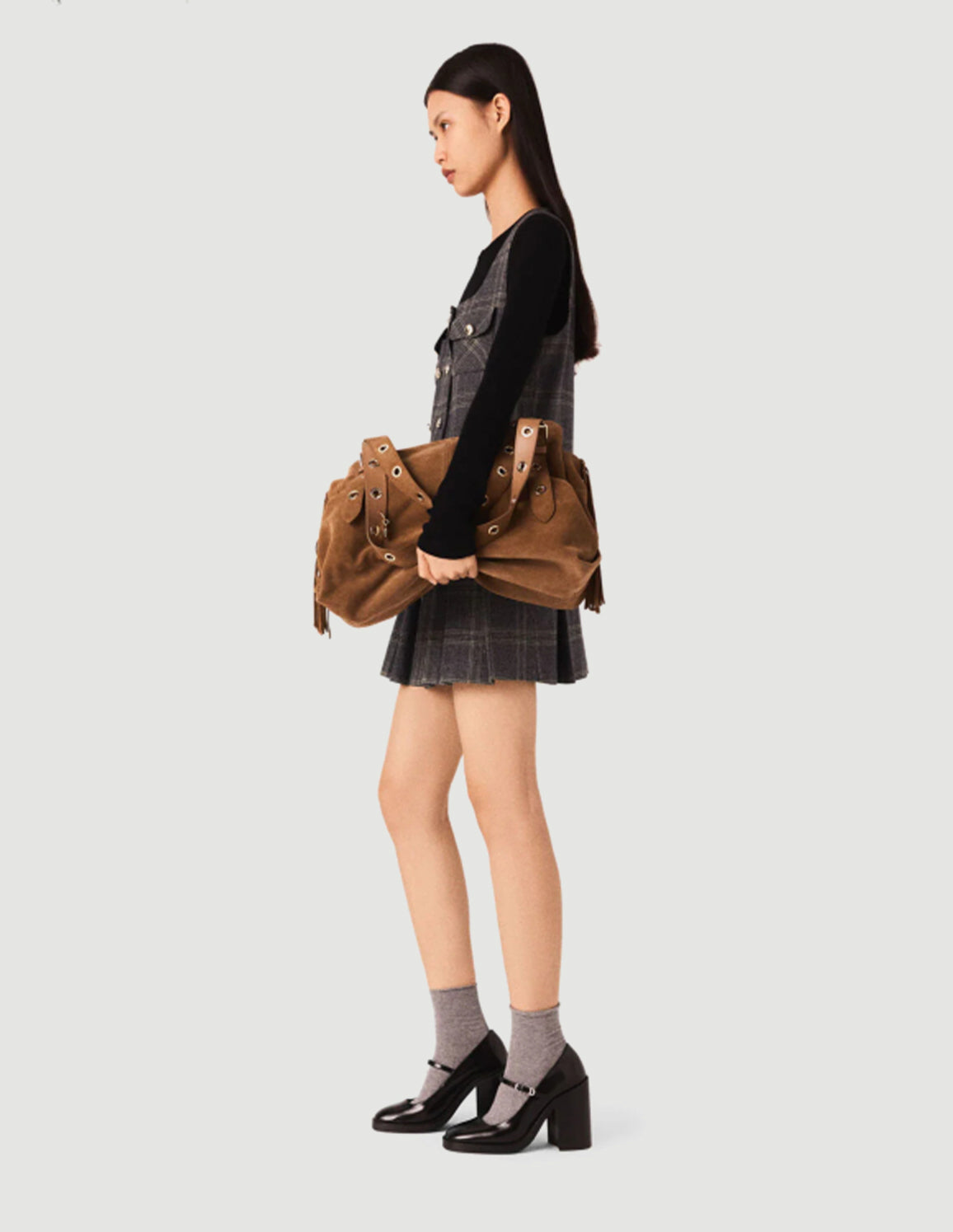 • This check dress focuses on a graphic construction: a rounded neckline, buttoned pockets and a pleated skirt for a nod to the school uniform. It can be worn on its own, or layered with a long-sleeved knit, and accessorised with statement pieces like heeled Mary Janes and a fringed bag.