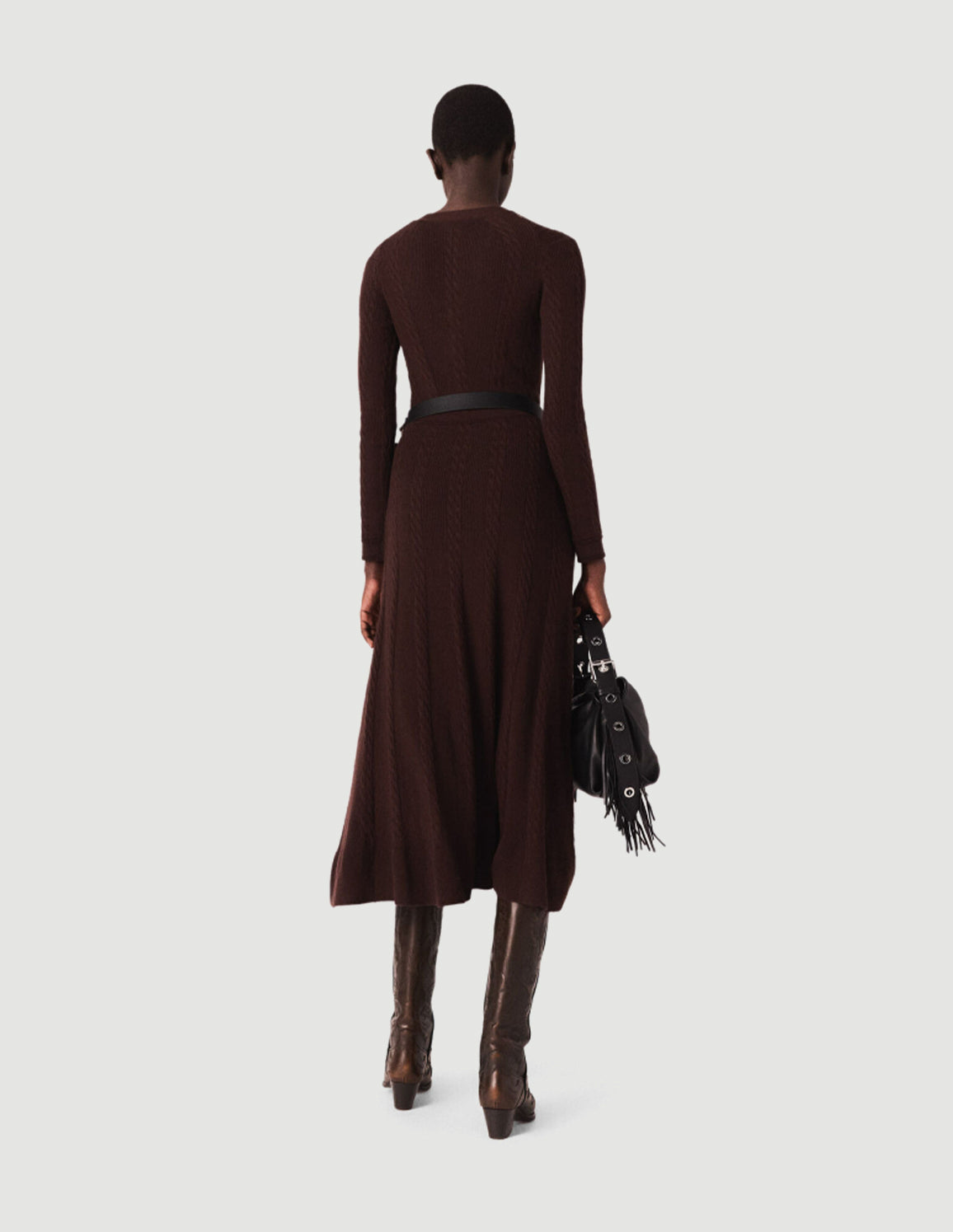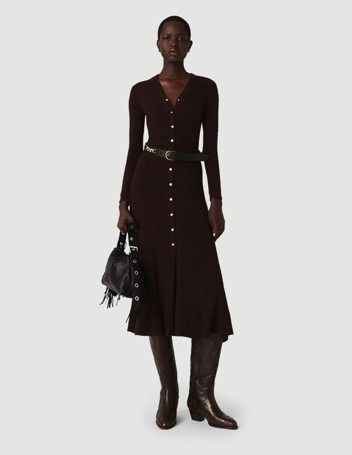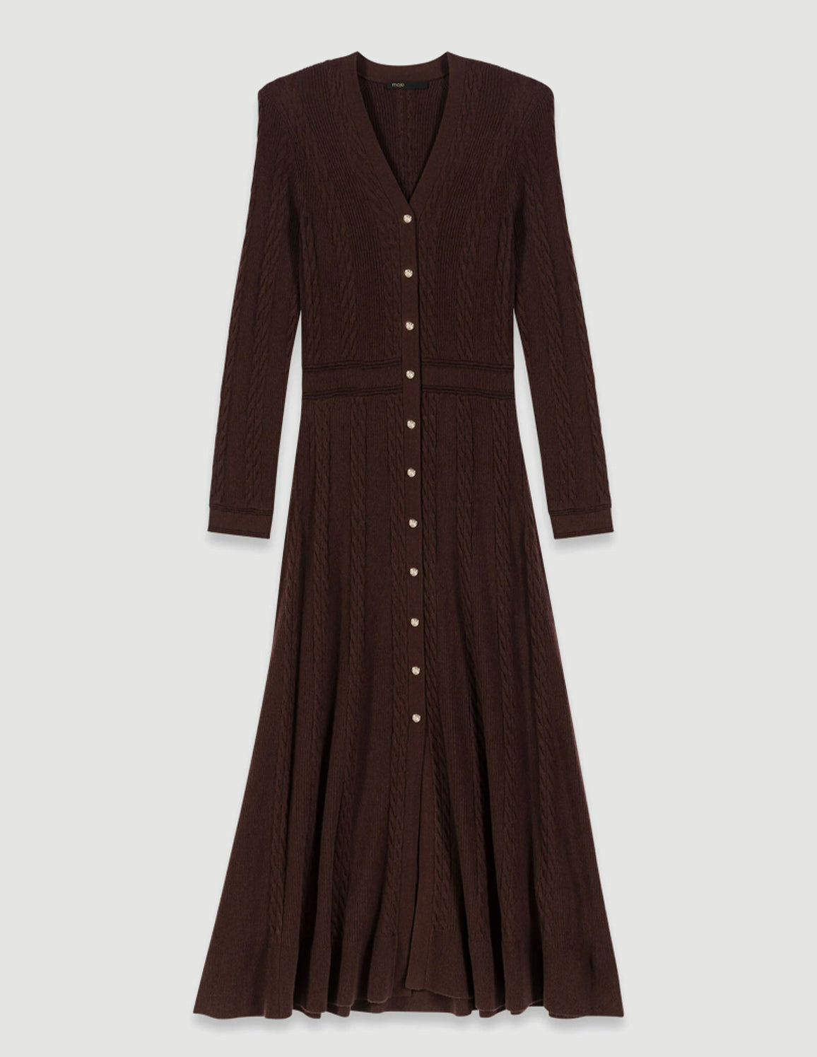 • A knit dress that strikes the perfect balance between warmth, texture and structure. Knitted from a soft cable knit, it creates a feminine and comfortable silhouette, with its defined waist and flared hem. Gold buttons add a precious touch to the V-neckline, balancing retro simplicity with metropolitan modernity.