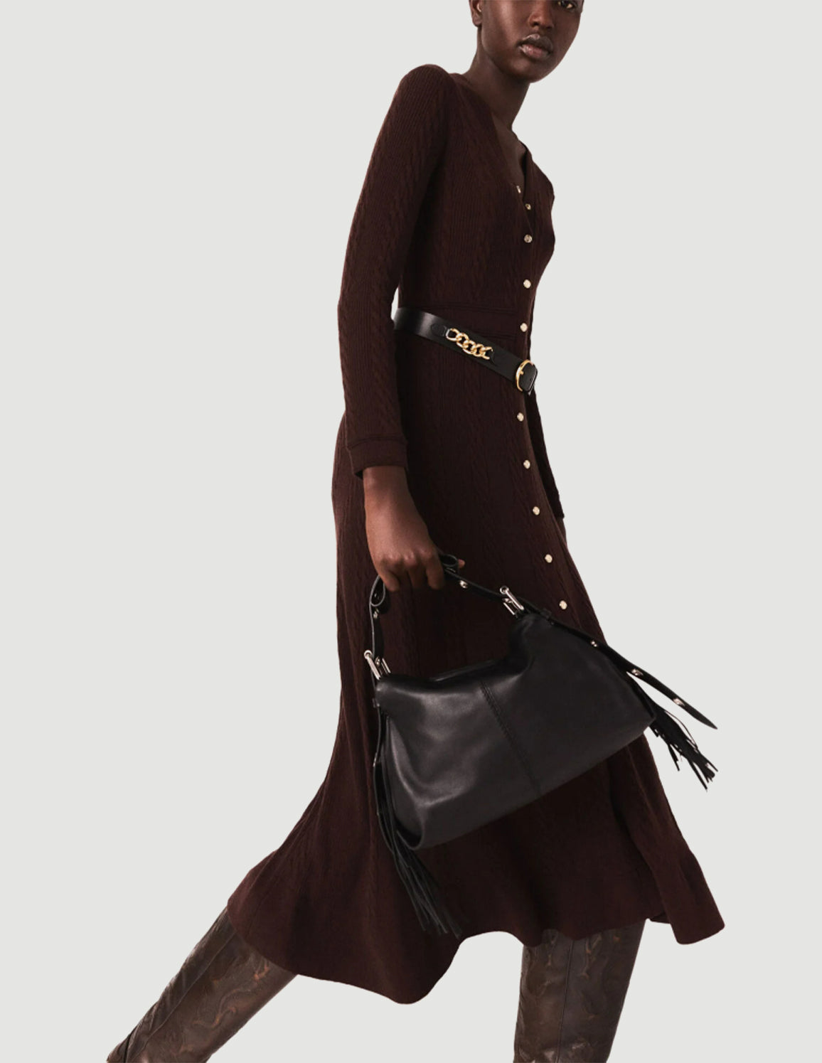 • Wear with a wide belt with a jewelled buckle to accentuate the waist, textured high boots and a fringed bag for a trendy winter look.