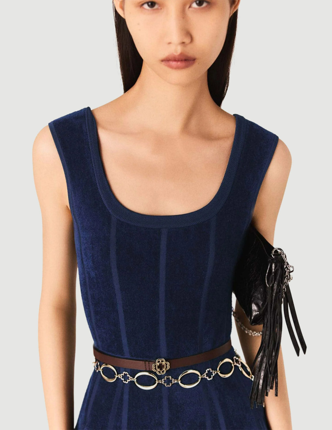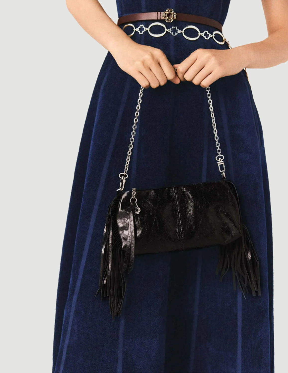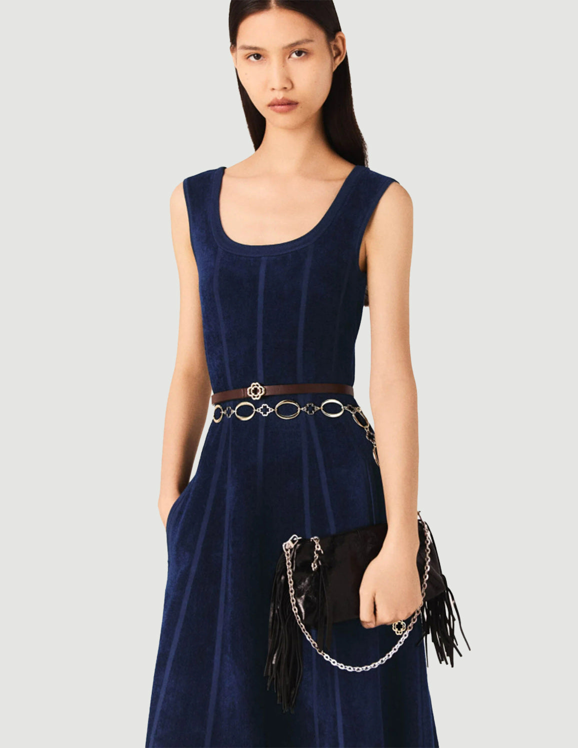• To accentuate the waist, play with layering belts: metal links, fine chains or discreet charms. On your feet, a pair of pointed pumps will complete this smart silhouette.