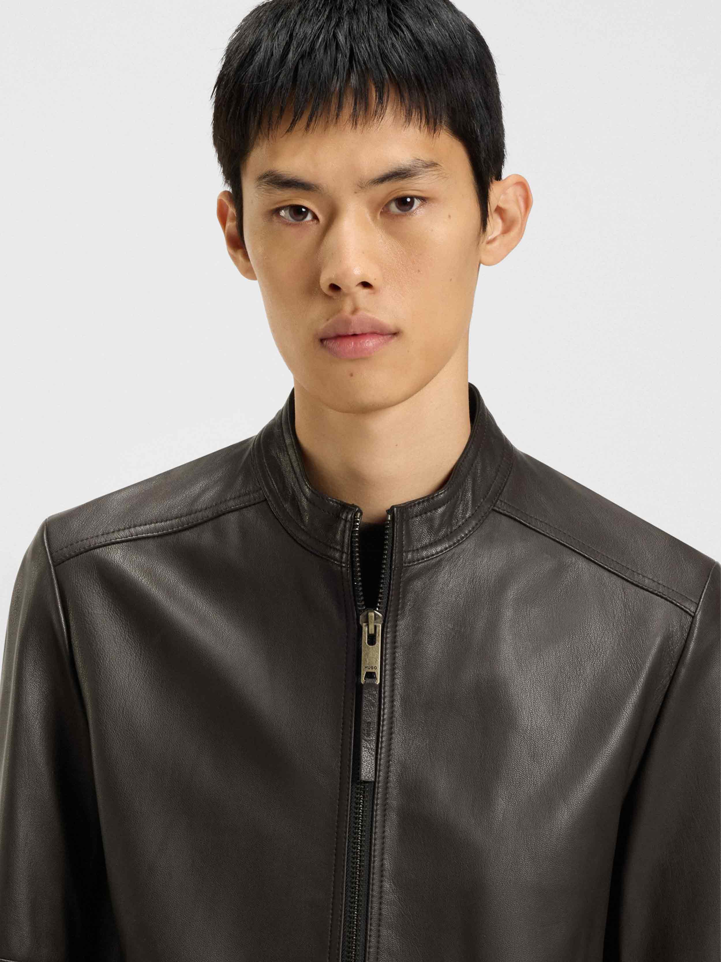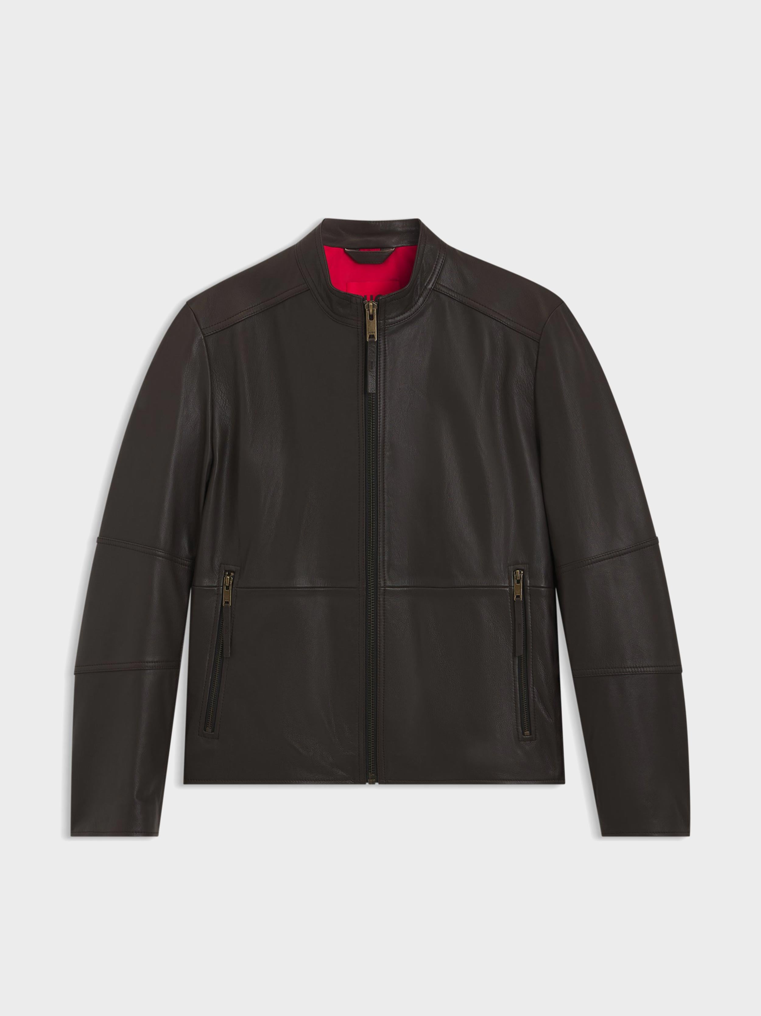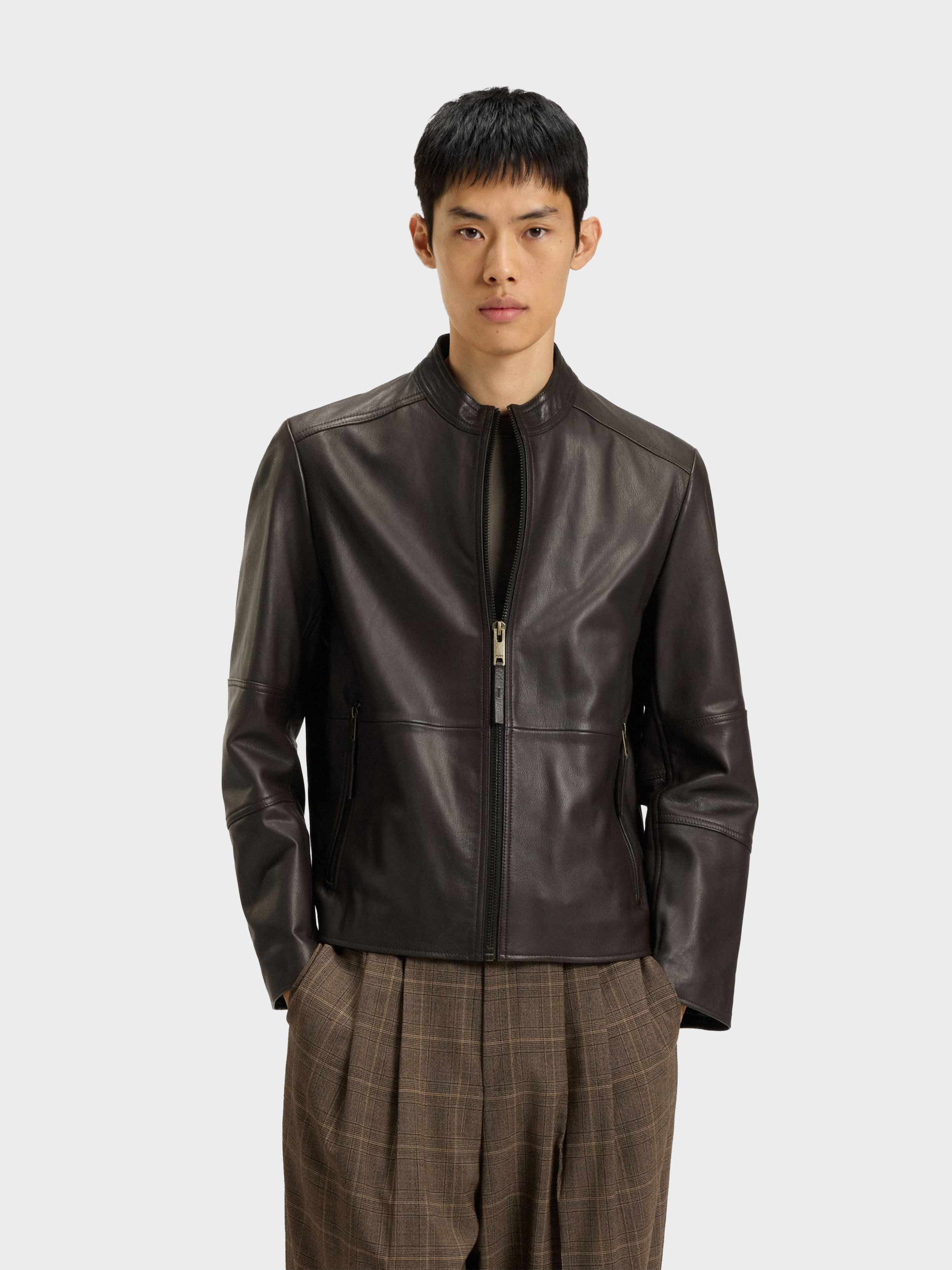 • clean racer leather jacket / slim fit / goat leather / stand collar / zip closure side entry zip pockets / inside zip pockets / fully lined / signature leather jacket for any occation from business to casual