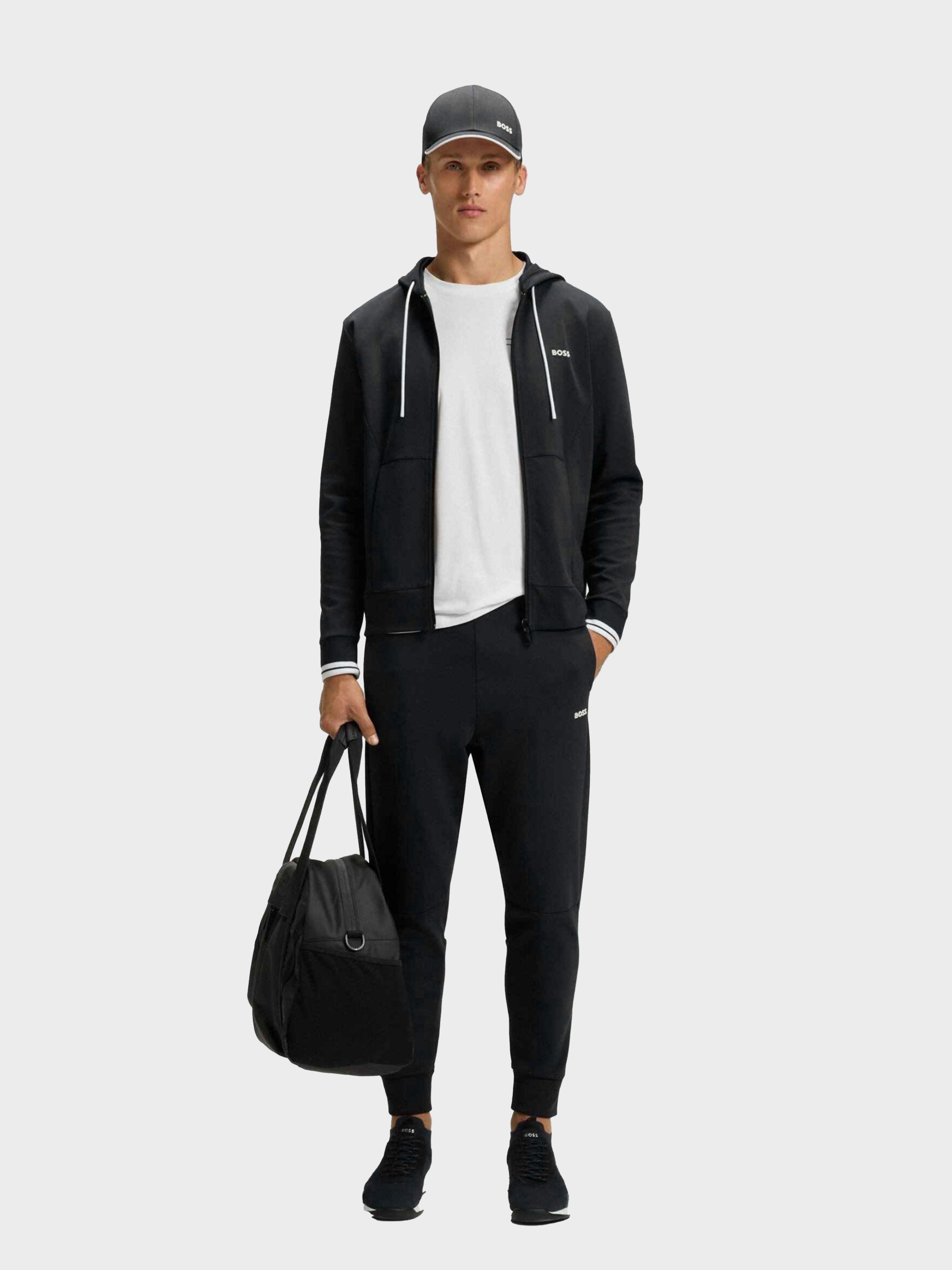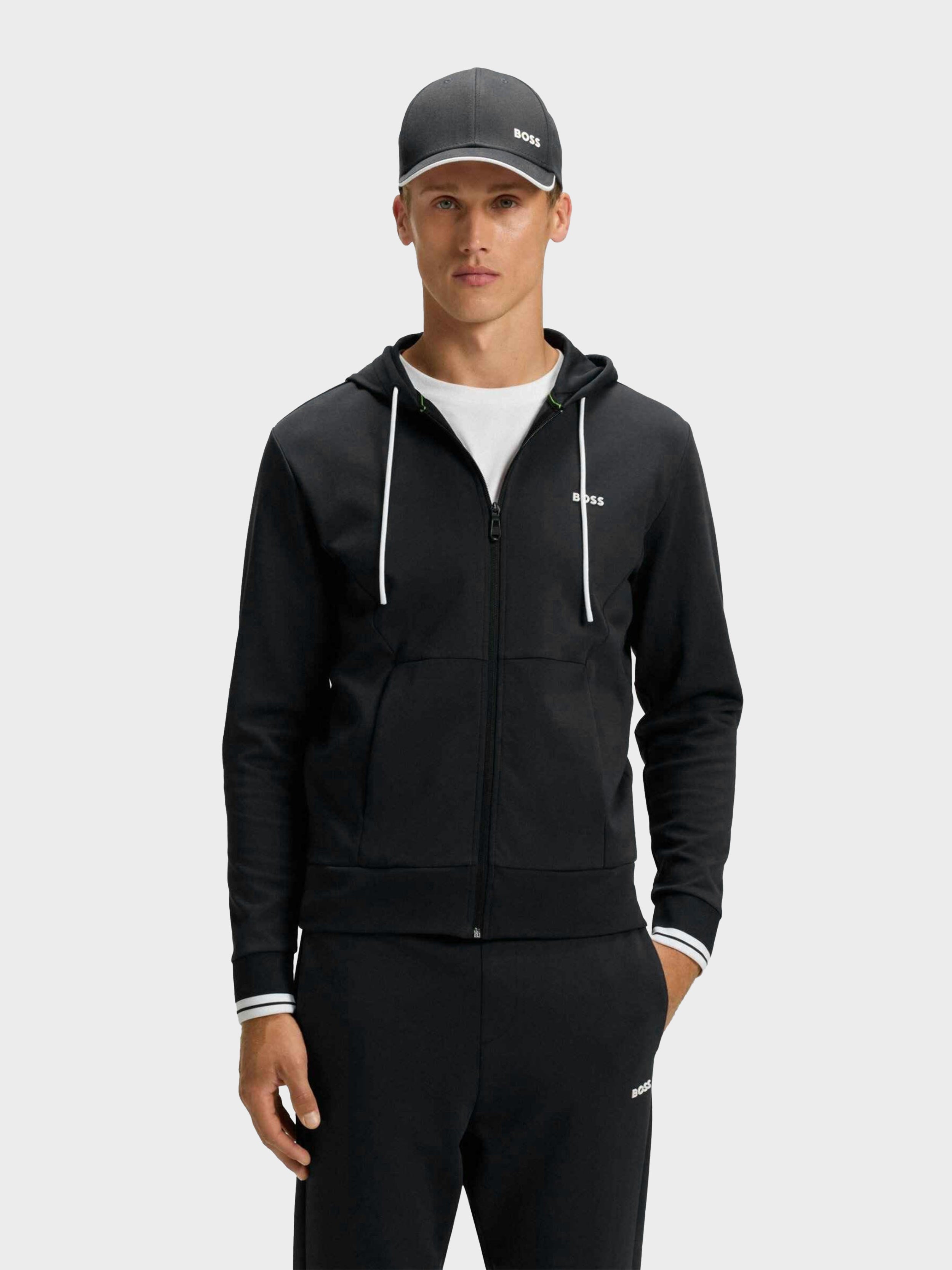 • In a straight fit for easy layering, this BOSS Menswear zip-up hoodie is cut in a stretch-cotton. Stripe details and molded logo.