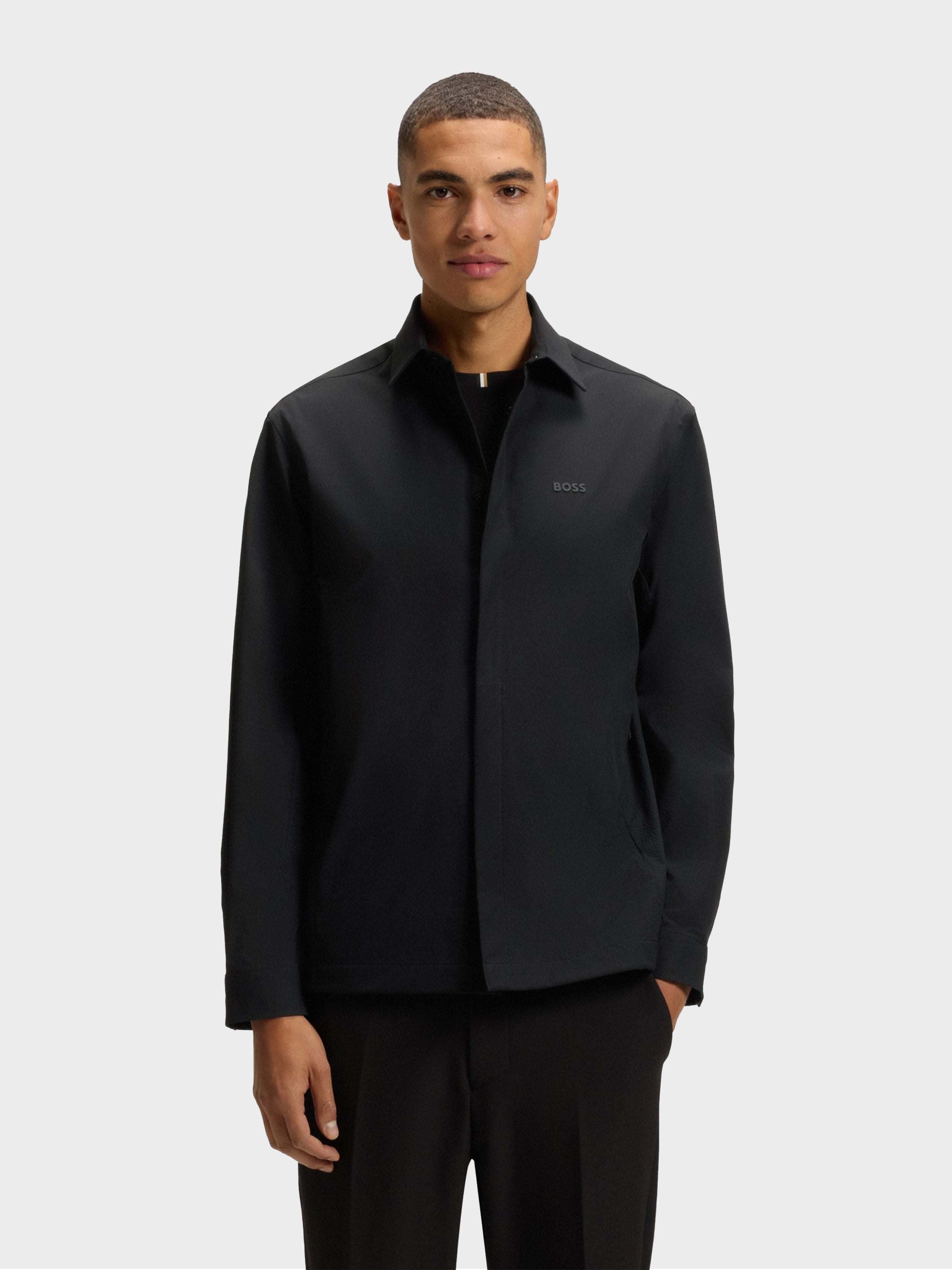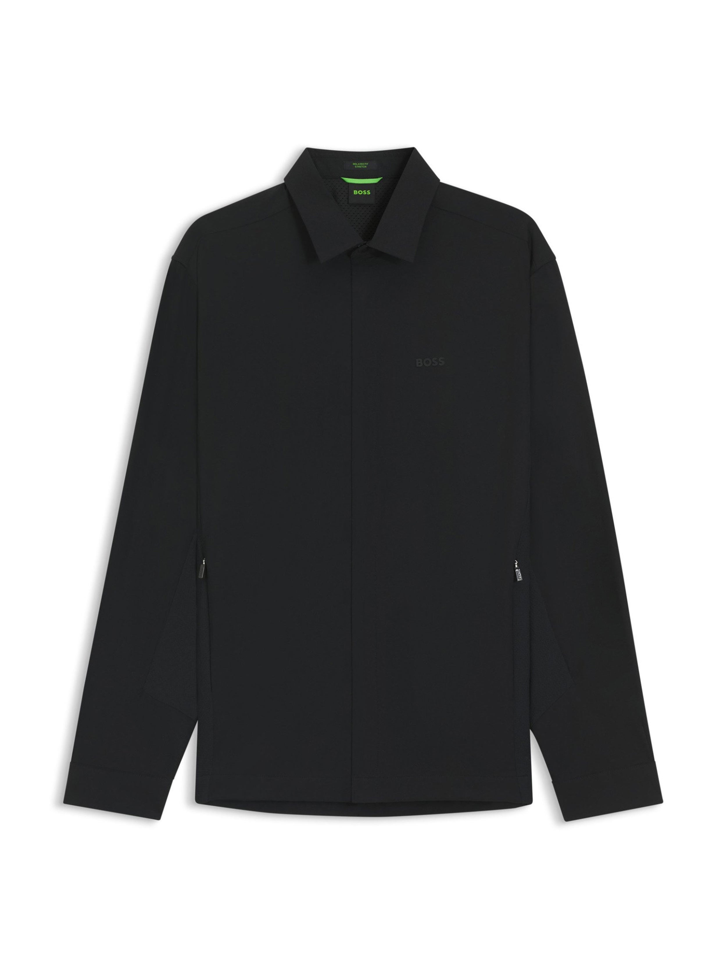 • With decorative reflective details, this relaxed BOSS Menswear overshirt is made in stretchy water-repellent fabric. Flexible underarm inserts. Open yoke with ventilating mesh lining.