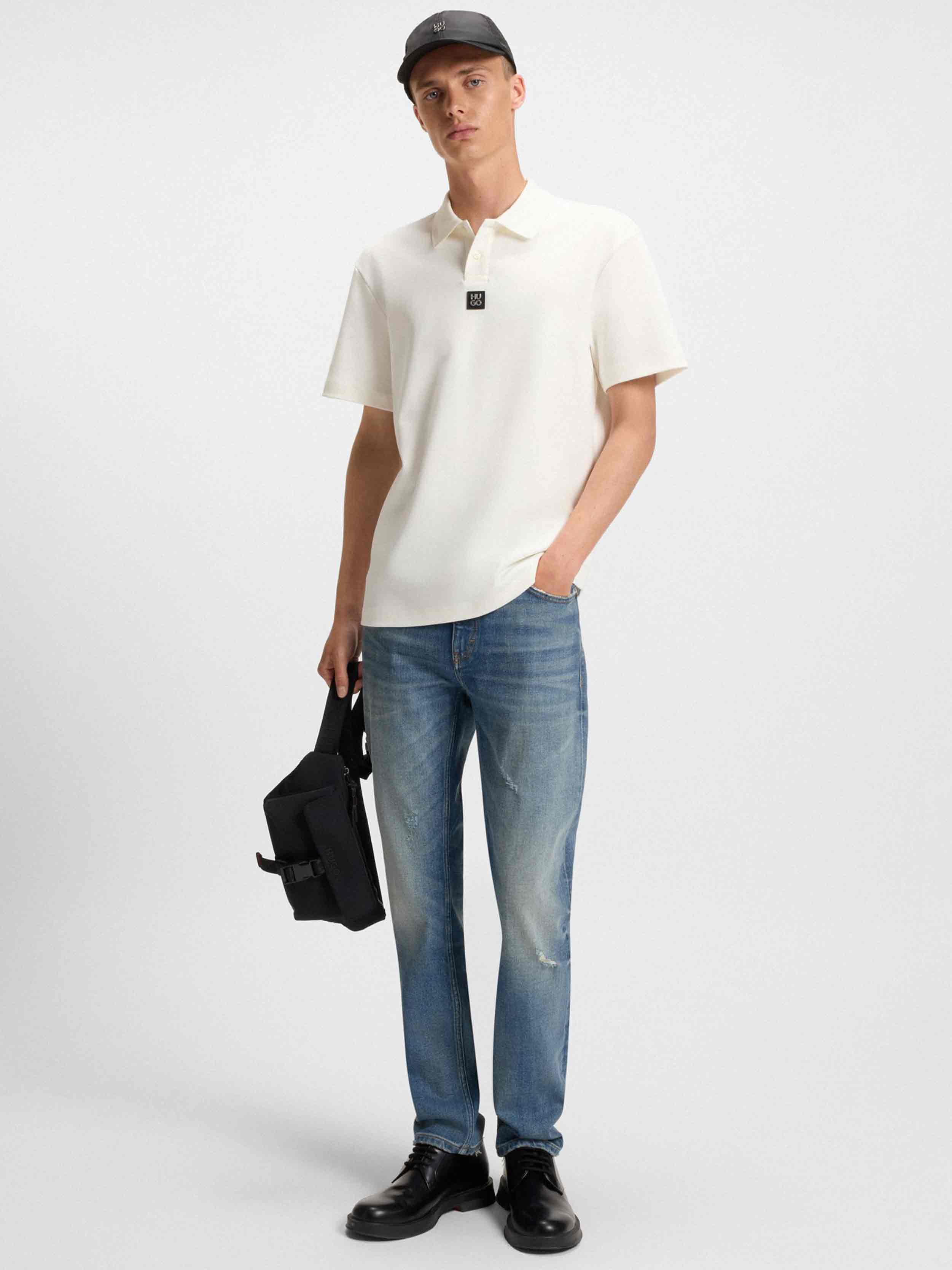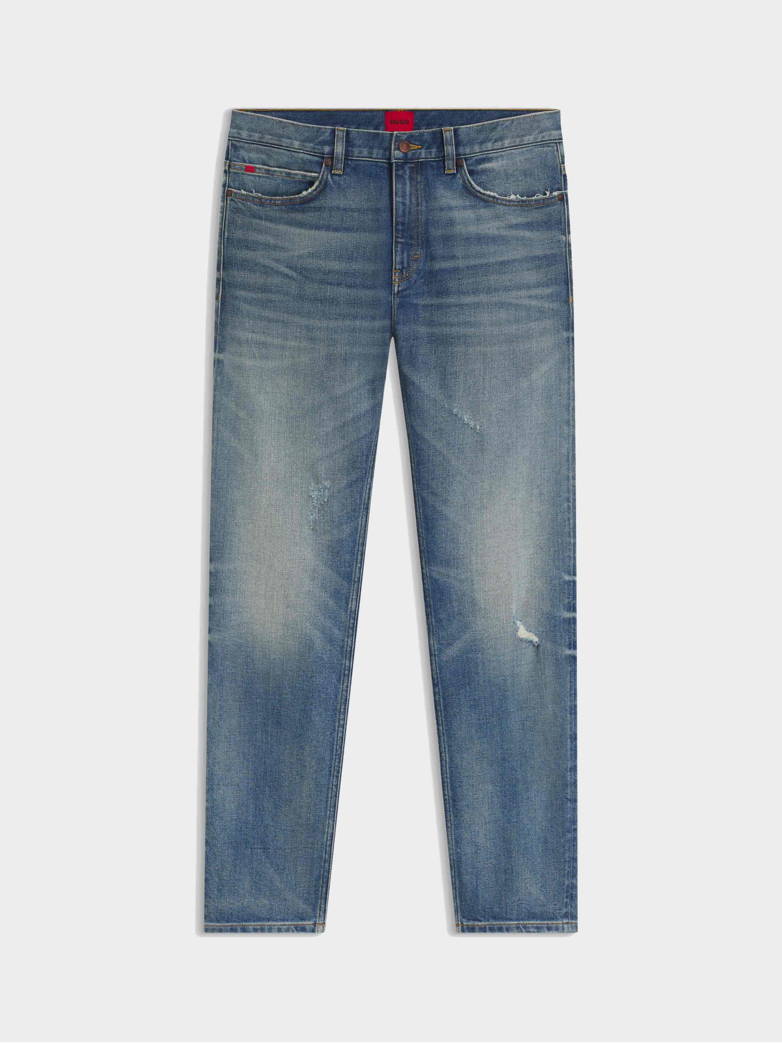 • In aqua-blue denim with stretch and distressing, these HUGO Menswear jeans will quickly become a casual favourite. Slim fit with a straight leg. This product contains at least 60% better raw materials. This piece is made with at least 60% cotton derived from regenerative agriculture. Regenerative agriculture prioritizes the preservation and restoration of natural environments, aiming to enhance biodiversity, maintain water quality, and improve soil health.