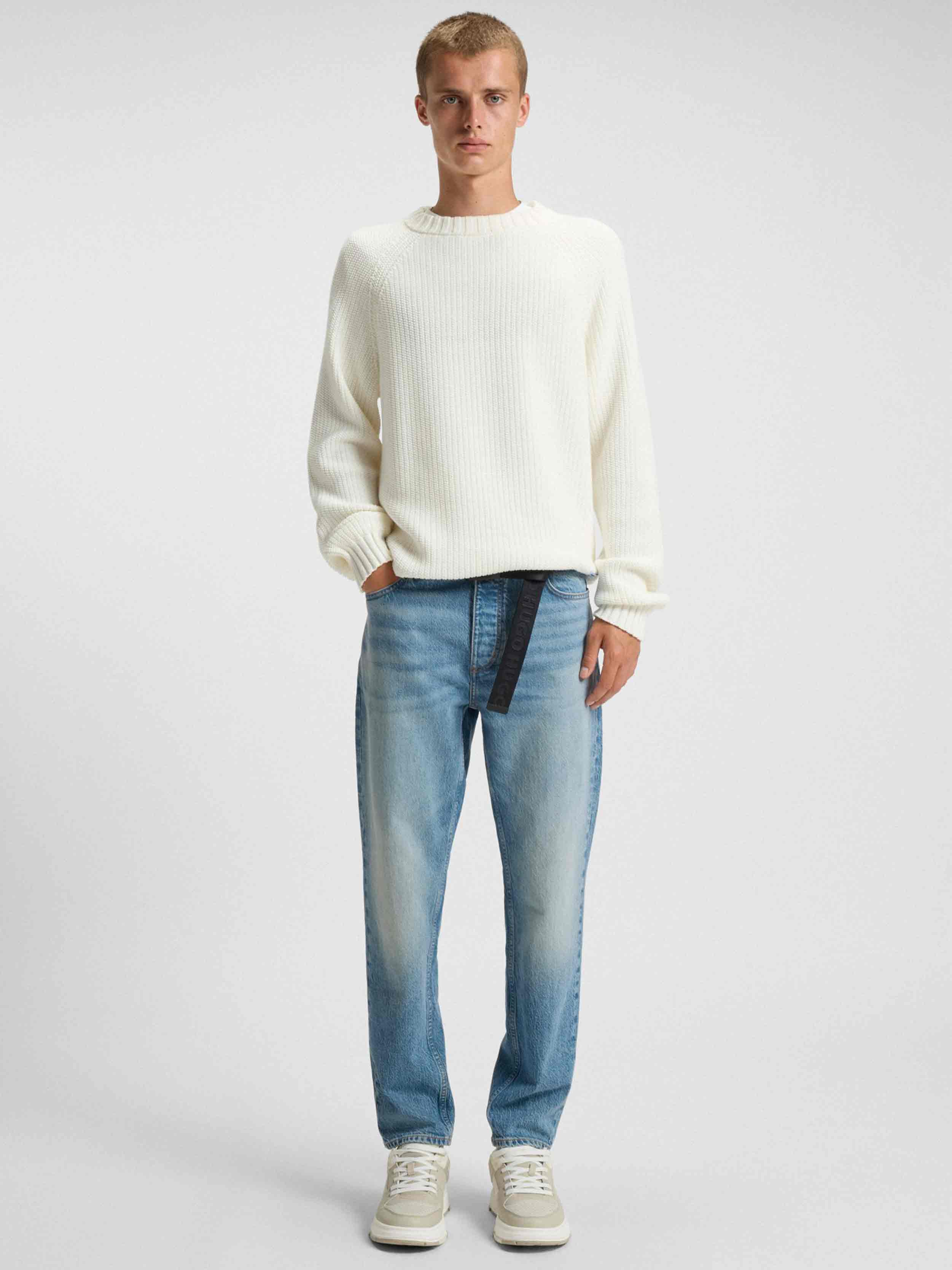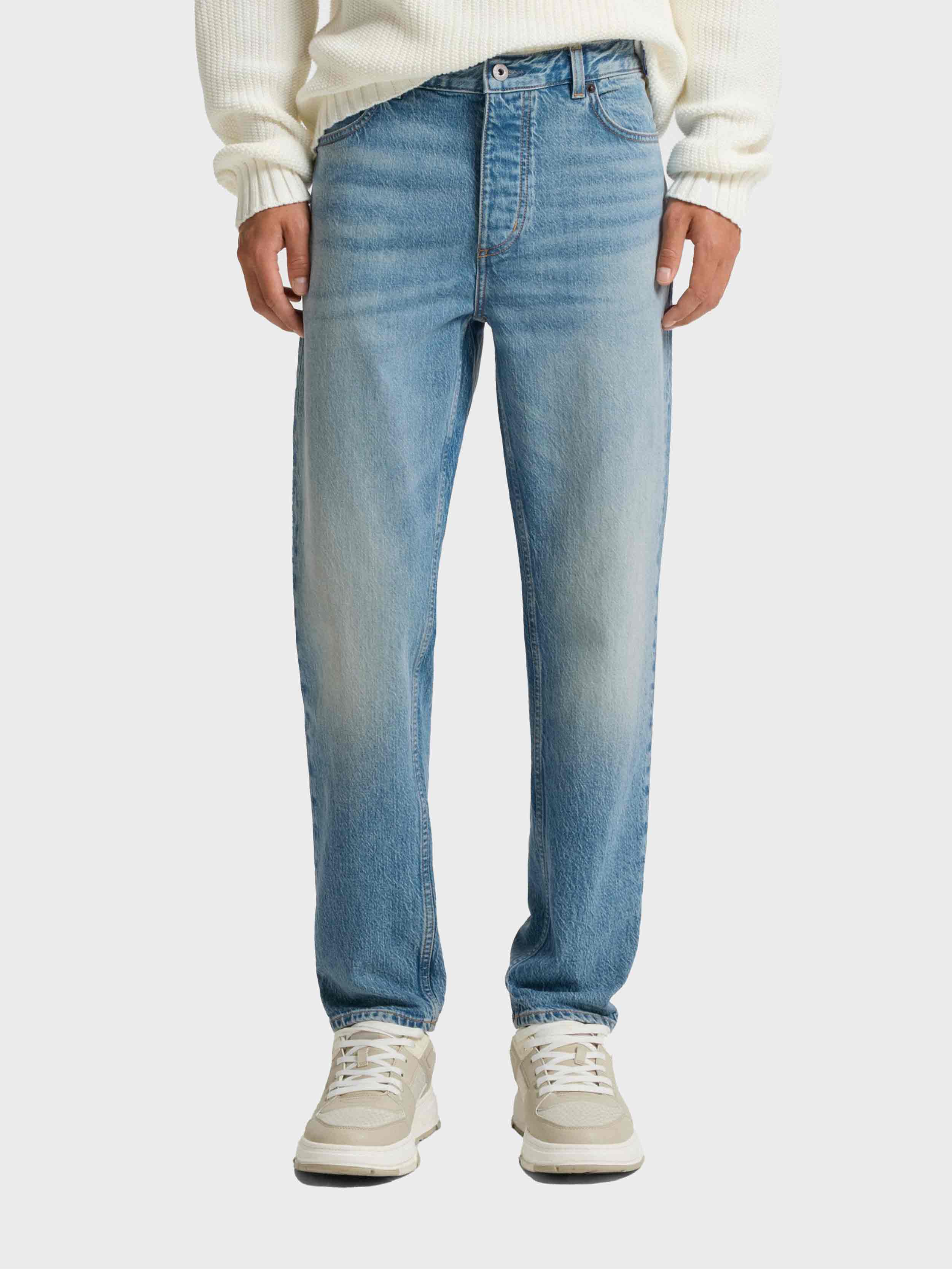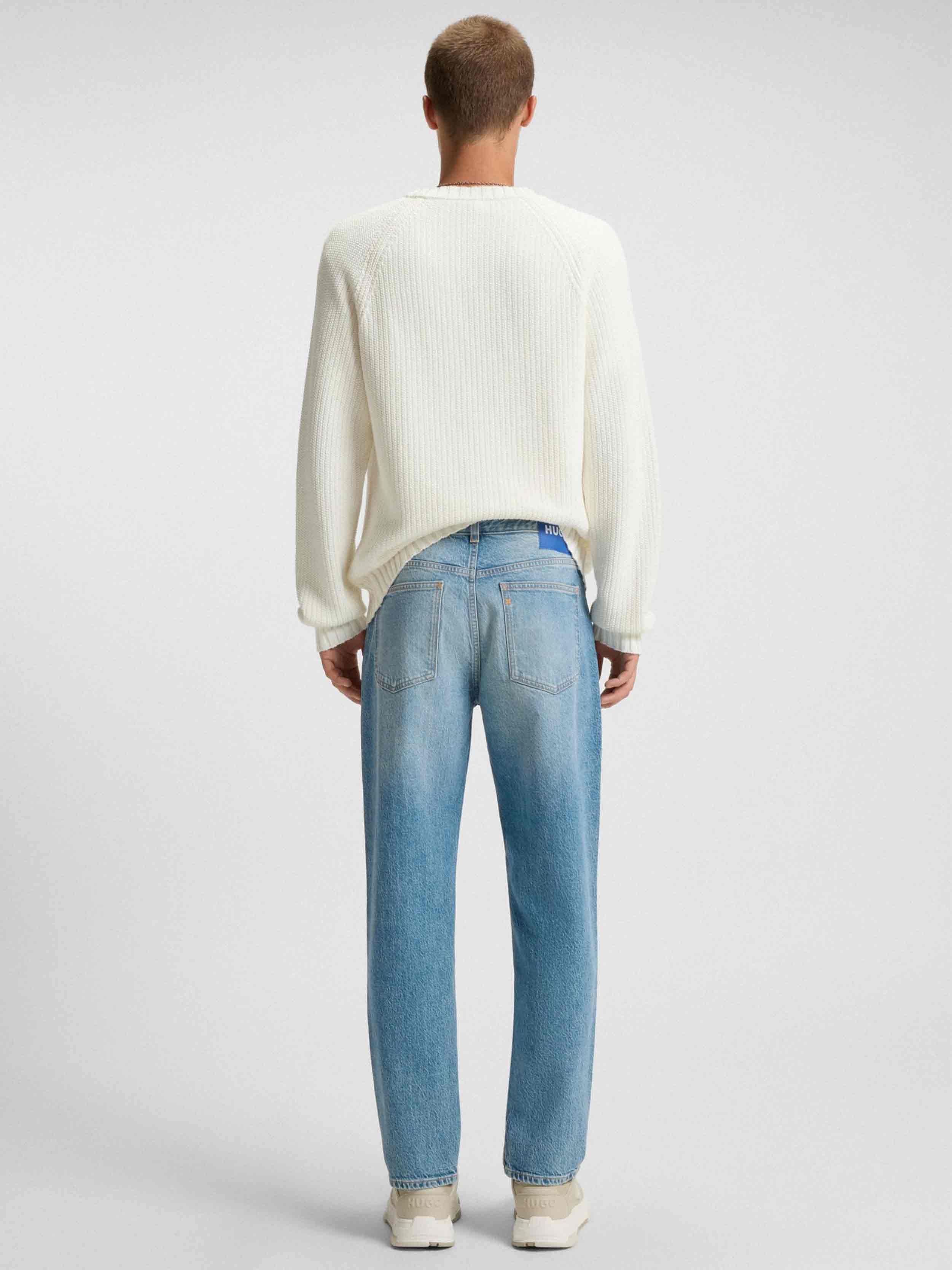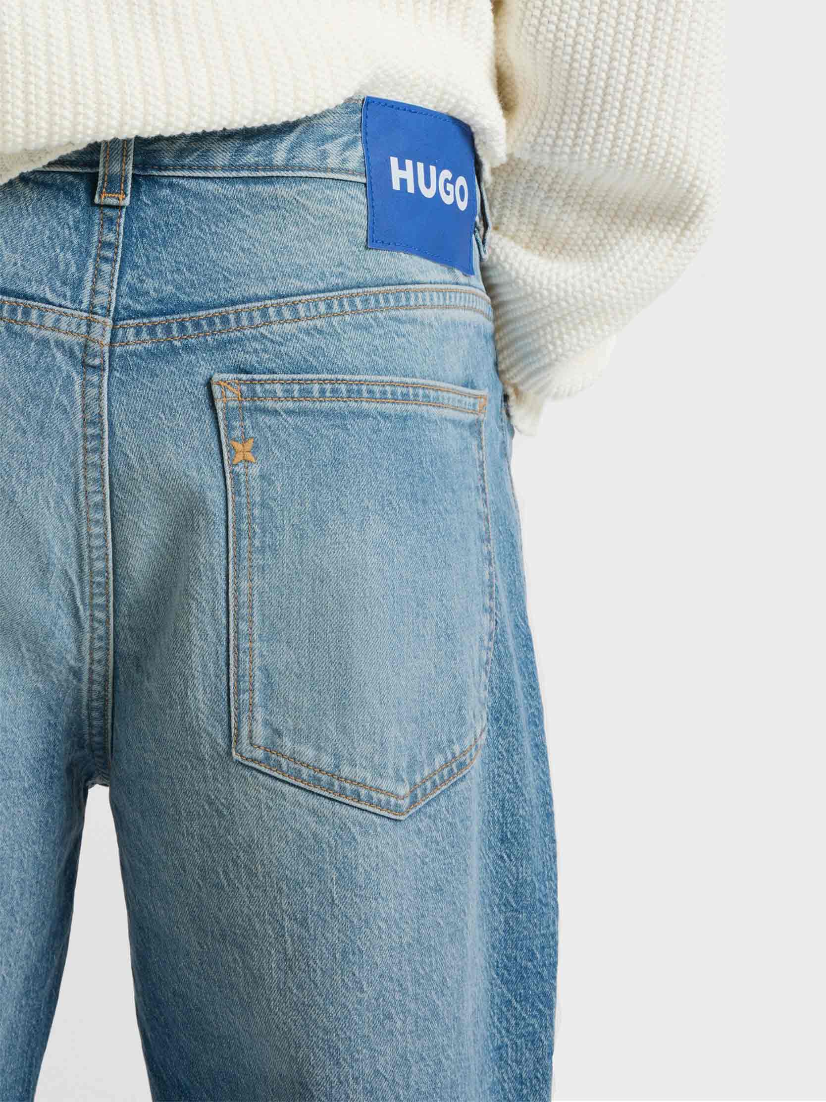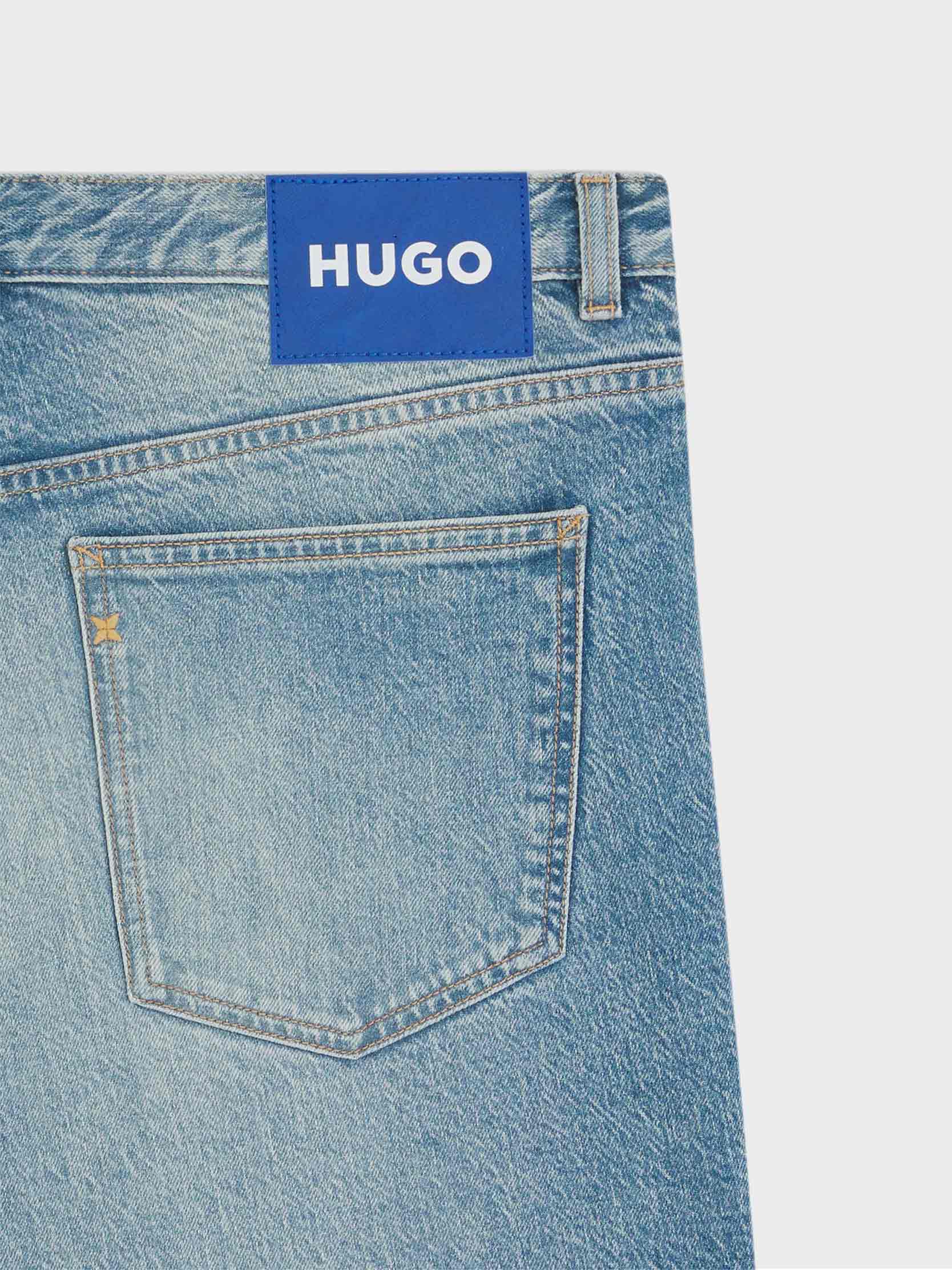 • In shape-retaining stretch denim, these tapered-fit HUGO Menswear jeans have a modern green cast on blue. Authentic whiskering and fading.