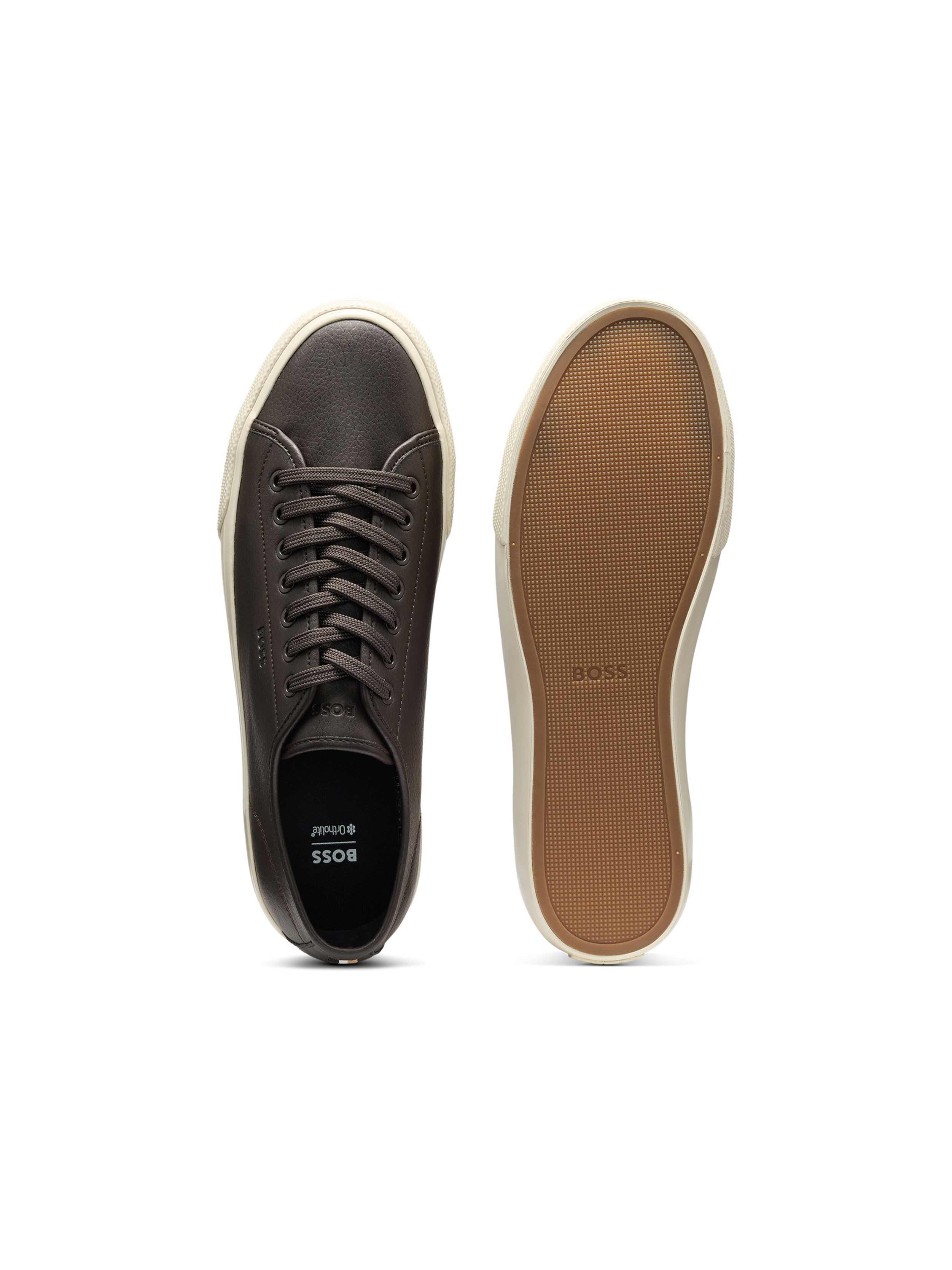 • With their sporty rubber sole and low profile, these BOSS Menswear trainers will complete any outfit. Uppers in grained synthetic coated fabric. Embossed logo detail. Synthetic coated fabric, sometimes referred to as faux leather, is a fabric designed to resemble real leather, and/or display a matte, glossy, smooth, or textured, coated appearance.
