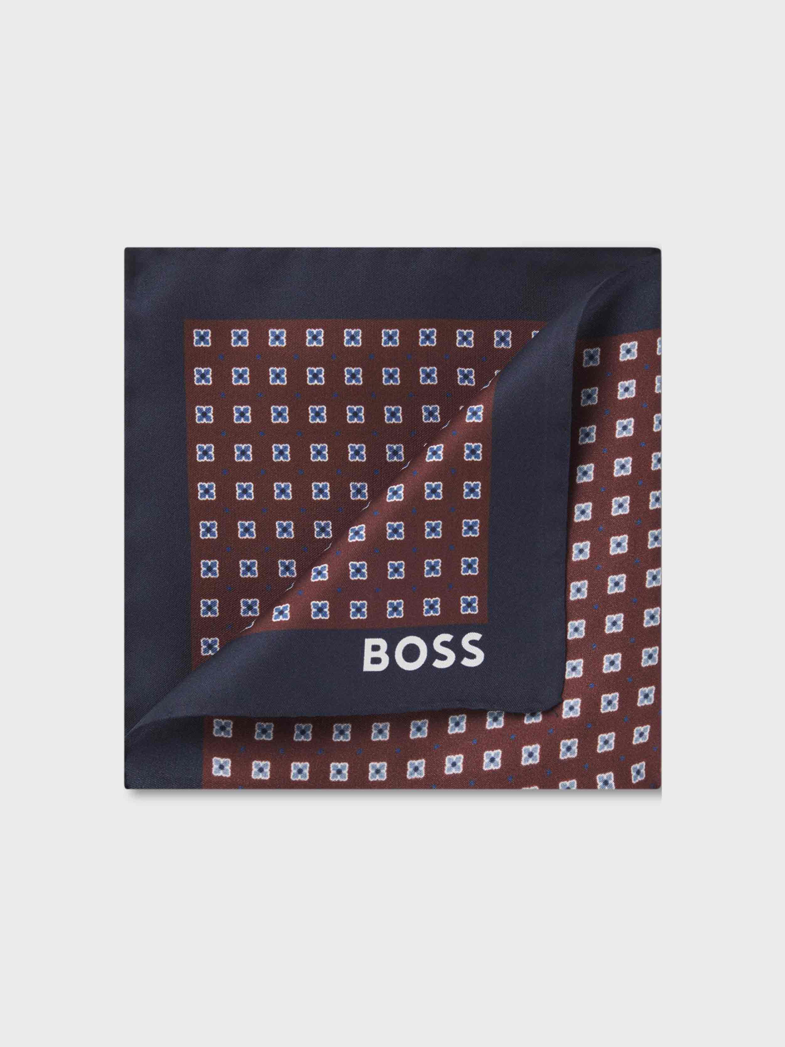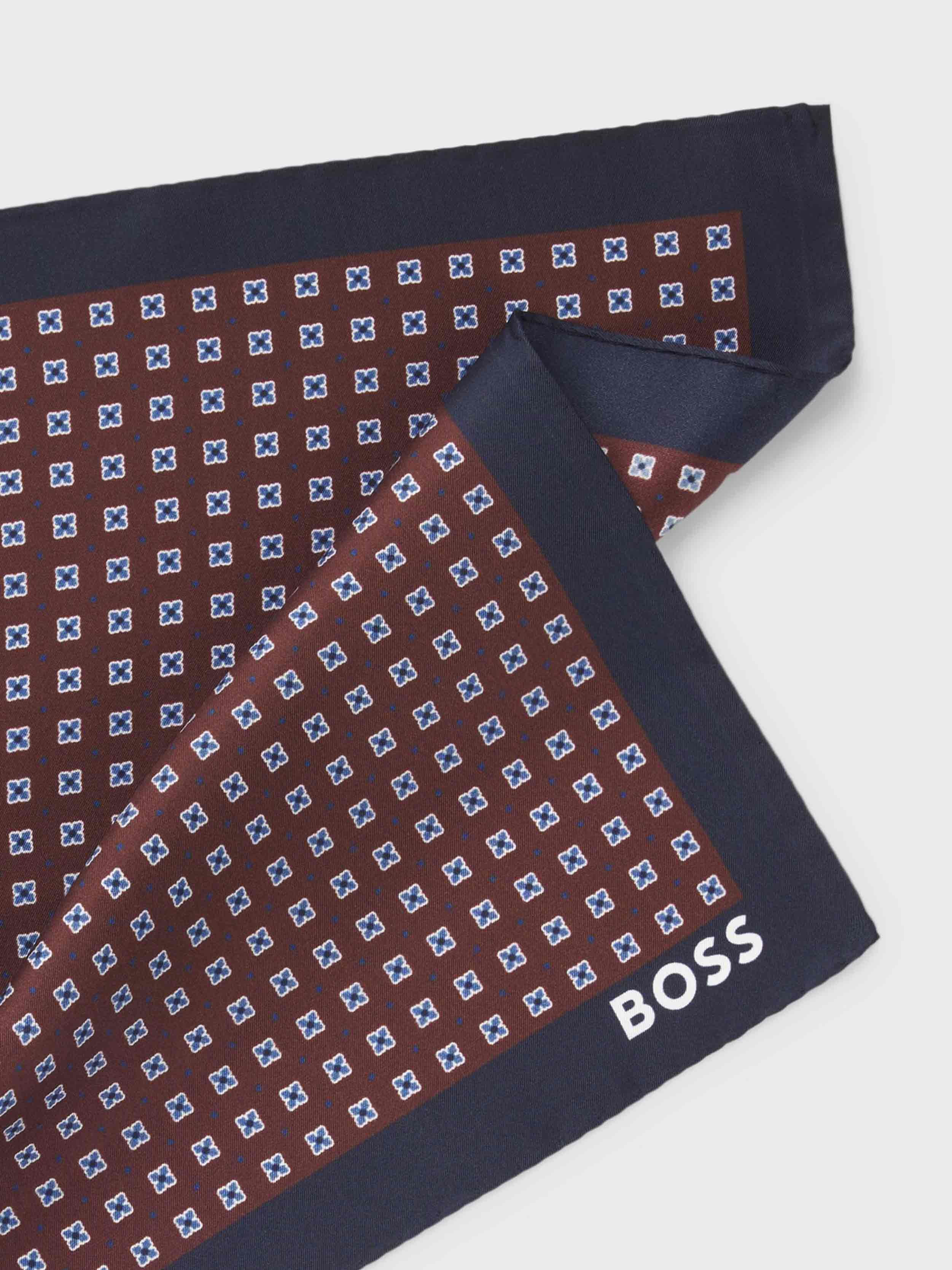 • With a solid border framing a creative digital print, this BOSS Menswear pocket square will add energy to formal looks.