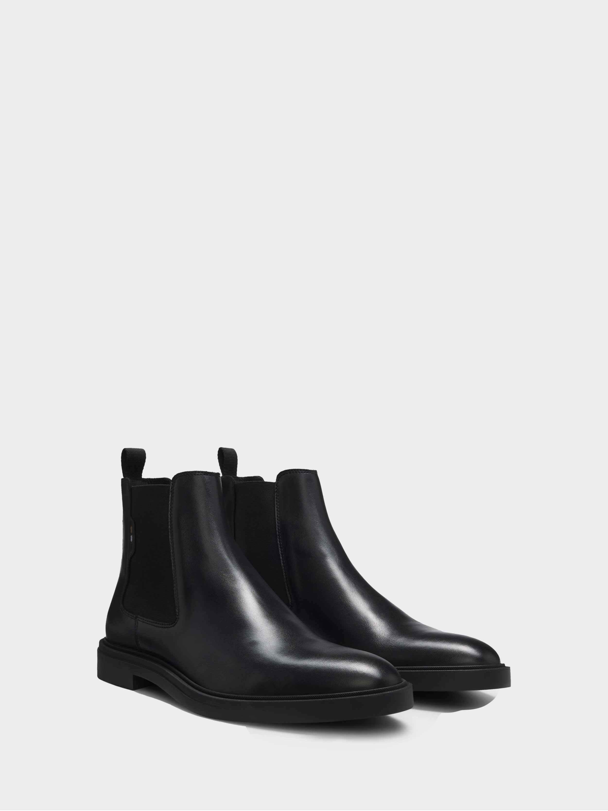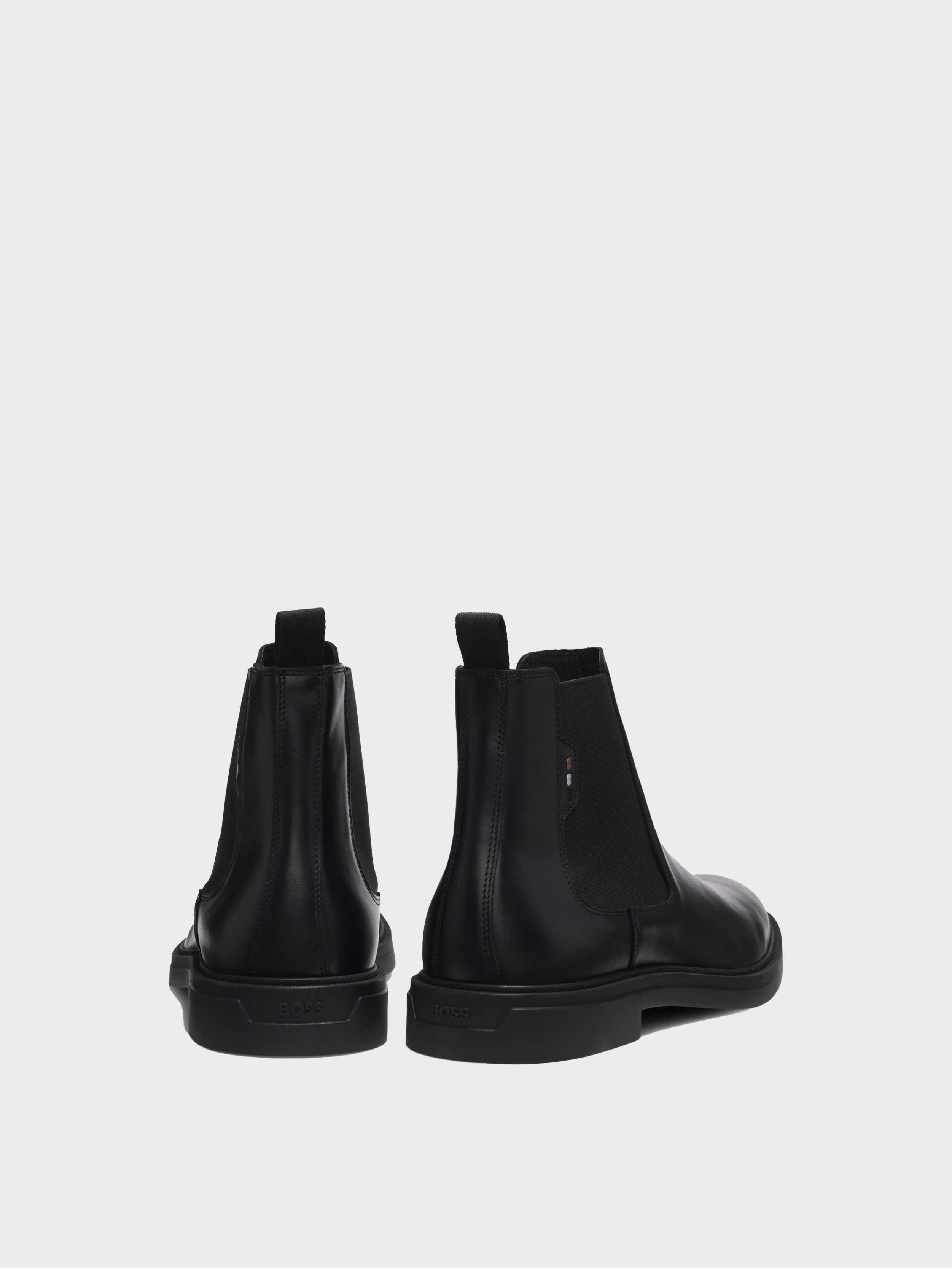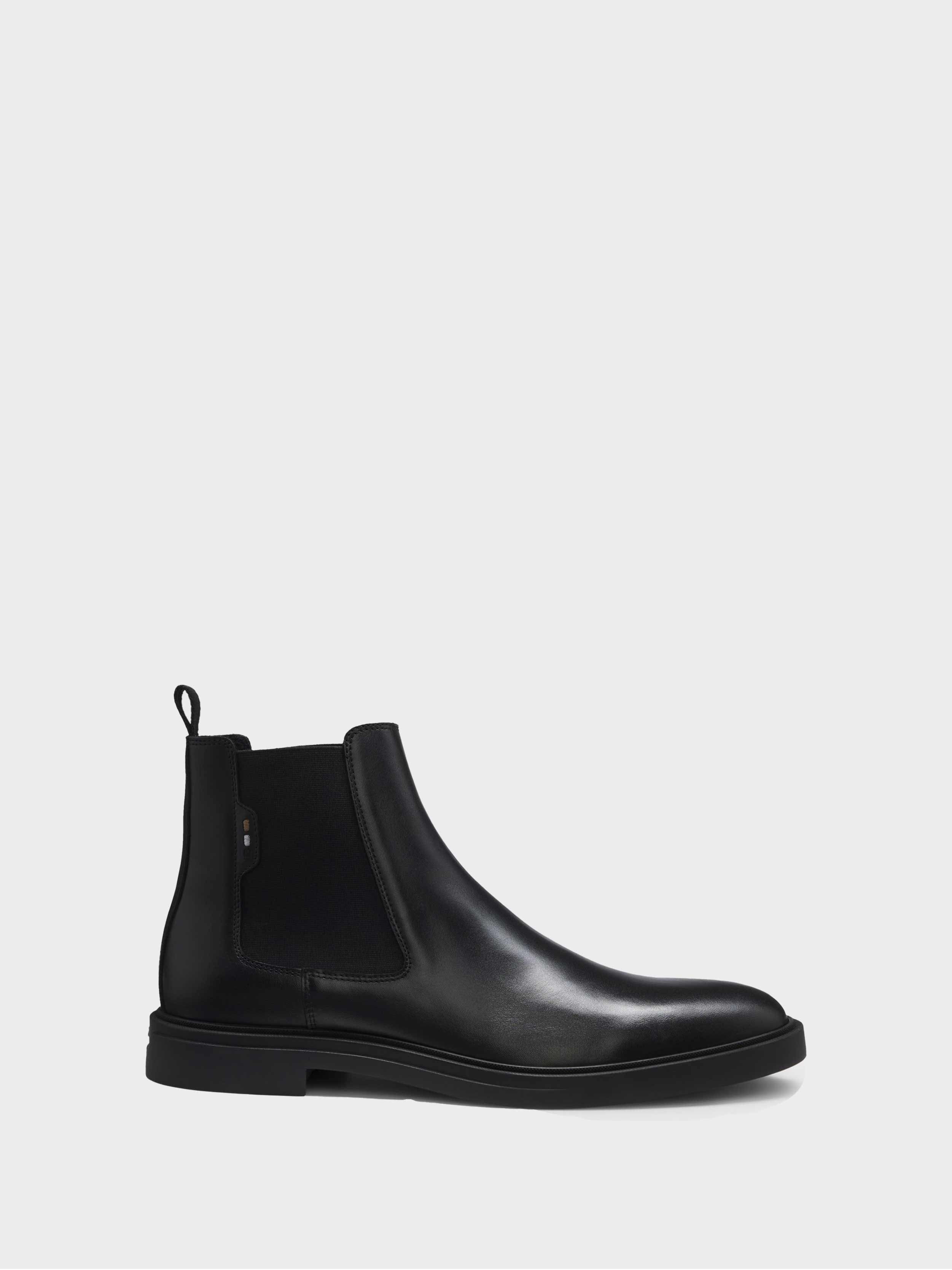 • With flexible side panels for a comfortable fit, these Chelsea boots carry the distinctive BOSS Menswear signature stripe. Rich leather uppers. Pull loops. This product contains at least 60% better raw materials. We continuously look for more responsible ways to produce and finish our products. A minimum of 60% of the leather used to make this product has been sourced from certified tanneries.