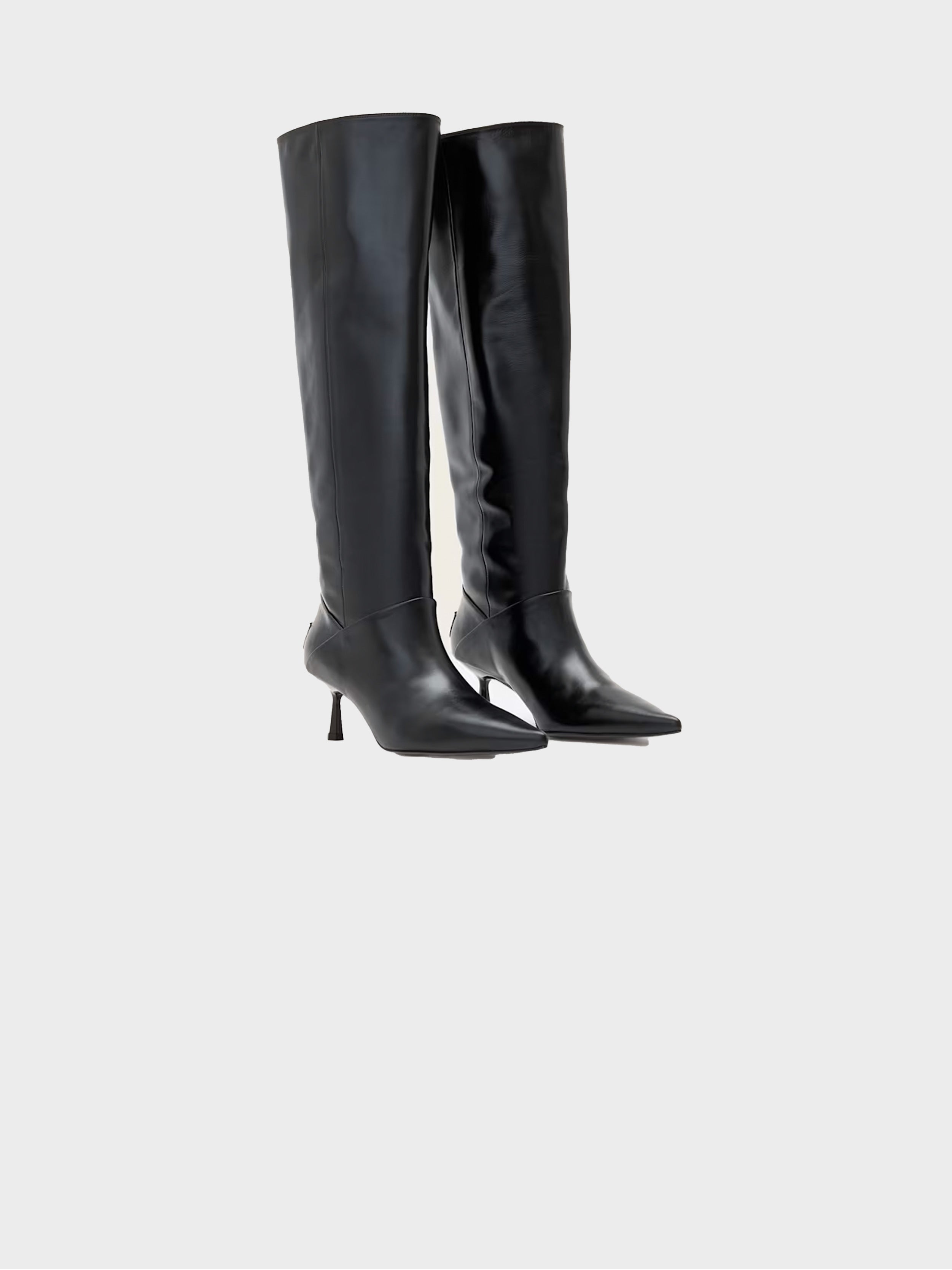 • Talk about versatile… check out the Odyssey Boots. Crafted from leather to a point-toe silhouette, you can wear this heeled pair two ways: knee high or folded over.