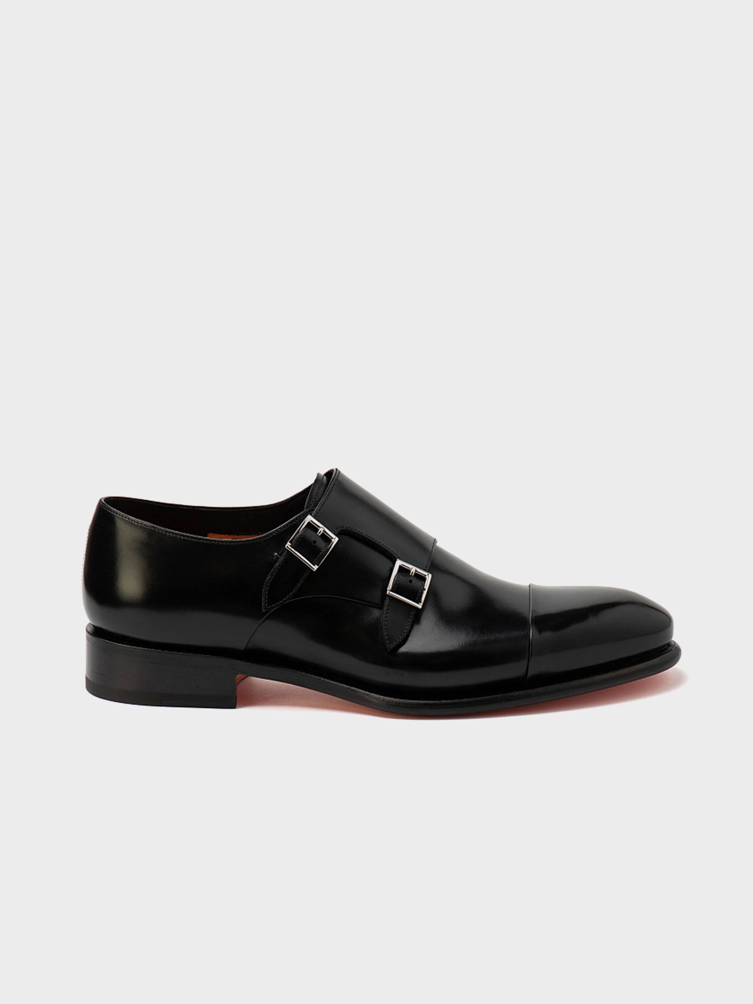 • The double-strap shoes are crafted from soft calfskin: the main part is made of a soft matte finish, and the cut-off toe is made of a polished glossy finish.