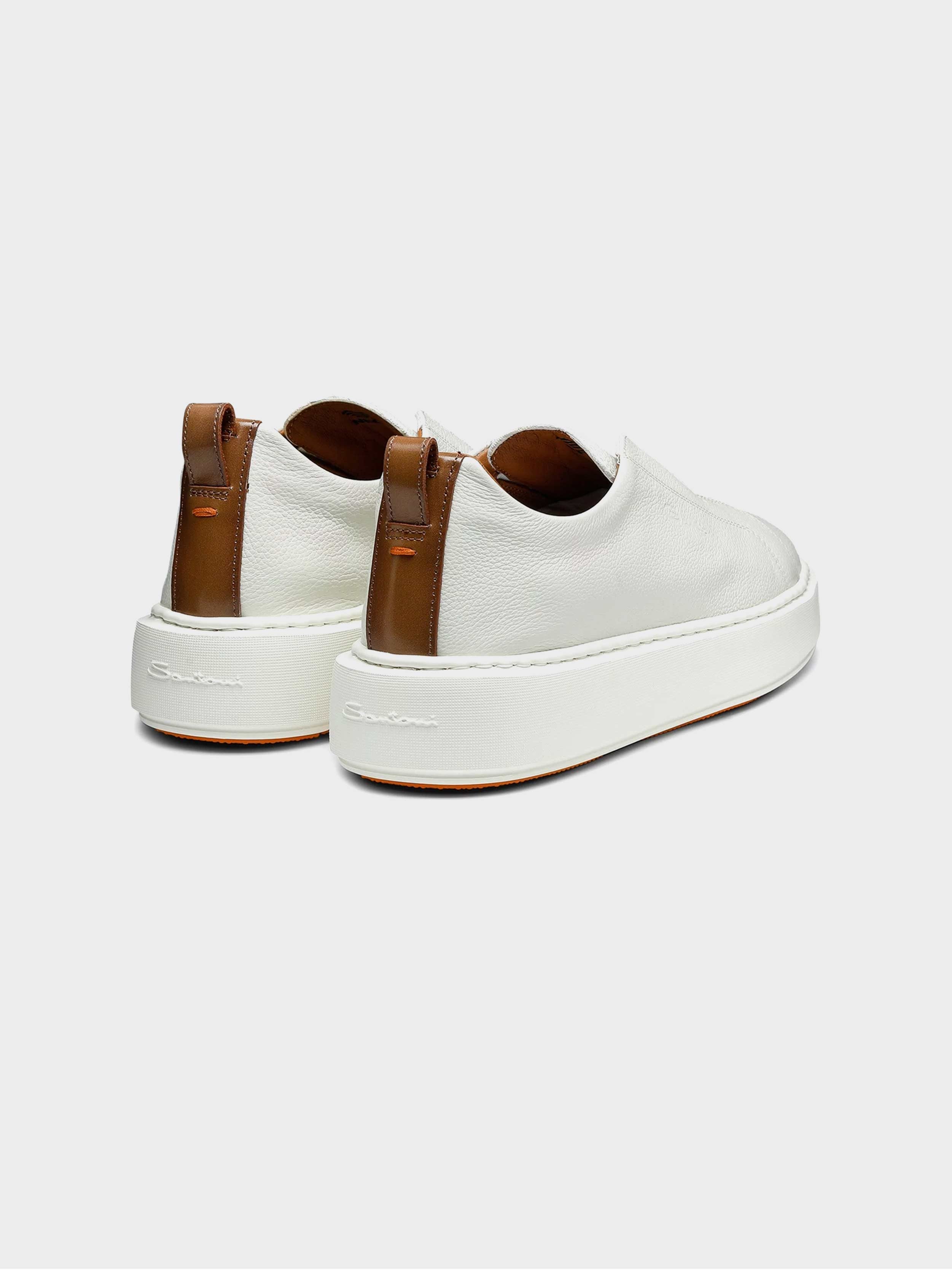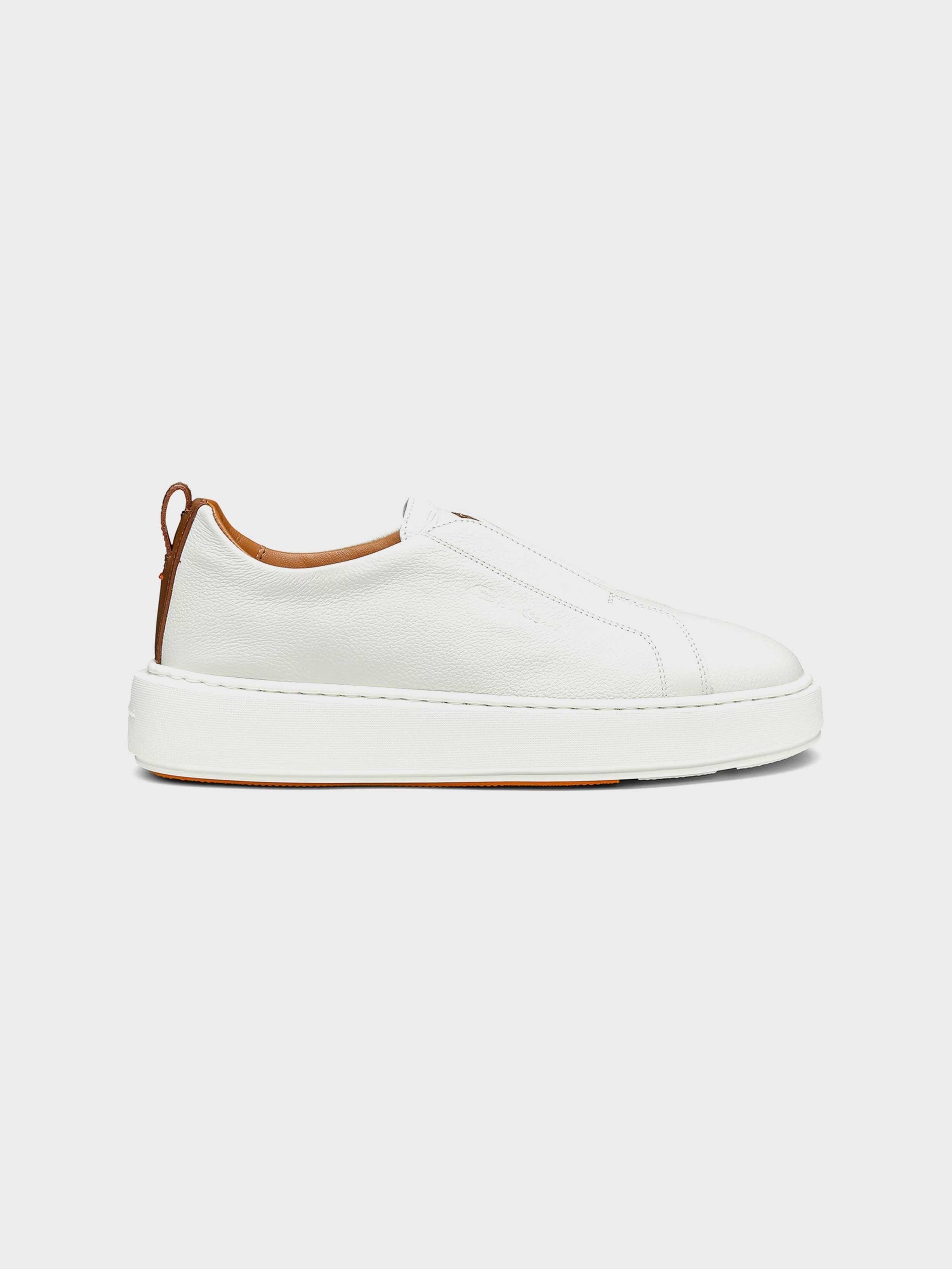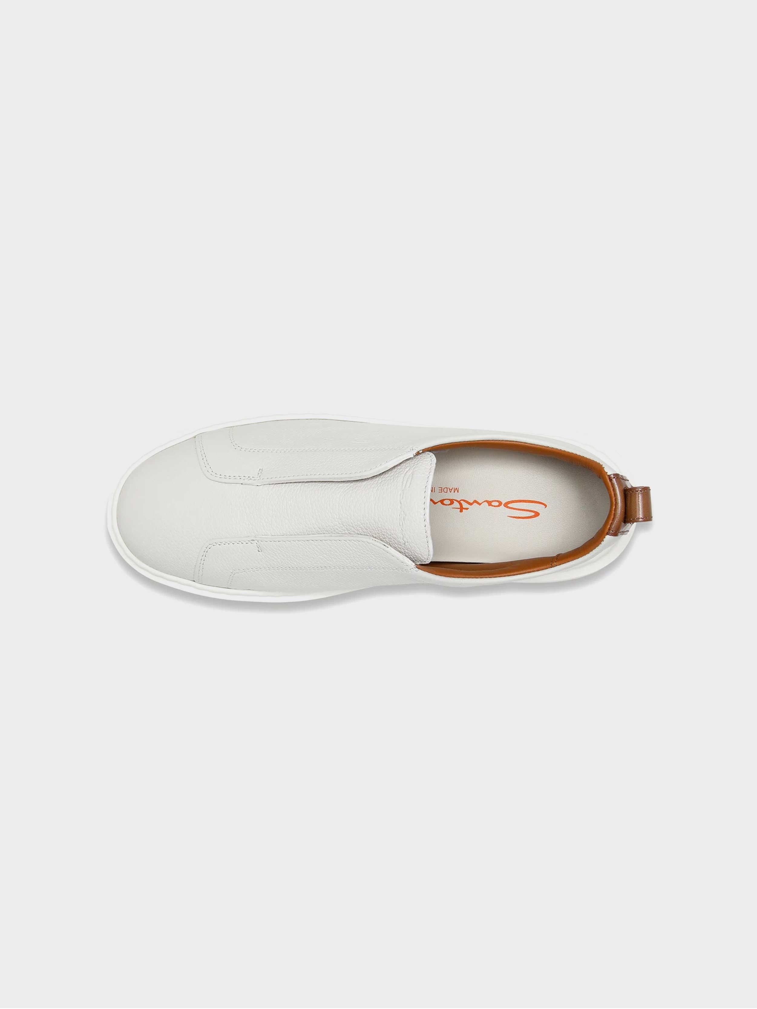 • In the exclusive world of Santoni sneakers, this women's slip-on style represents the perfect blend of sporty elegance and exquisite craftsmanship. Crafted from tumbled leather, it features a leather pull tab and heel counter with our distinctive gradated finish, carrying forward the legacy of Santoni’s color treatments. A flexible rubber cupsole completes the design, promising impeccable comfort and freedom from morning to night.