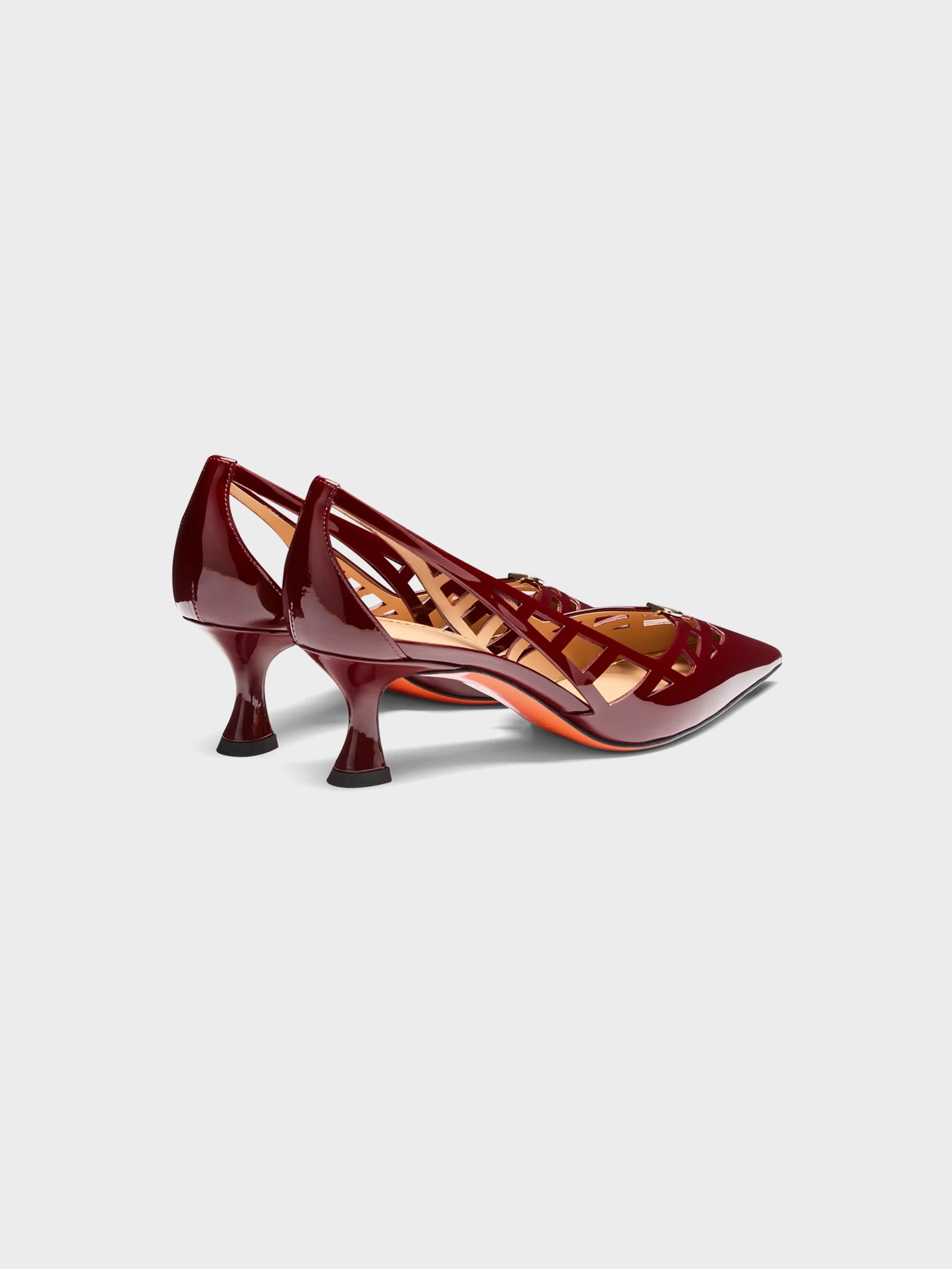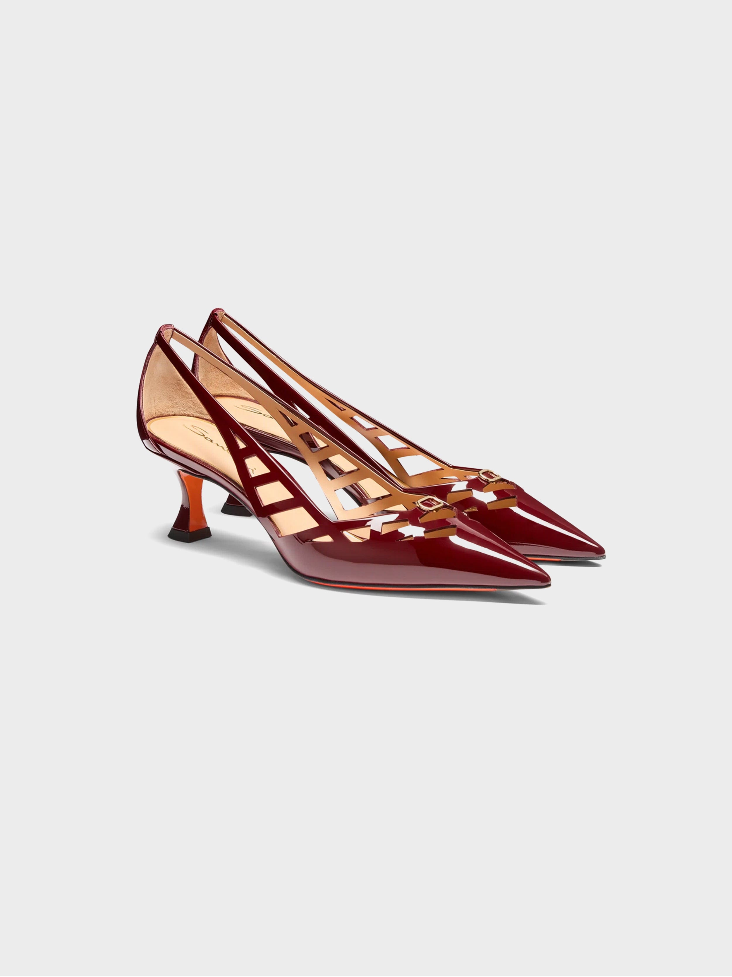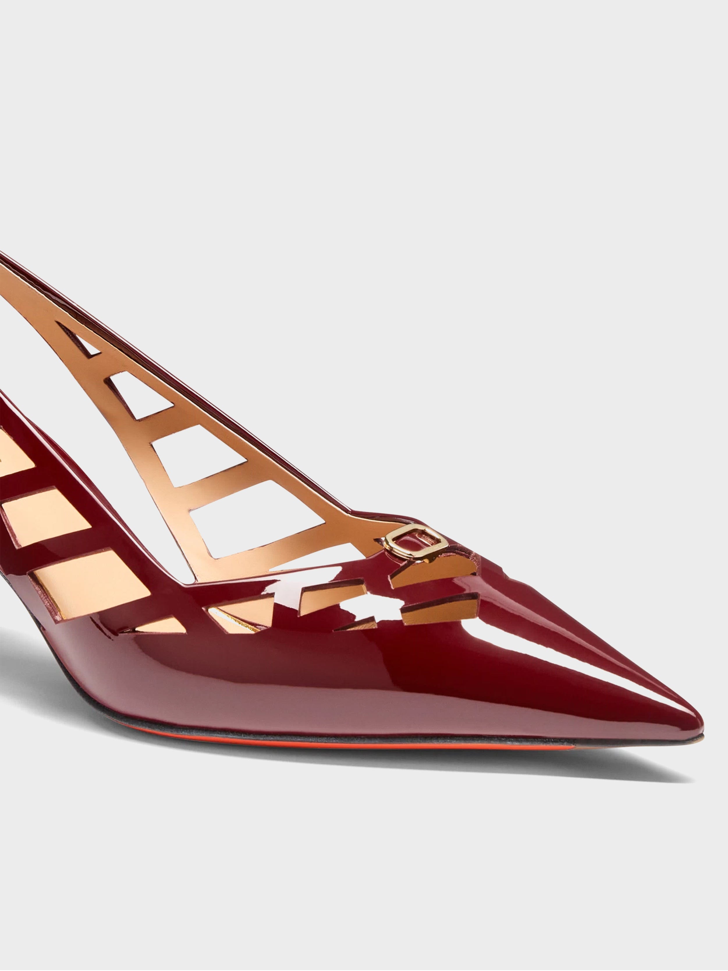 • Audacious lines and artisanal sophistication make this patent leather pump with ethereal openwork detailing a cut above the rest. Its elegant silhouette with tapered toe and spool heel elongates the leg while harmoniously moulding to your every stride. A delicate metal buckle embellishment cements Santoni’s passion for reinterpreting heritage codes through a modern lens.