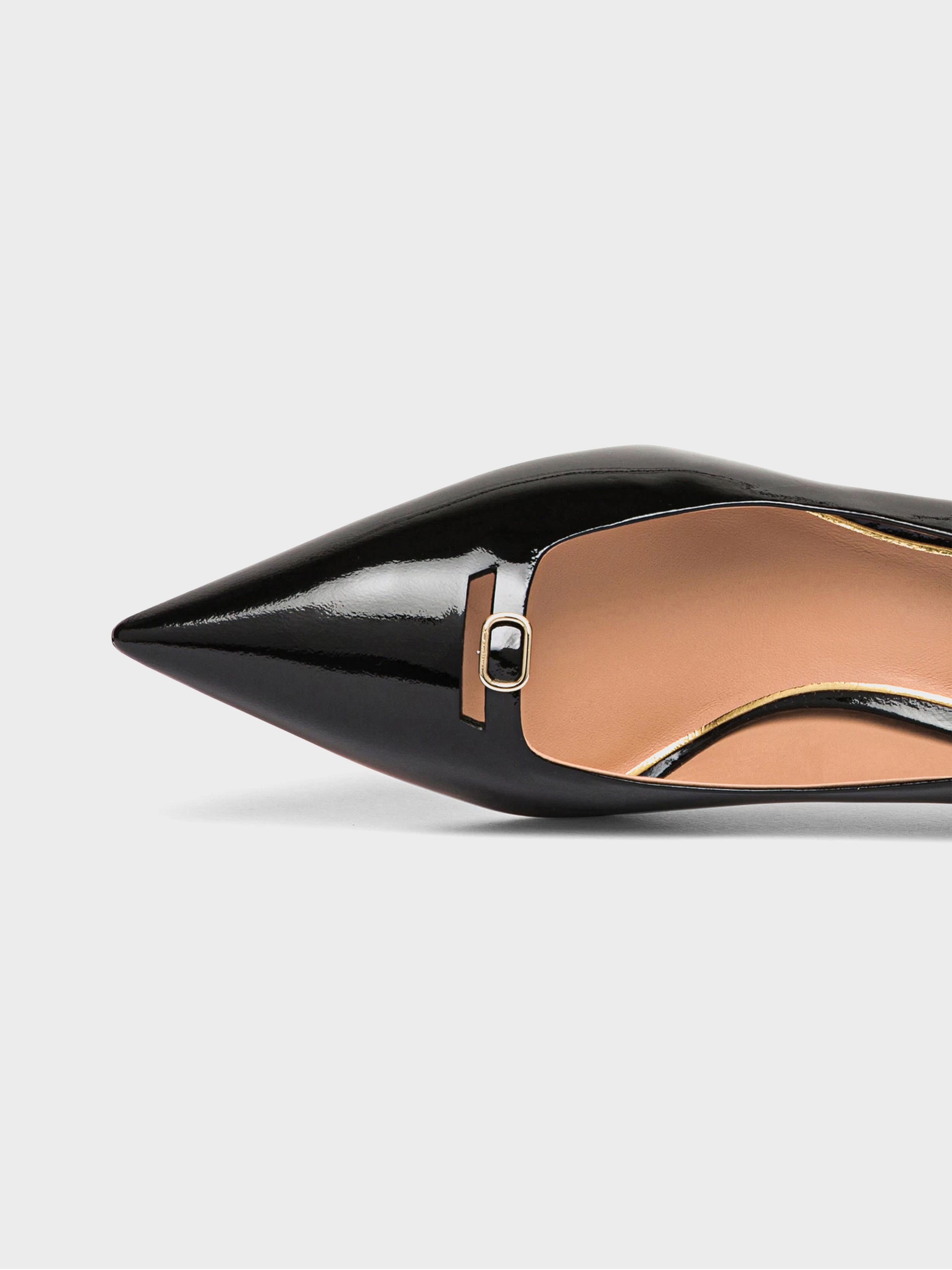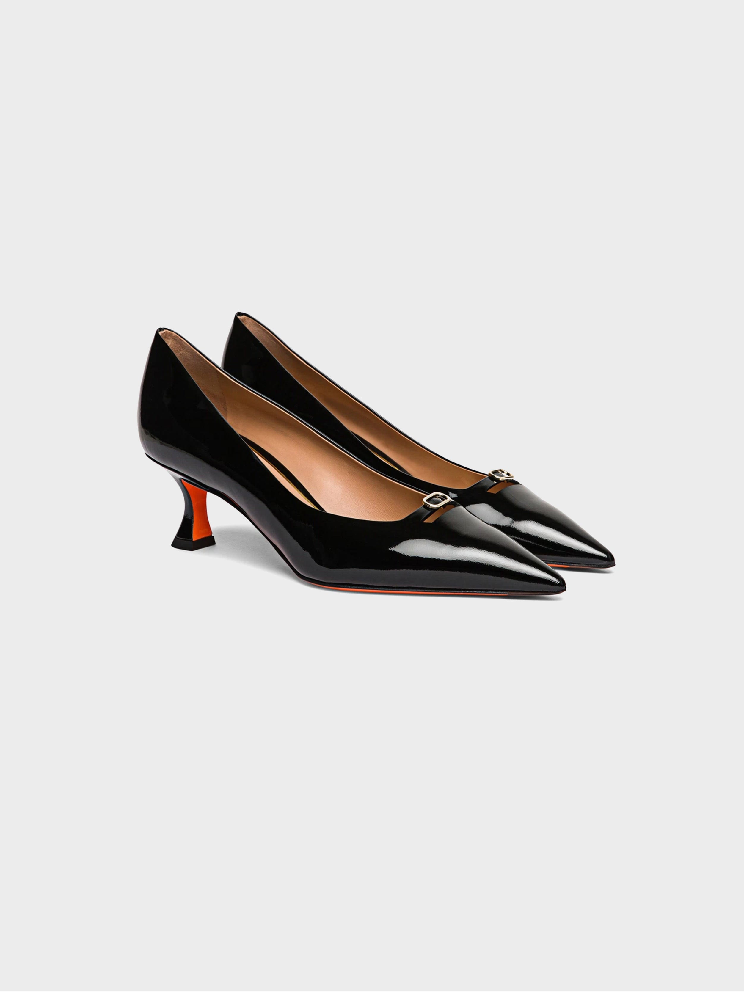 • This pump unites understated sophistication with a feminine take on Santoni’s heritage style codes. Patent leather illuminates the lines of its sleek tapered silhouette with spool heel, bringing effortless elegance to any outfit. Embellished with a delicate metal buckle as a discreet homage to one of the Maison’s hallmark symbols.