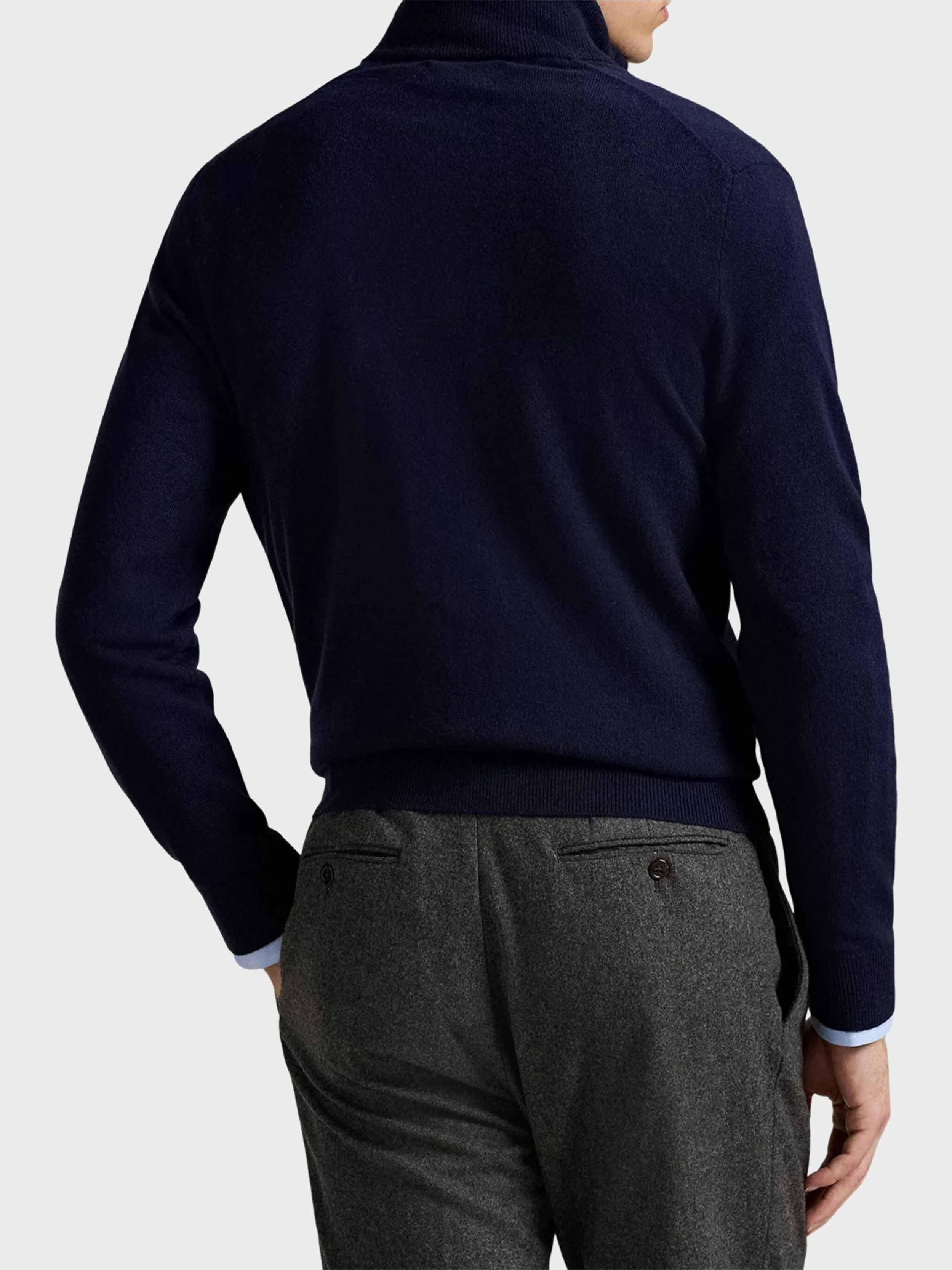 • Rib-knit mockneck. Faux-suede piping on the interior back neck. Quarter-zip placket. Suede zip pull custom-developed with a "Polo" logo.