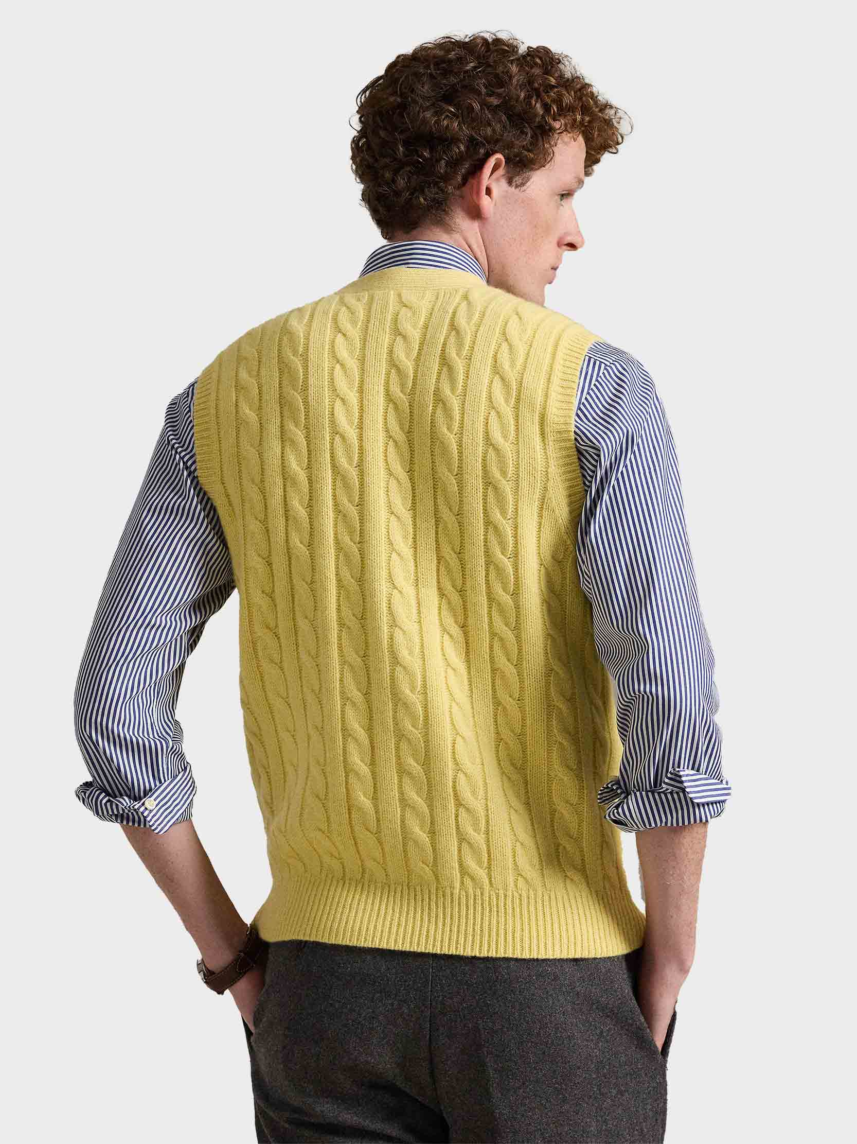 • This button-front sleeveless jumper combines our iconic cable-knit design with an Italian wool yarn spun with luxurious cashmere.