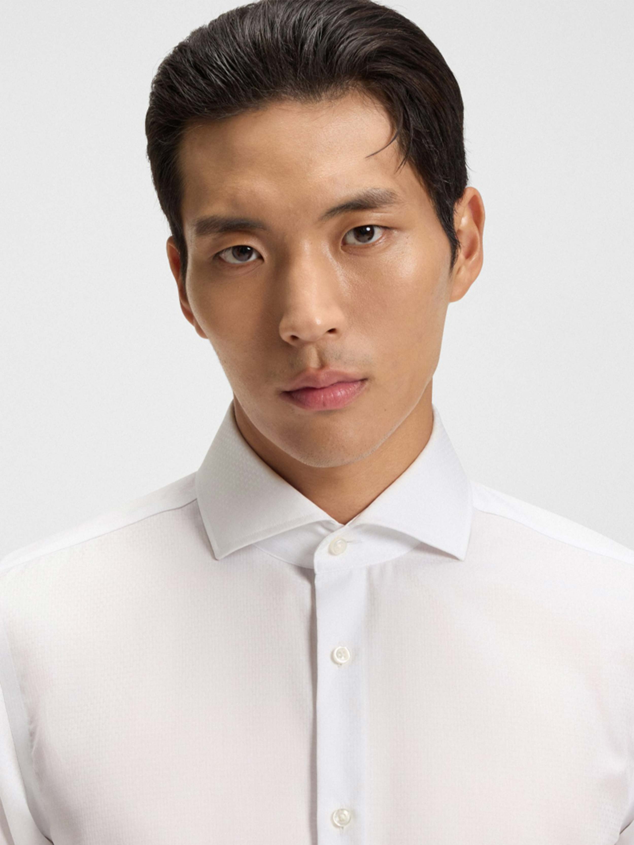 • Cut to a clean slim fit, this BOSS Menswear shirt benefits from wrinkle-resistant finishing for an impeccable look. Soft cotton twill.