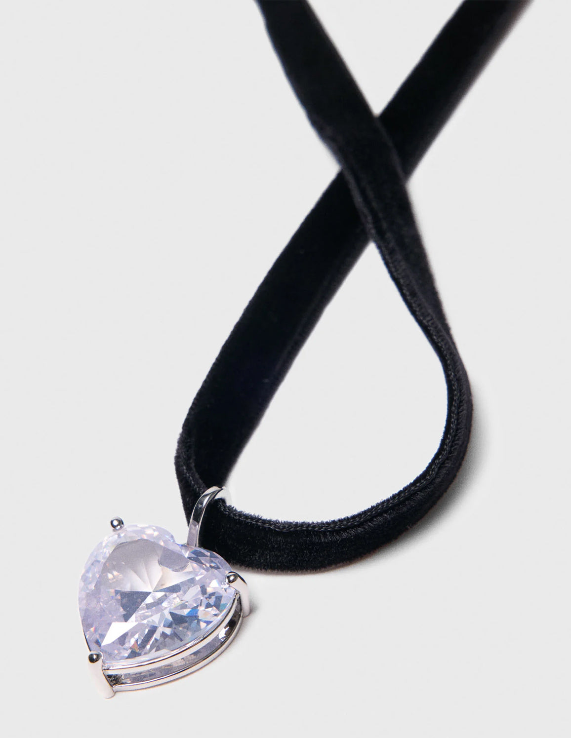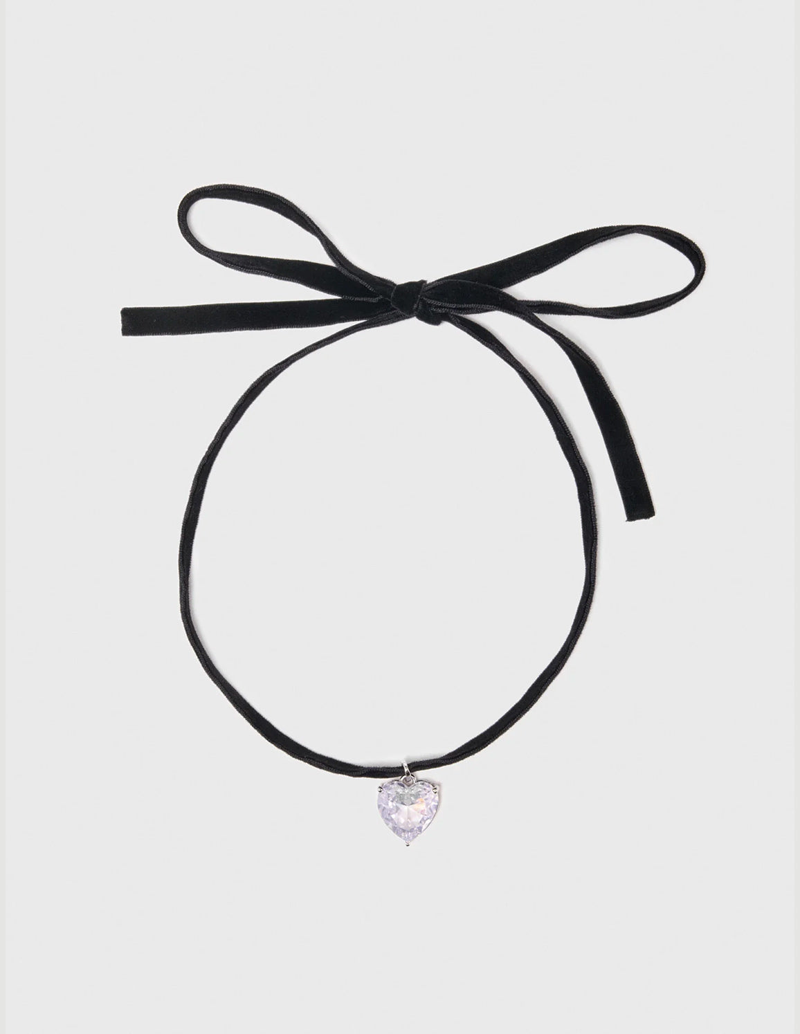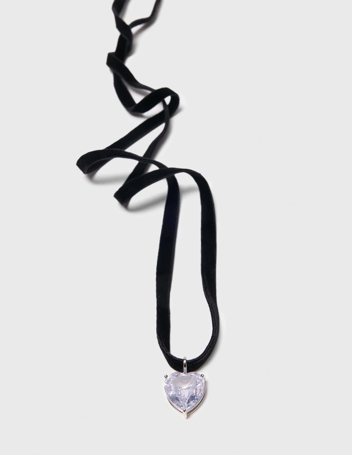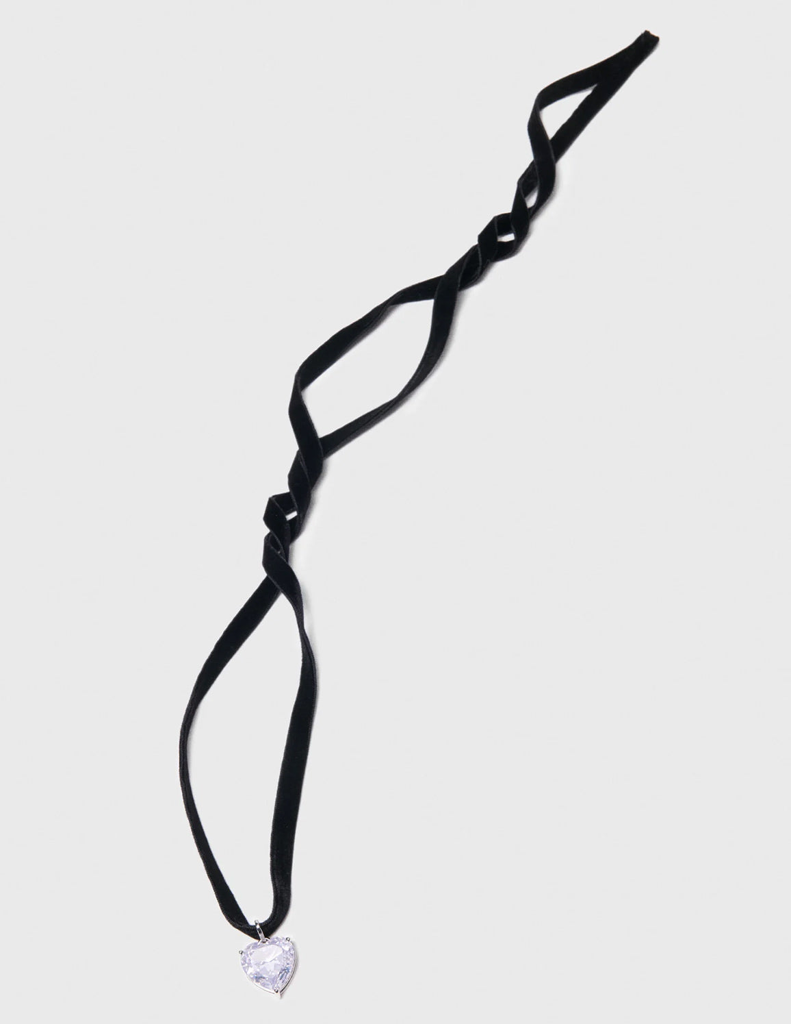 • This velvet ribbon necklace has a retro-elegant feel with a romantic touch. The heart-shaped pendant, faceted like a gemstone, reflects the light and catches the eye.