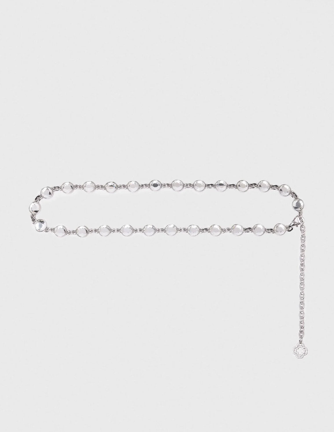 • Made from a silver chain adorned with round rhinestones, this belt catches the light with every movement, adding sophisticated flair.
