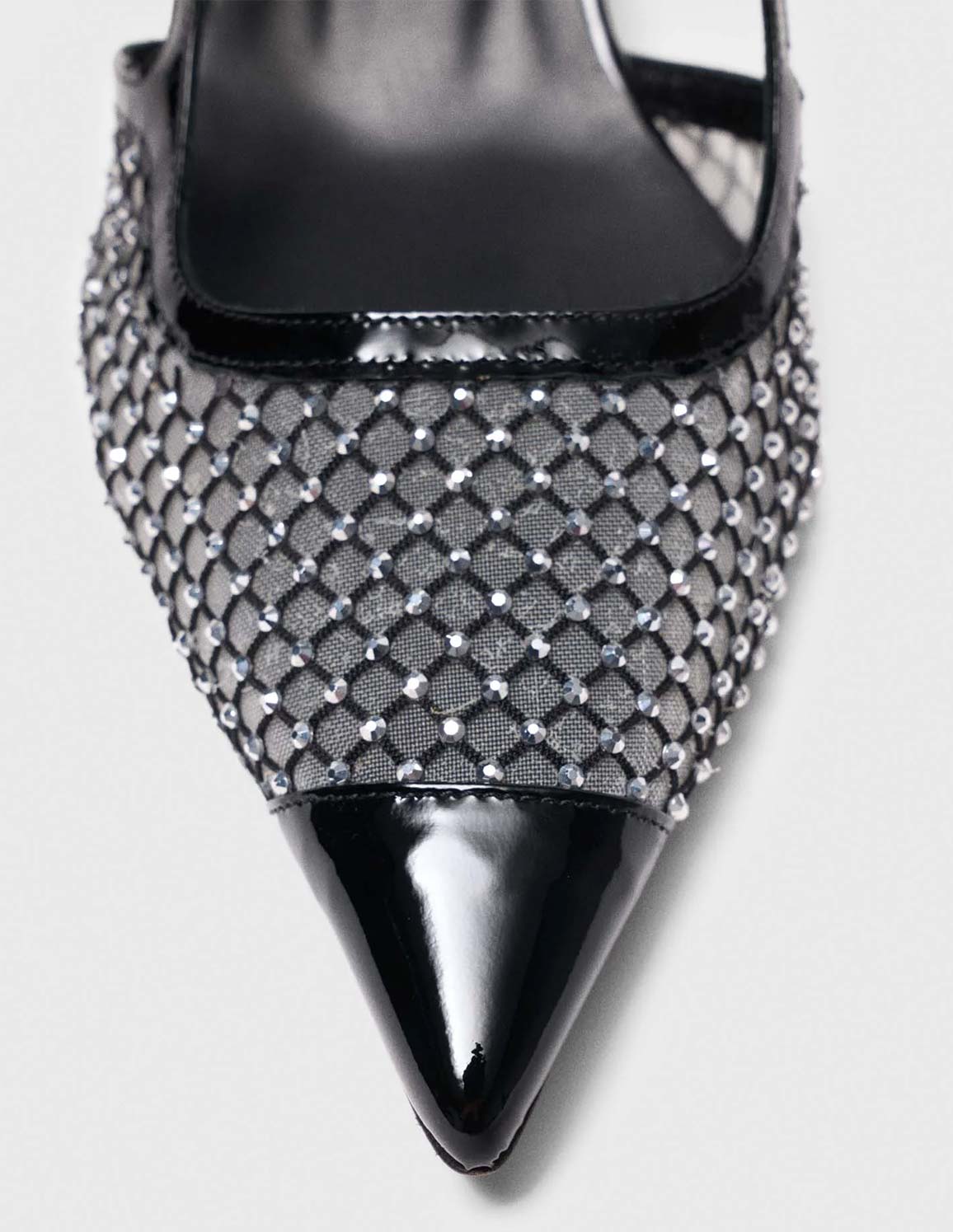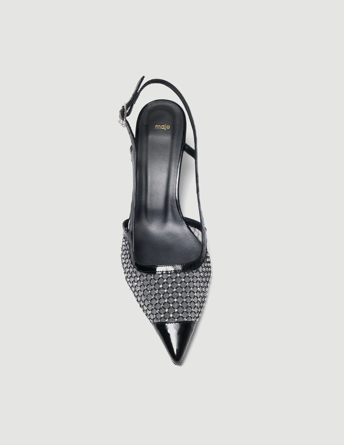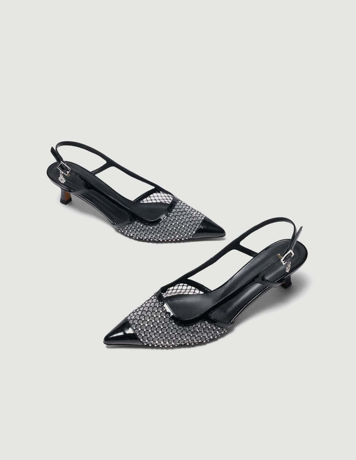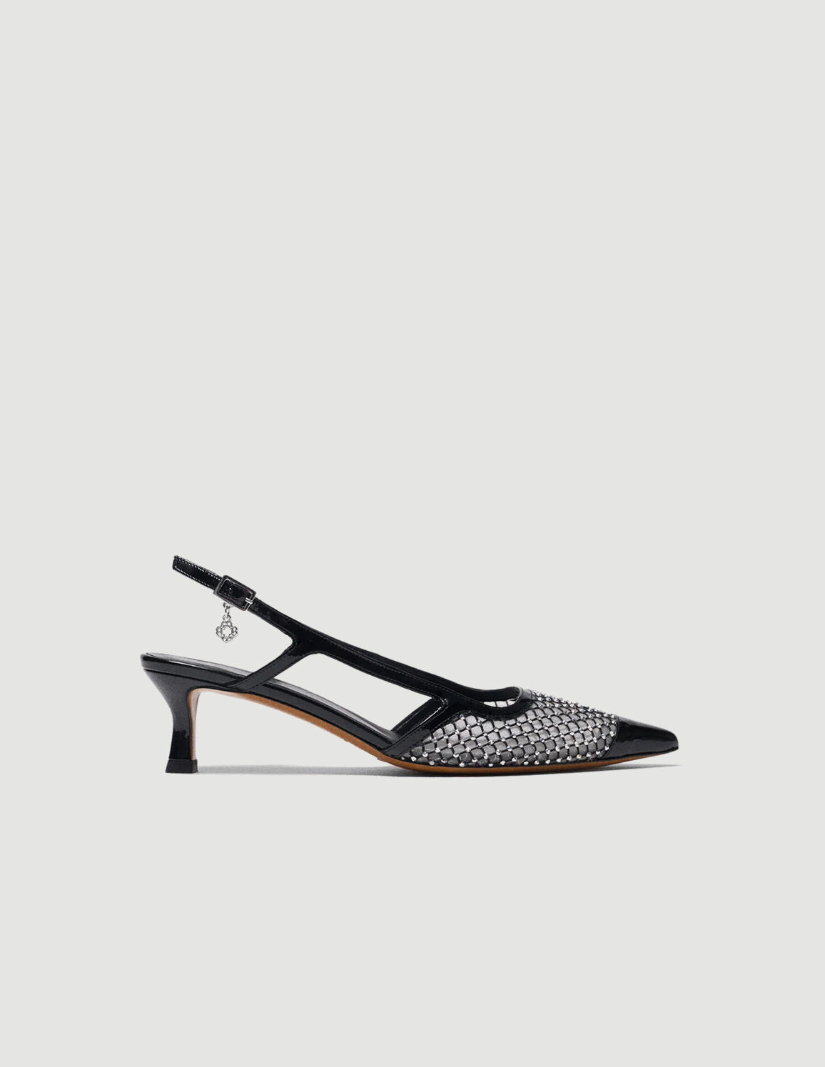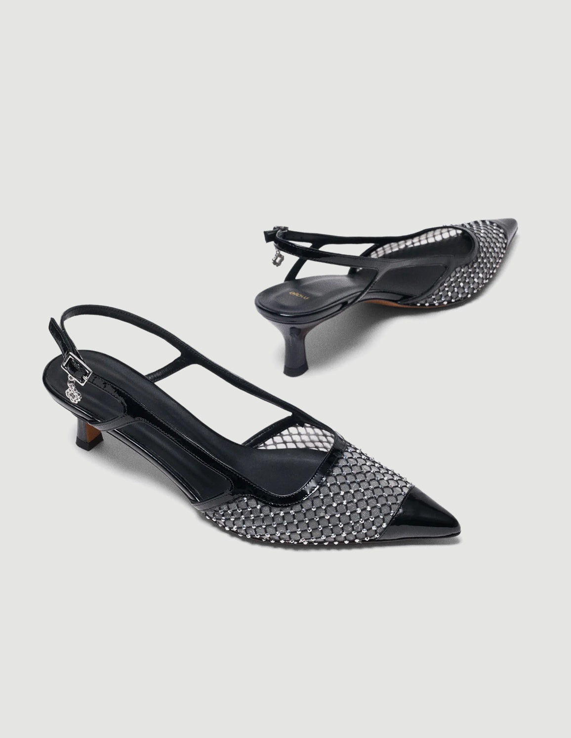 • These rhinestone mesh pumps combine transparency and sparkle. Their pointed toe and stiletto heel elegantly elongate the figure, while the adjustable strap is embellished with a discreet signature clover charm.