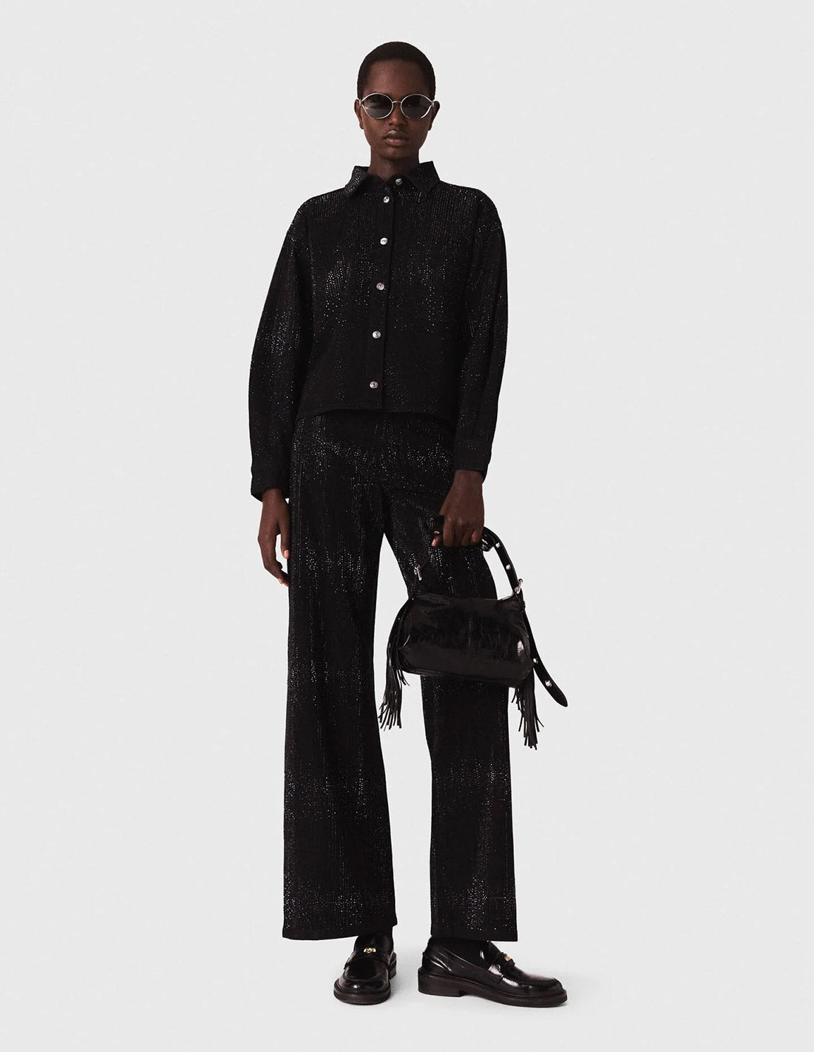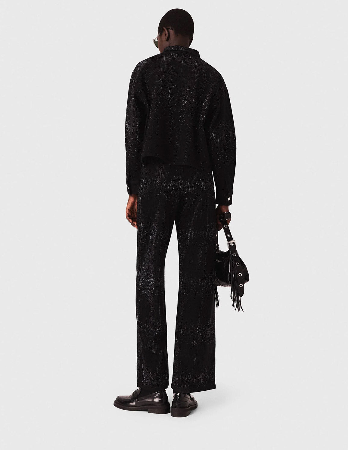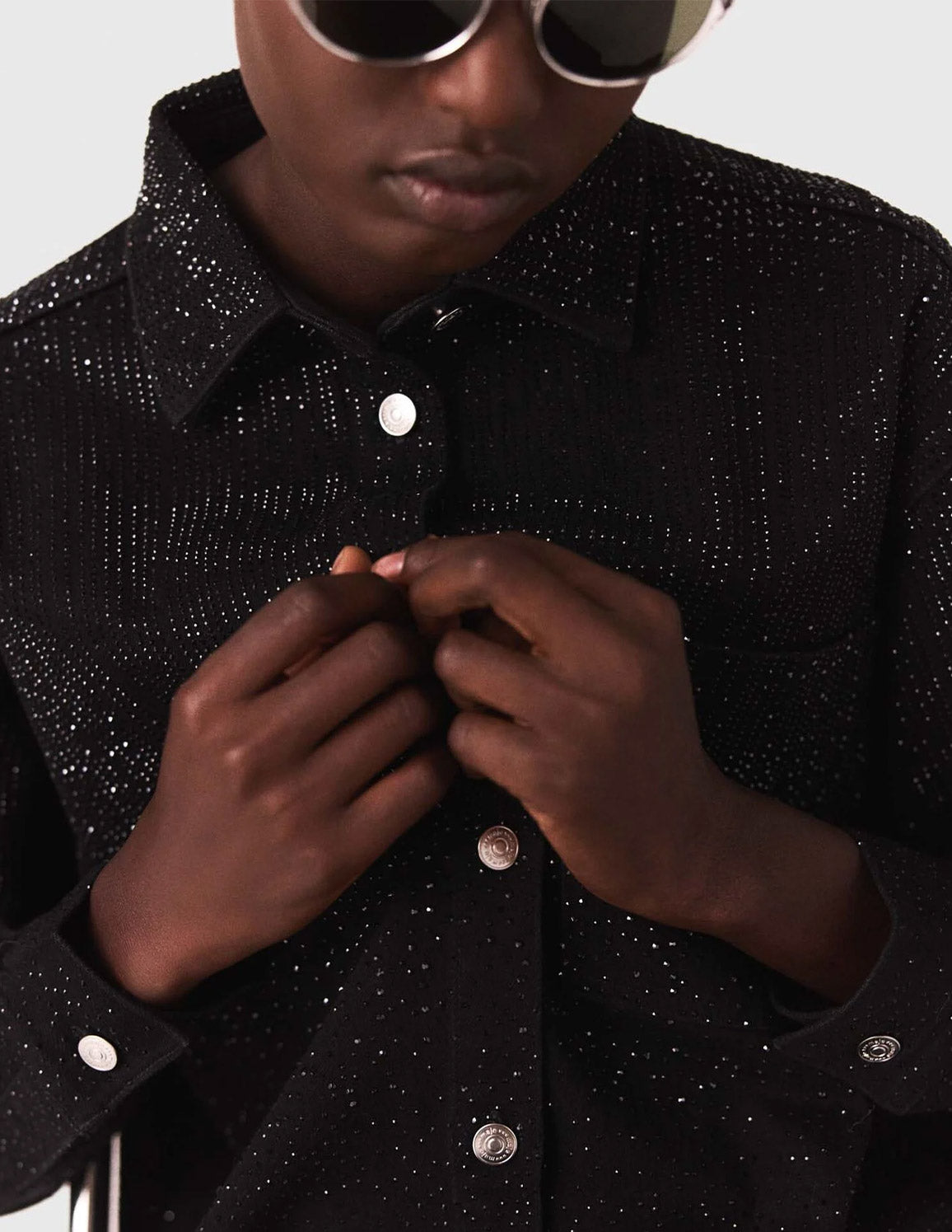 • Black denim shirt with all-over rhinestones