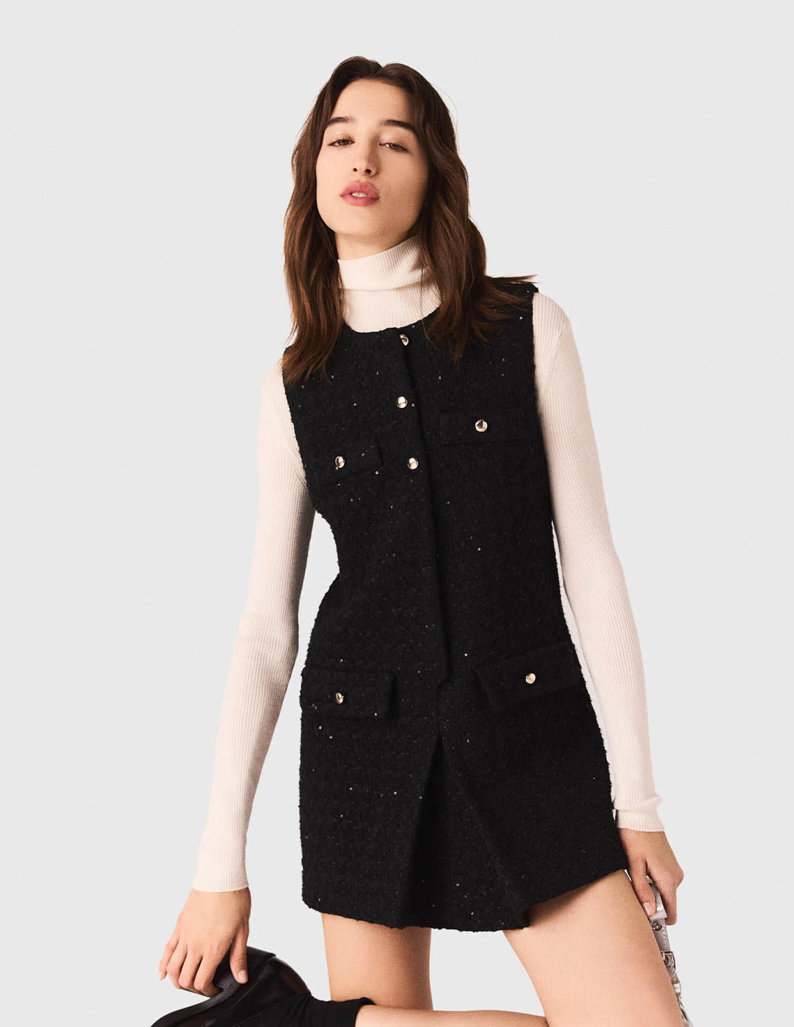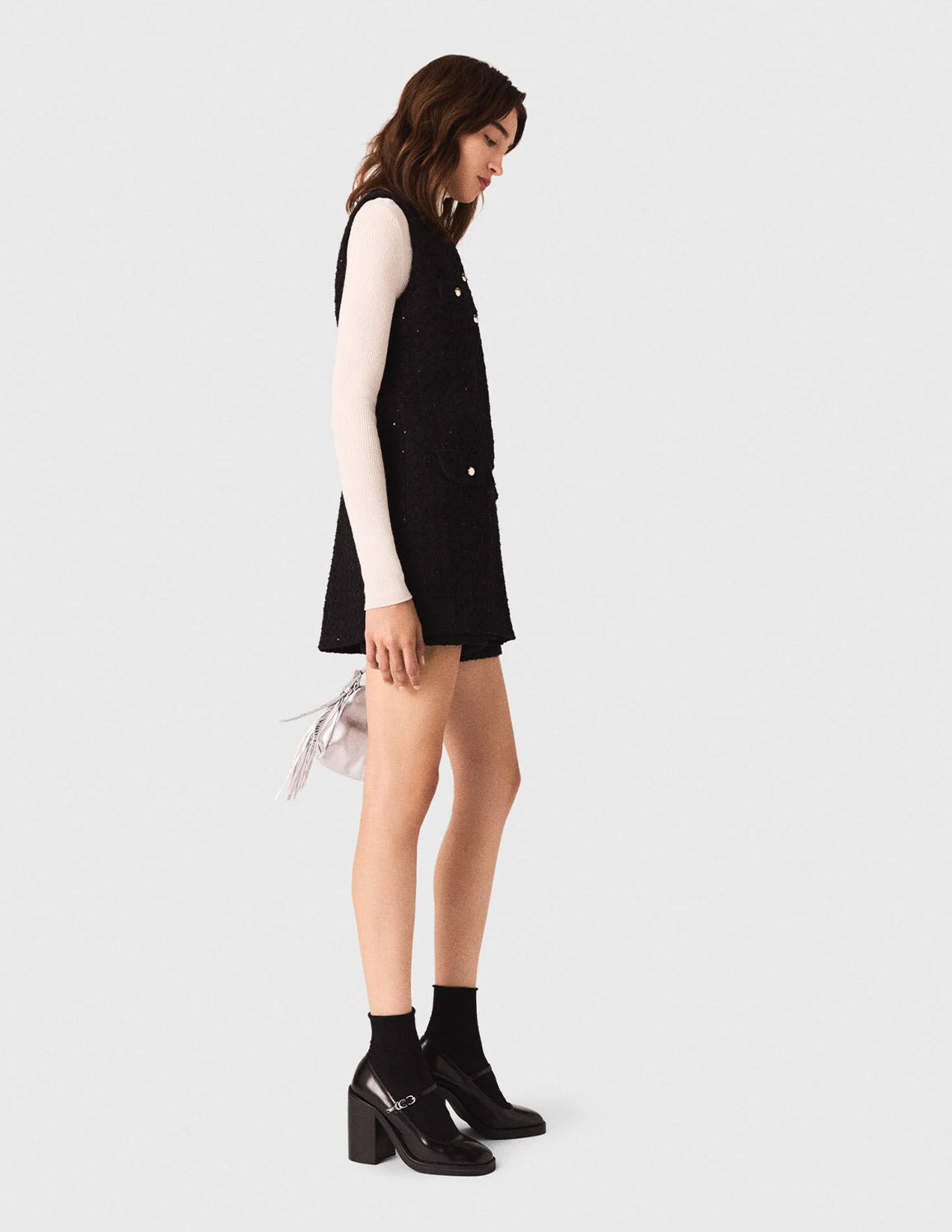 • This piece creates a subtle illusion: a comfortable, practical pair of shorts is concealed beneath its skirt-style panel. The tweed is embellished with sequins while retaining a structured, tailored feel. Perfect for giving a polo neck a new twist, or for an effortlessly sparkling evening look. Add some signature accessories: a leather bag and heeled Mary Janes.