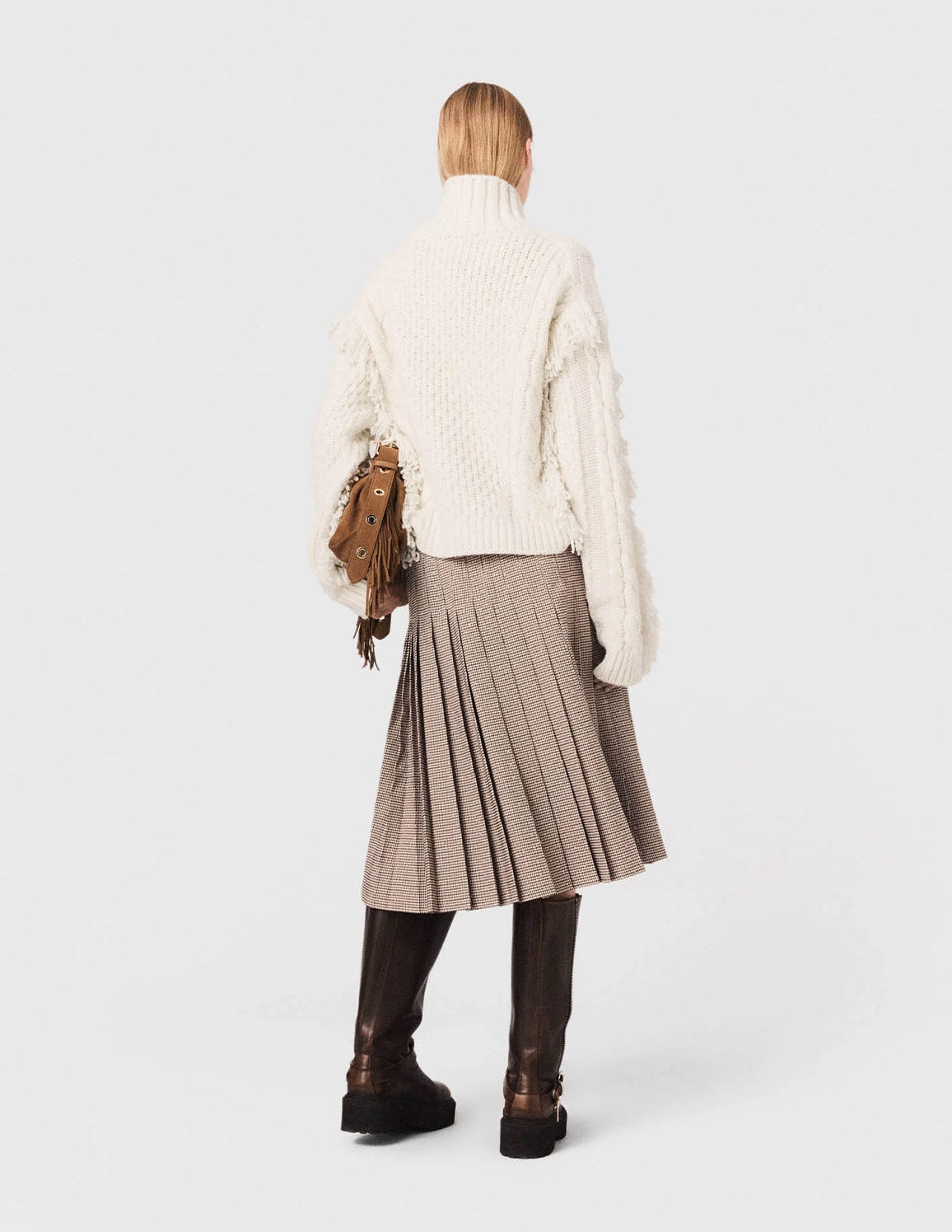 • This pleated houndstooth skirt stands out with the subtle sparkle of its rhinestones and its leather-effect buckles. The structured cut and floaty drape enhance its elegant, metropolitan look.
