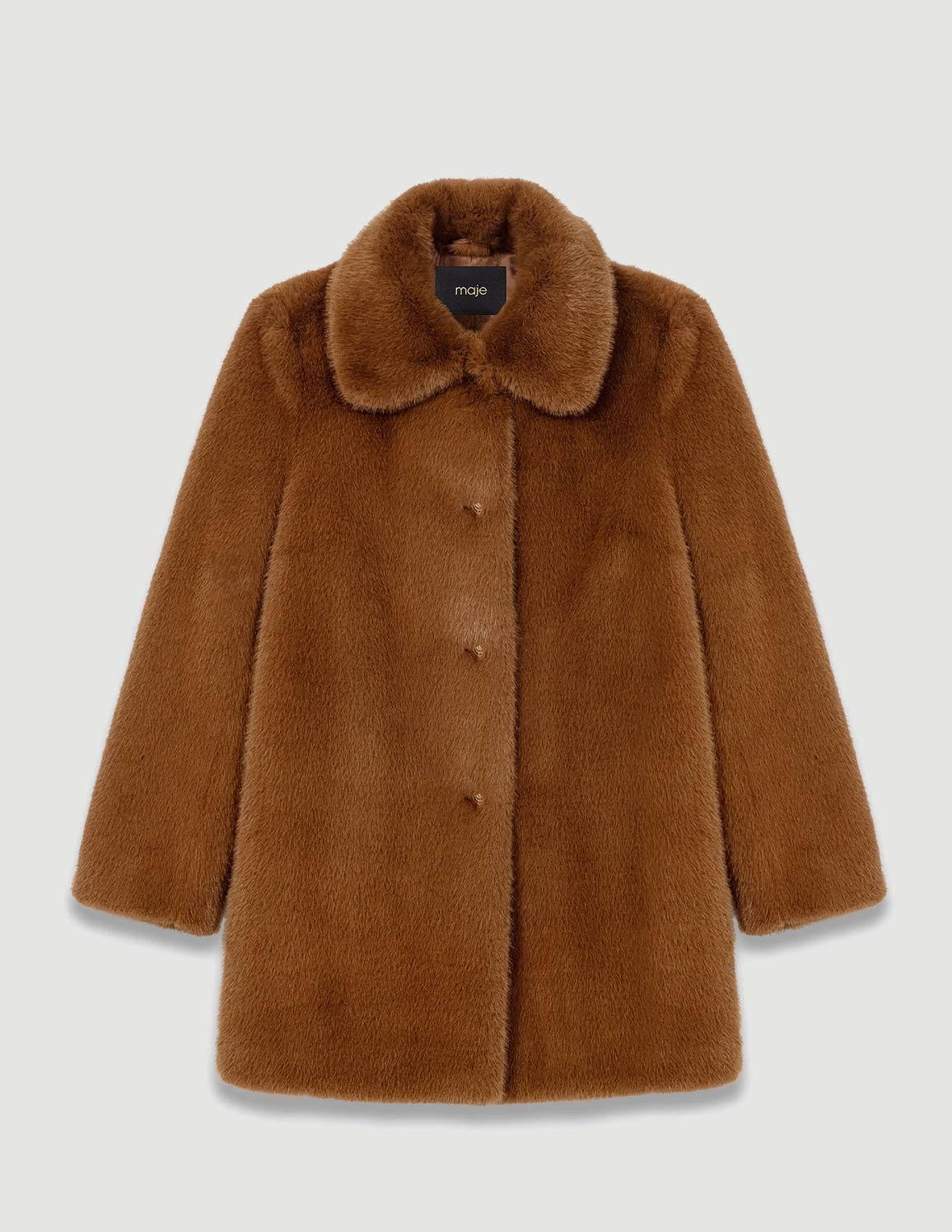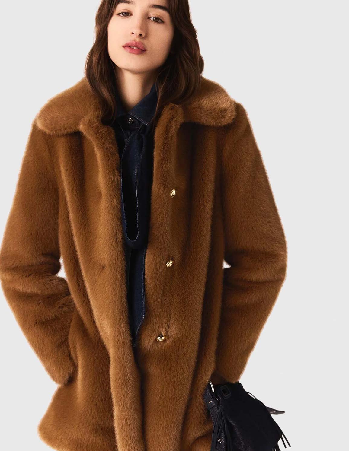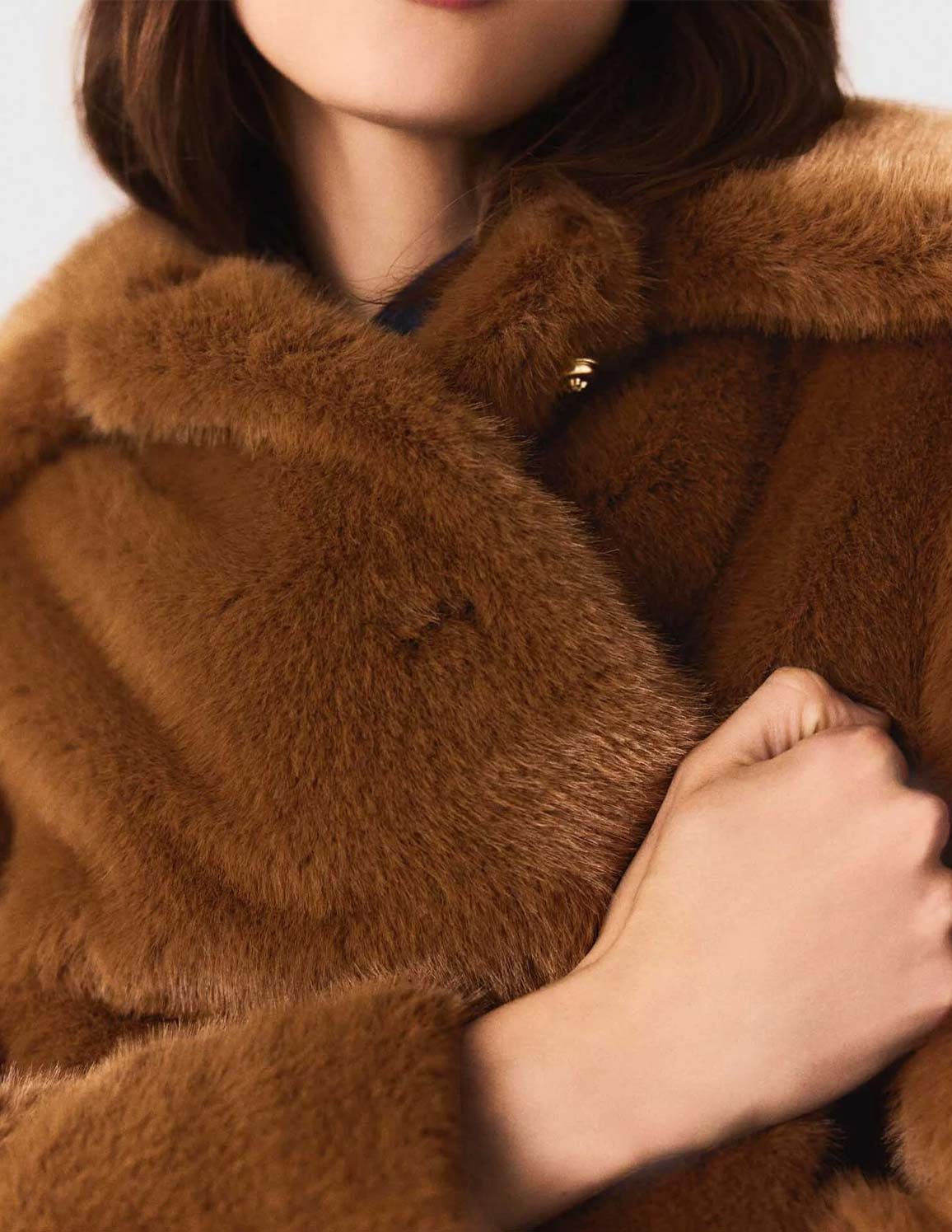 • A statement piece with a soft, comforting feel. This mid-length faux fur coat elegantly envelops your figure in a warm brown reminiscent of retro styles. The notched collar and gold buttons enhance its couture look, perfect for keeping warm in style.
