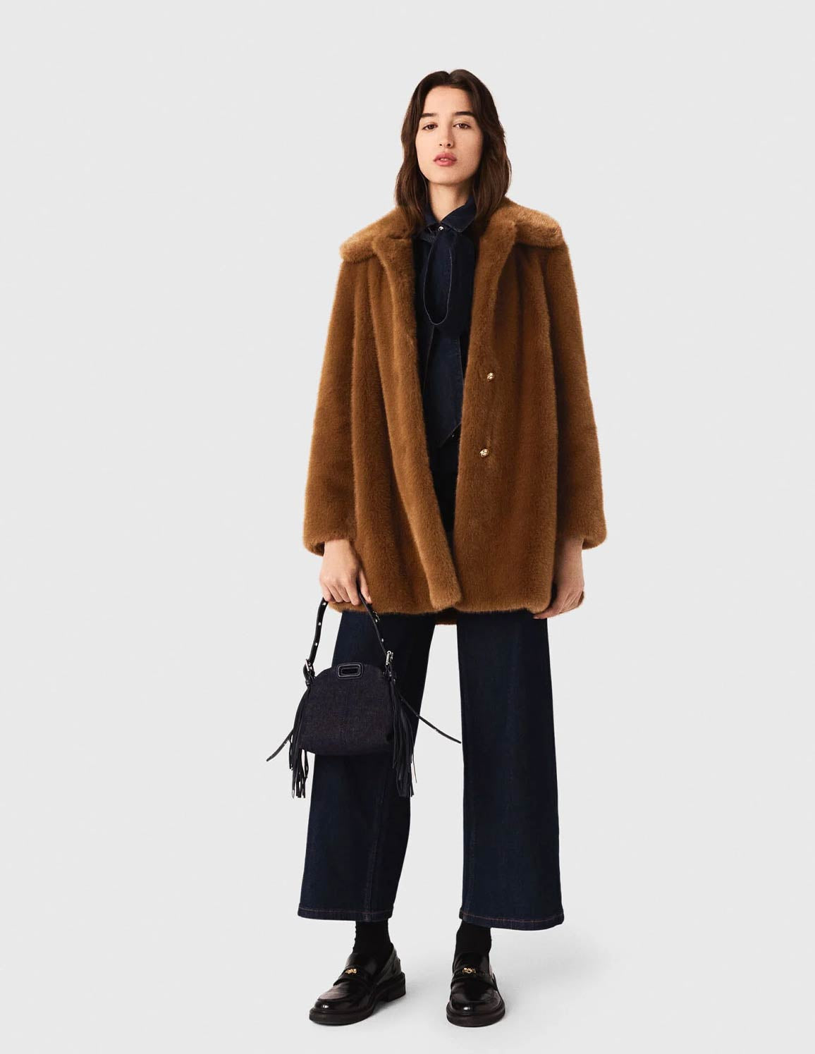 • Pair it with a denim shirt and raw wide-leg trousers, and complete the look with patent loafers and a small fringed bag.
