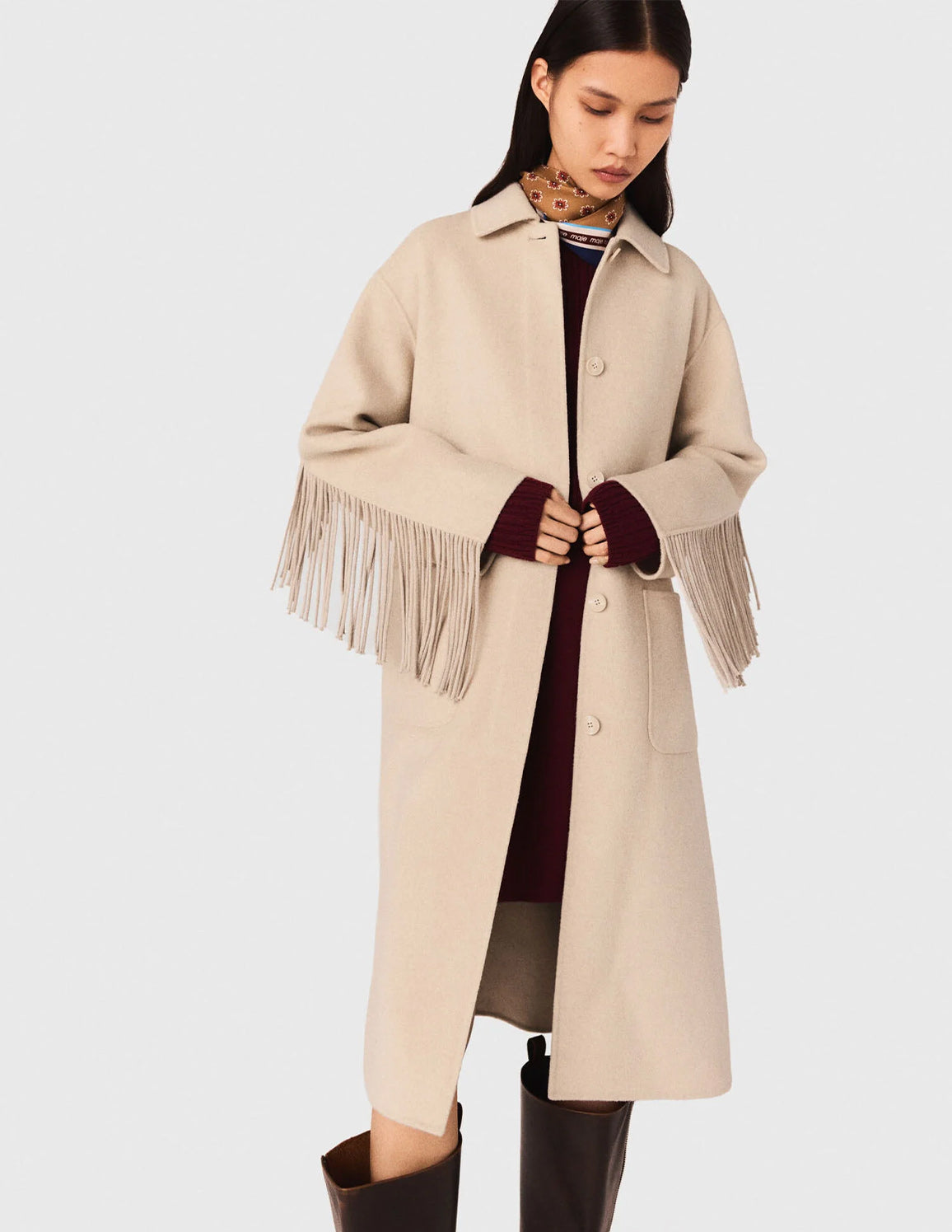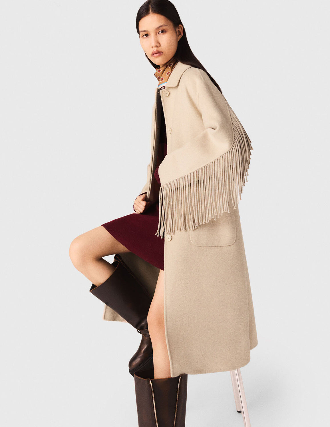 • Made from double-faced wool, it has a structured volume, highlighted by fringed details on the sleeves and back. Its removable belt allows you to adjust the look to suit your mood, from more casual to more structured. A signature piece, designed to complement this season's layering. To complete the look, add a jumper dress and opt for signature accessories, such as a printed scarf and leather boots.