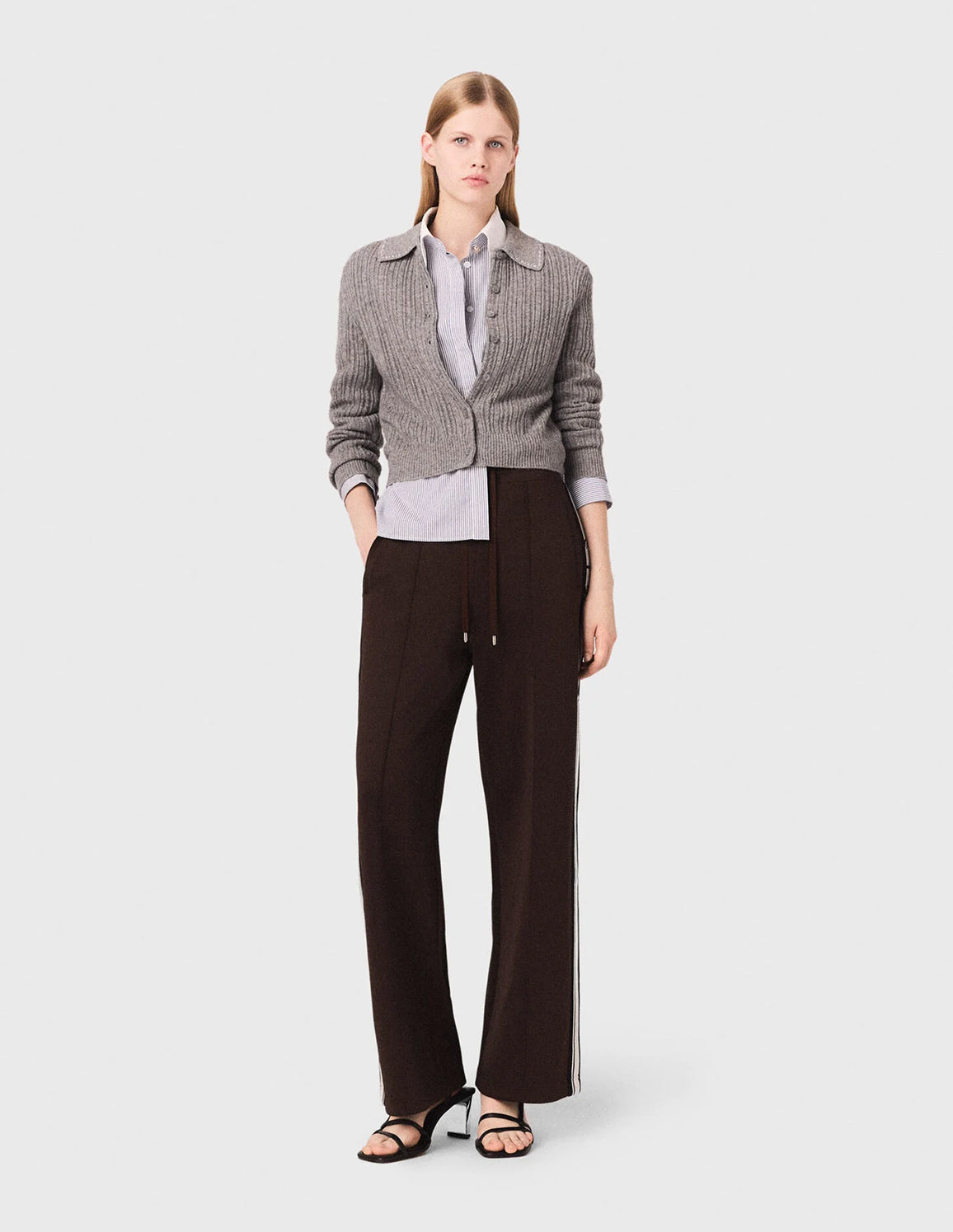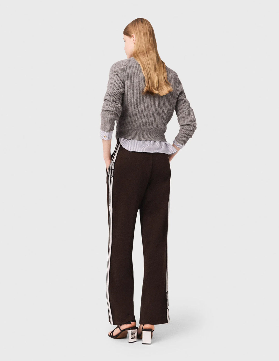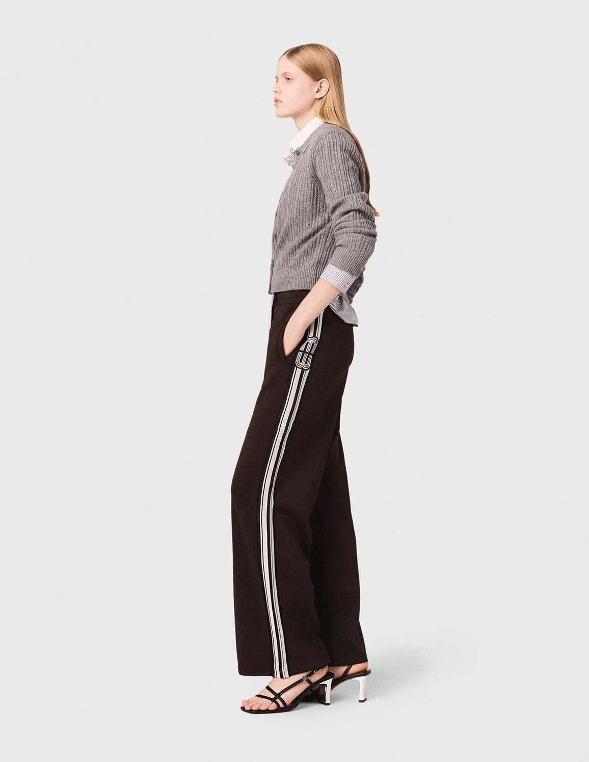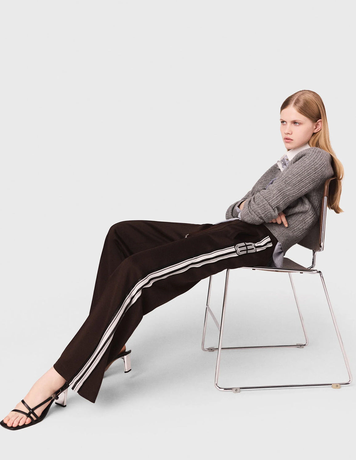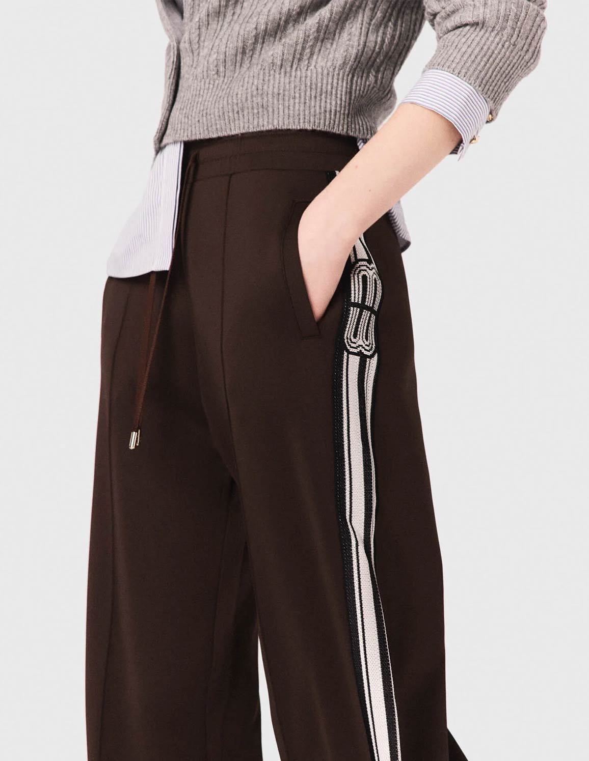 • These trousers have a loose, comfortable fit, accentuated at the waist by an adjustable drawstring. The contrasting stripes on the sides flatter the figure and add a graphic touch.