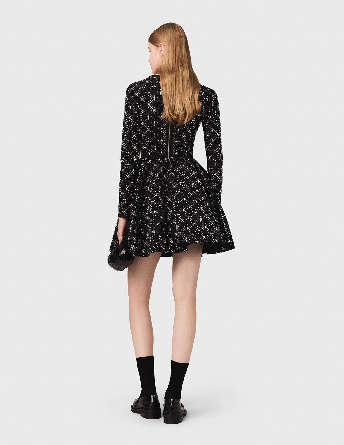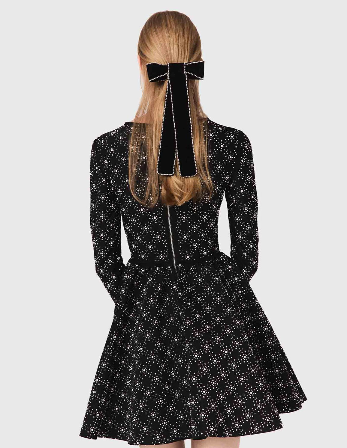 • Elegant and radiant, this babydoll dress combines a fitted top with a flared skirt with an airy volume. The long sleeves give the silhouette structure, while the ornamentation highlights its exquisite character. Fully covered in rhinestones and beads, it catches the light from every angle and offers a sophisticated look, designed for evenings where every detail counts.