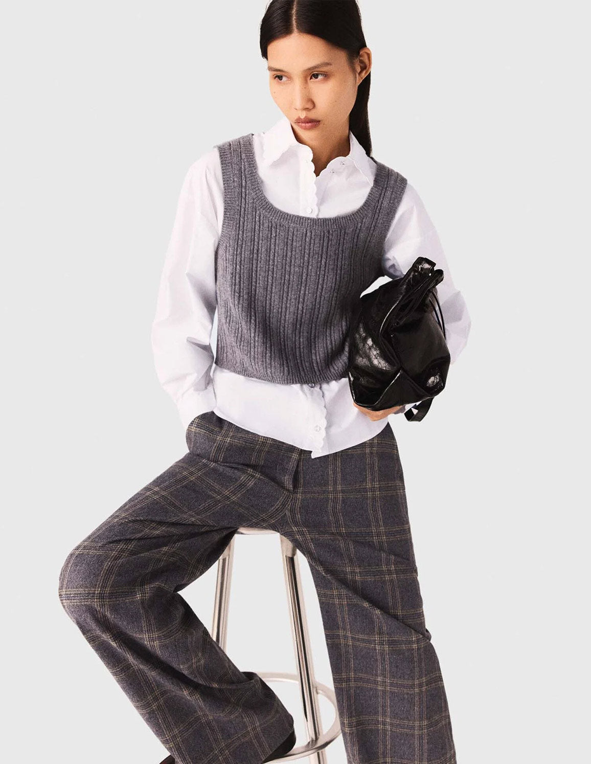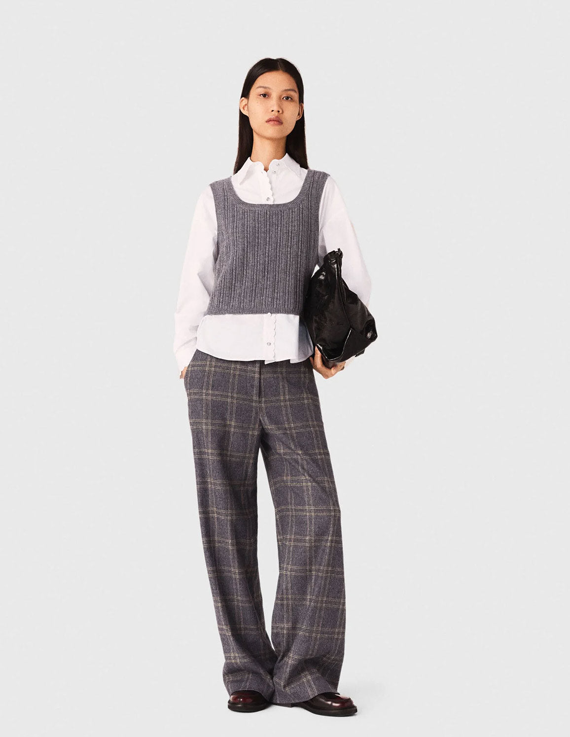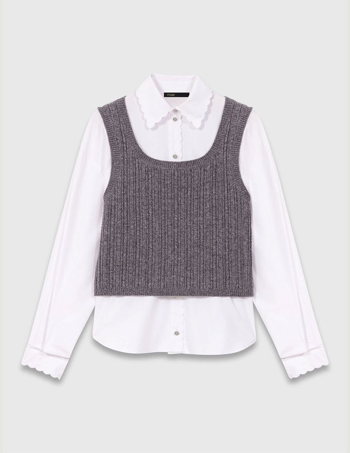 • This top creates the illusion of a sophisticated layered look: a square-neck knitted tank top and a long-sleeved shirt with an embroidered collar are one and the same. Tuck it into checked trousers for an elegant and effortless head-to-toe look, and accessorise with a bag and leather ankle boots.