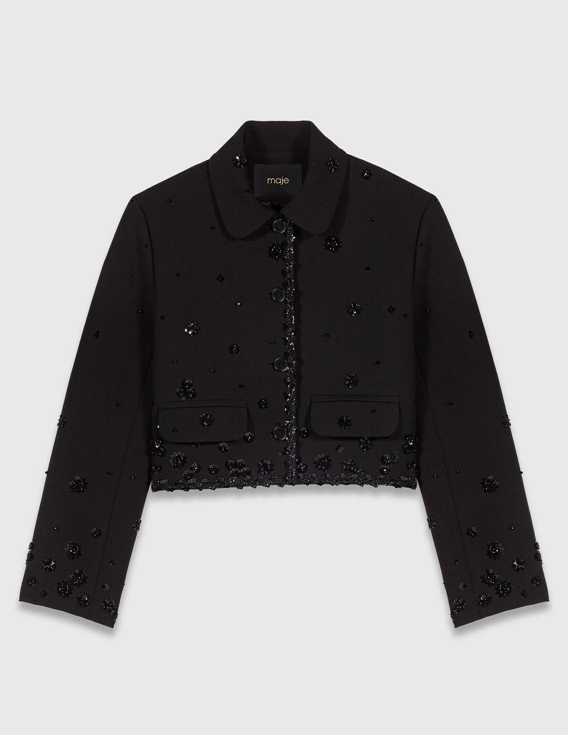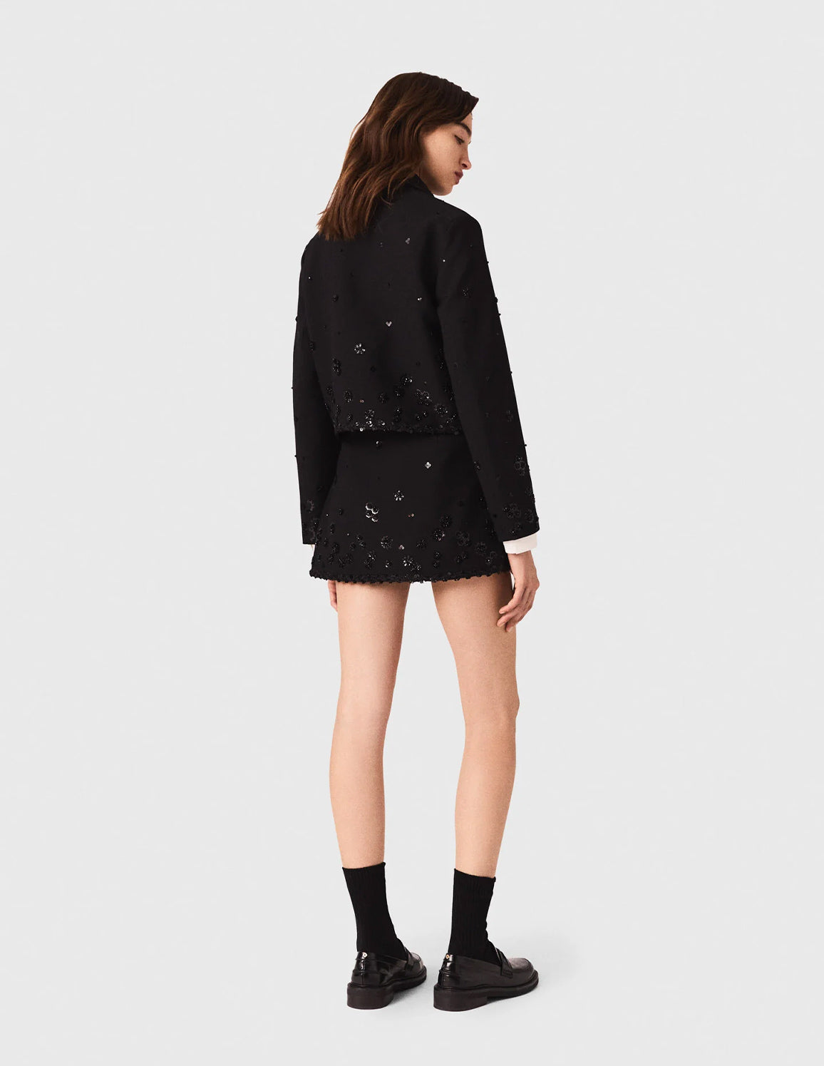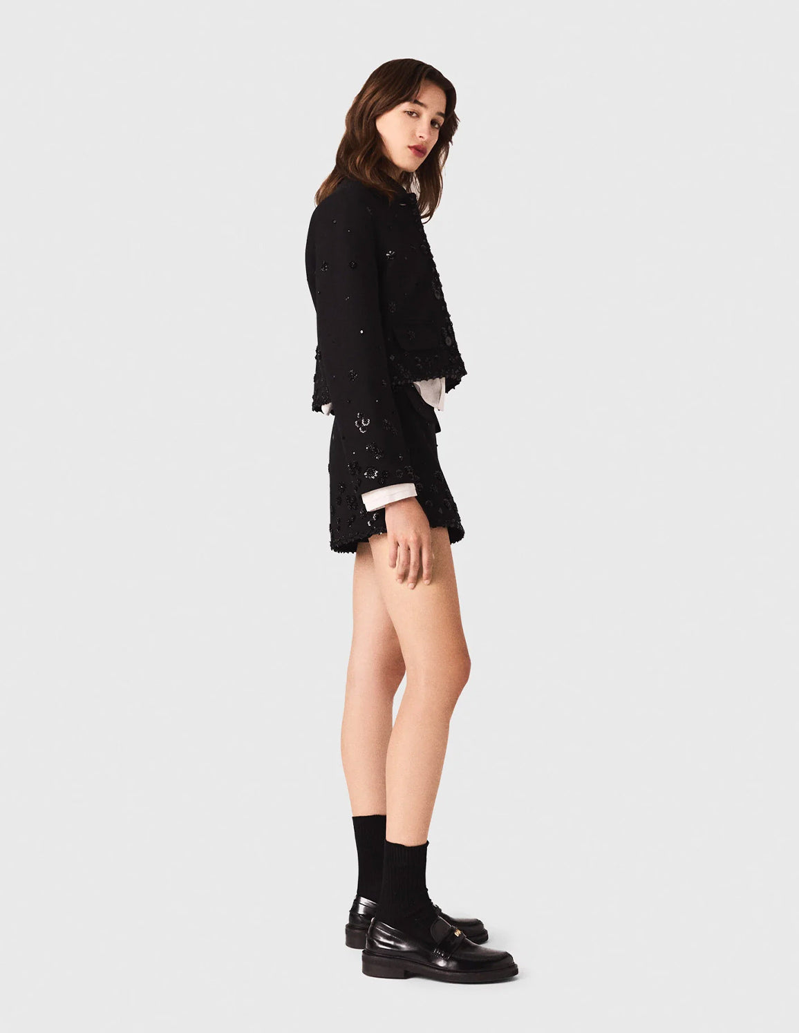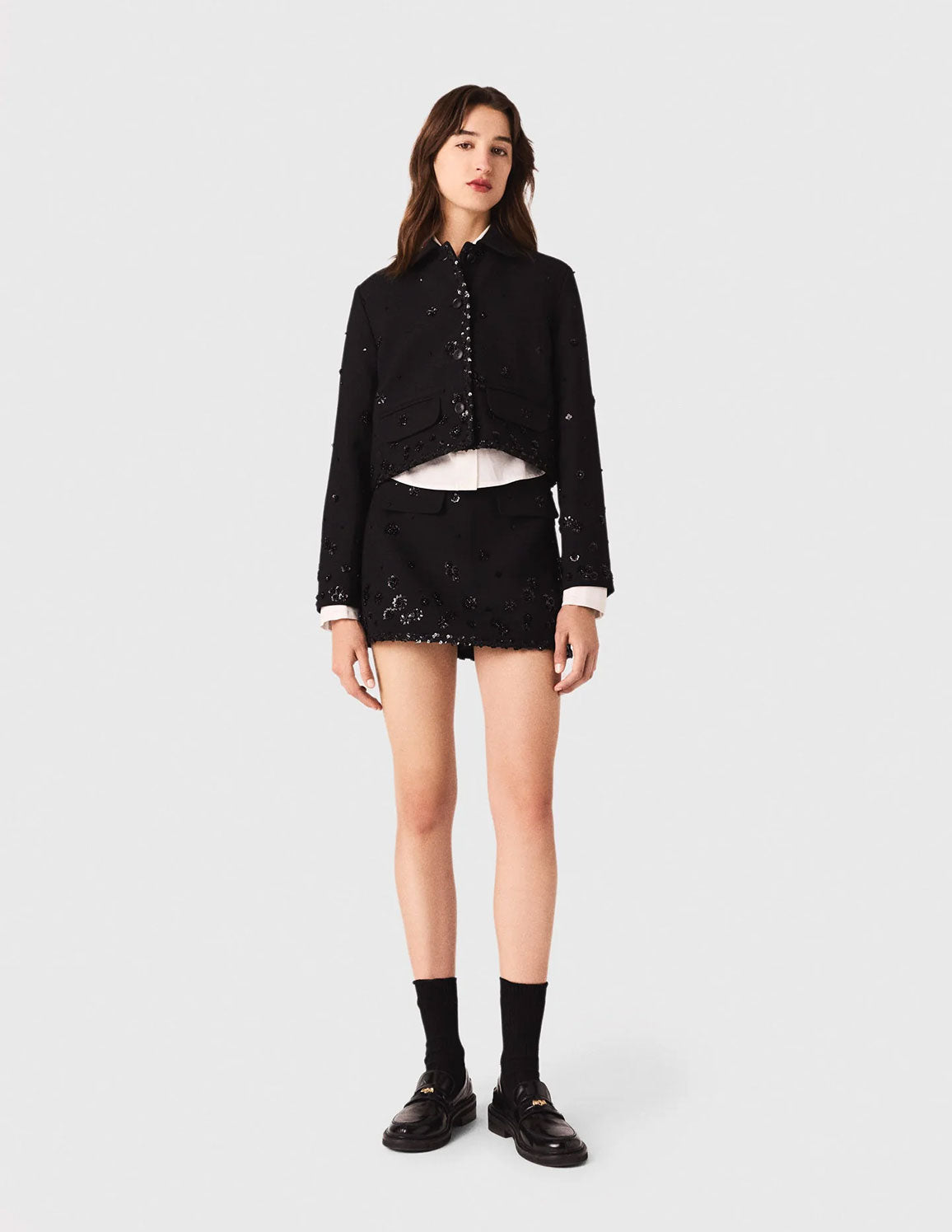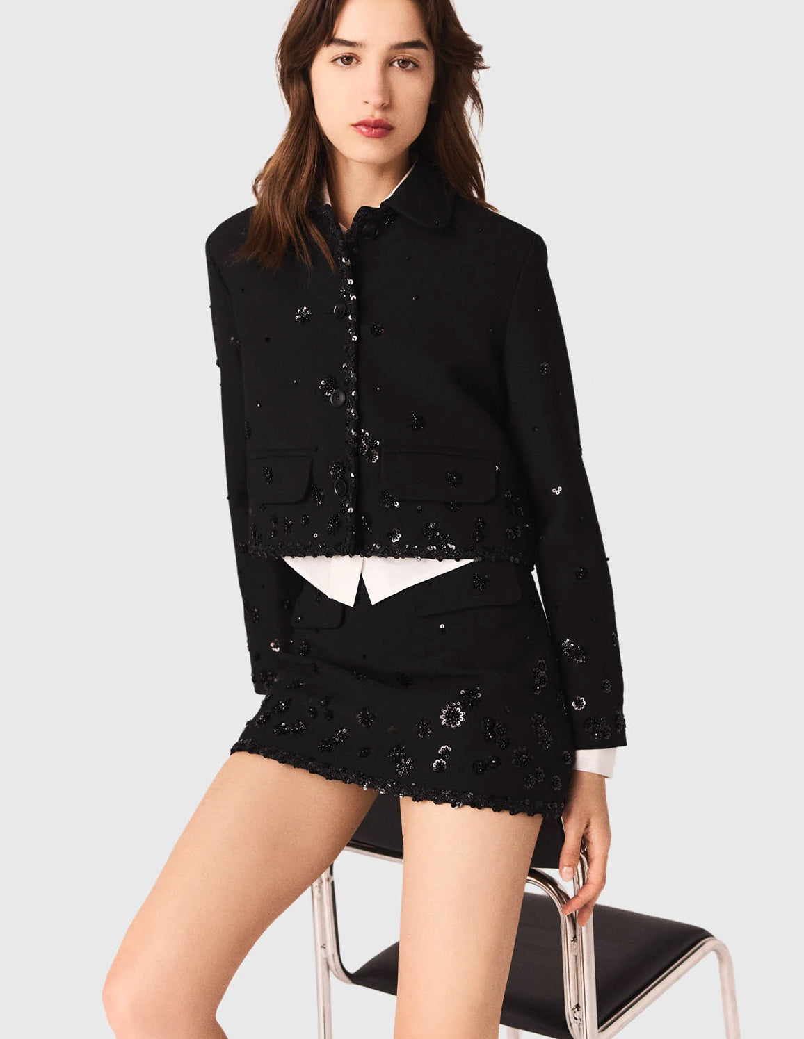 • This short jacket makes a statement with its sequin embroidery that forms luminous flowers. The contrast between the tailored cut and the exquisite details gives it a bold character.
