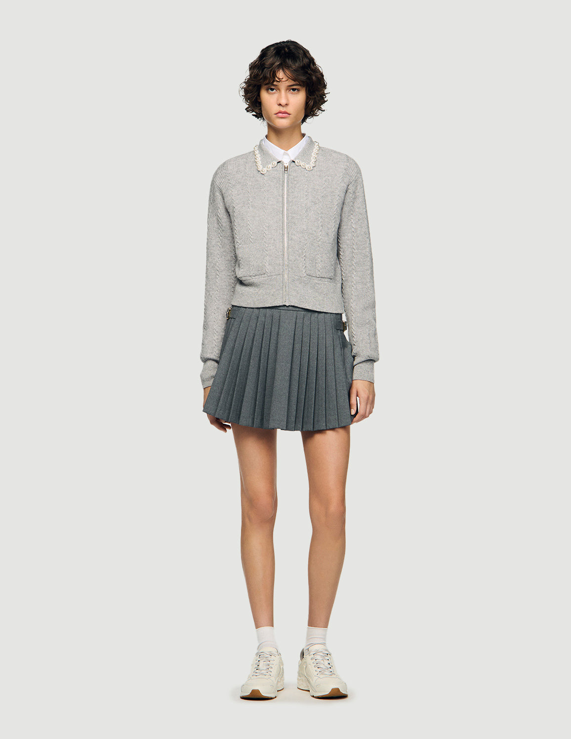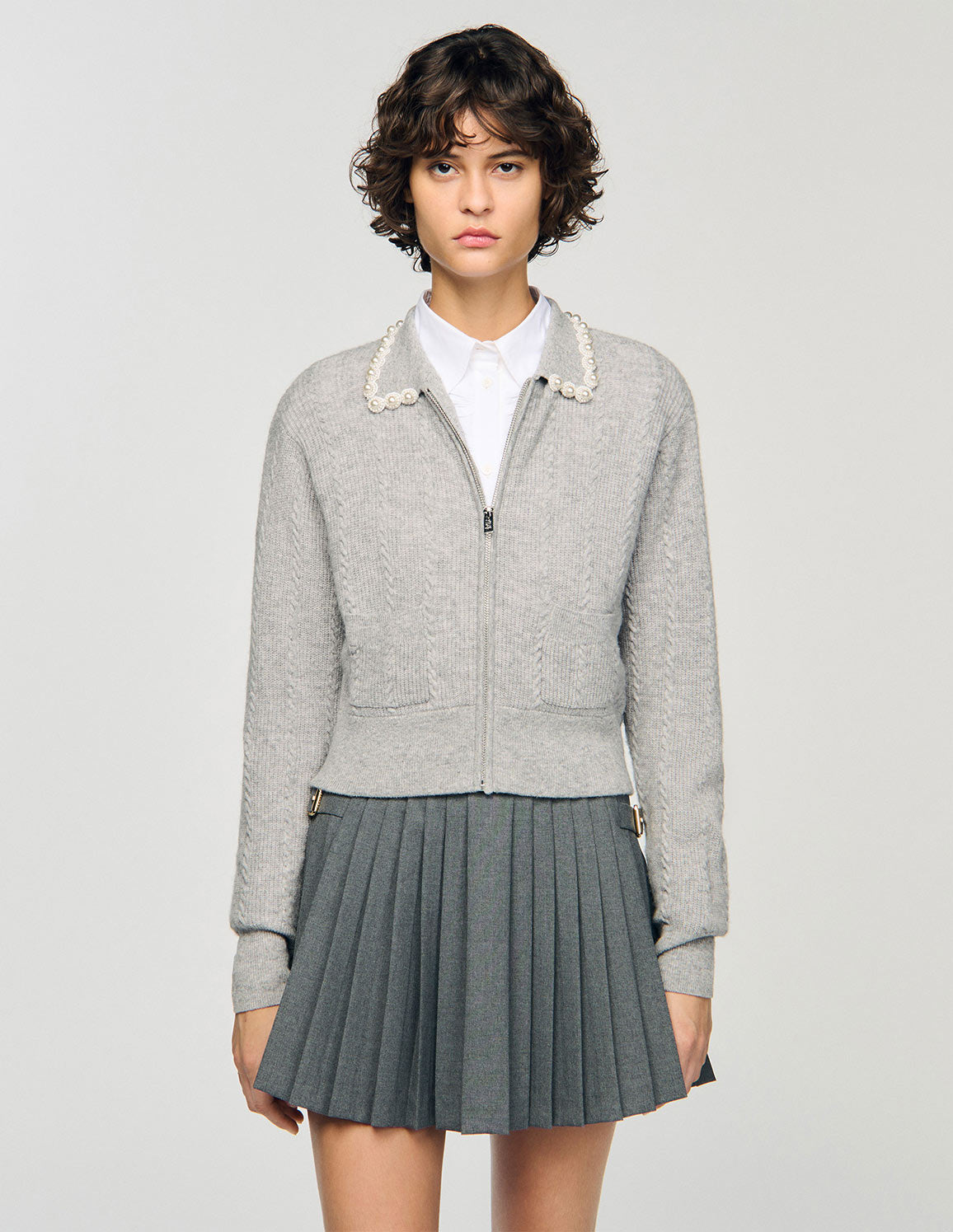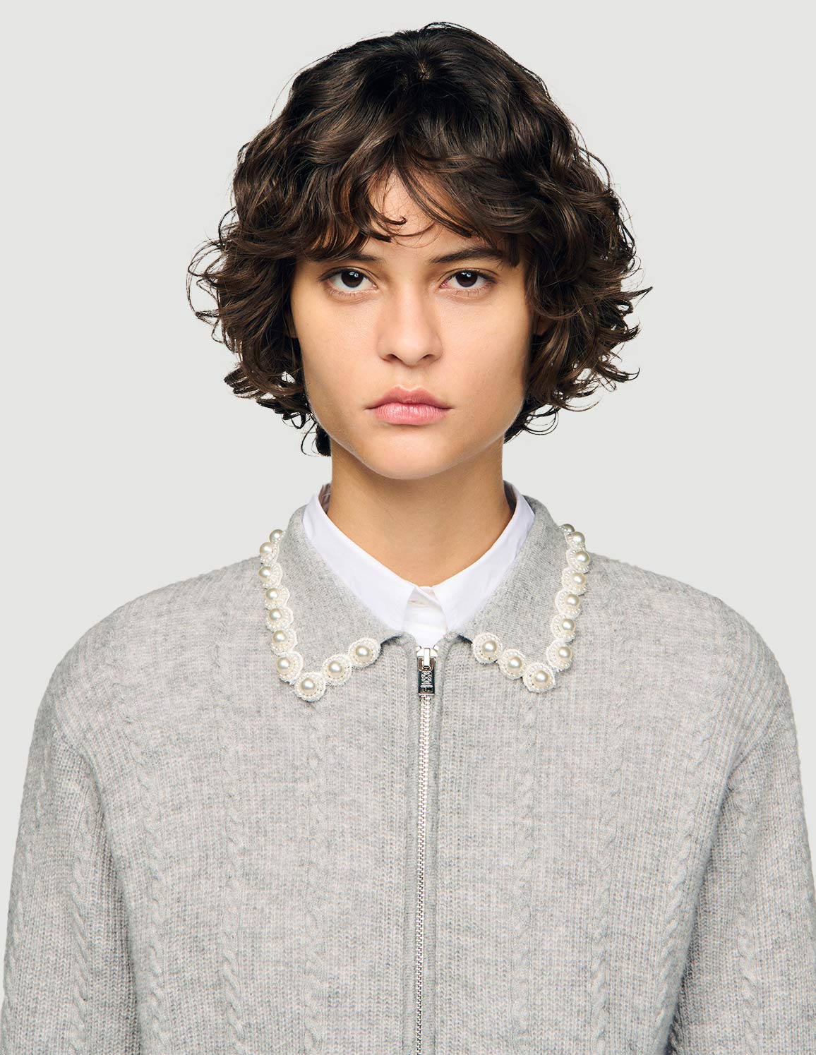 • Cable knit cardigan with a pearl-embellished shirt collar and zip fastening.
