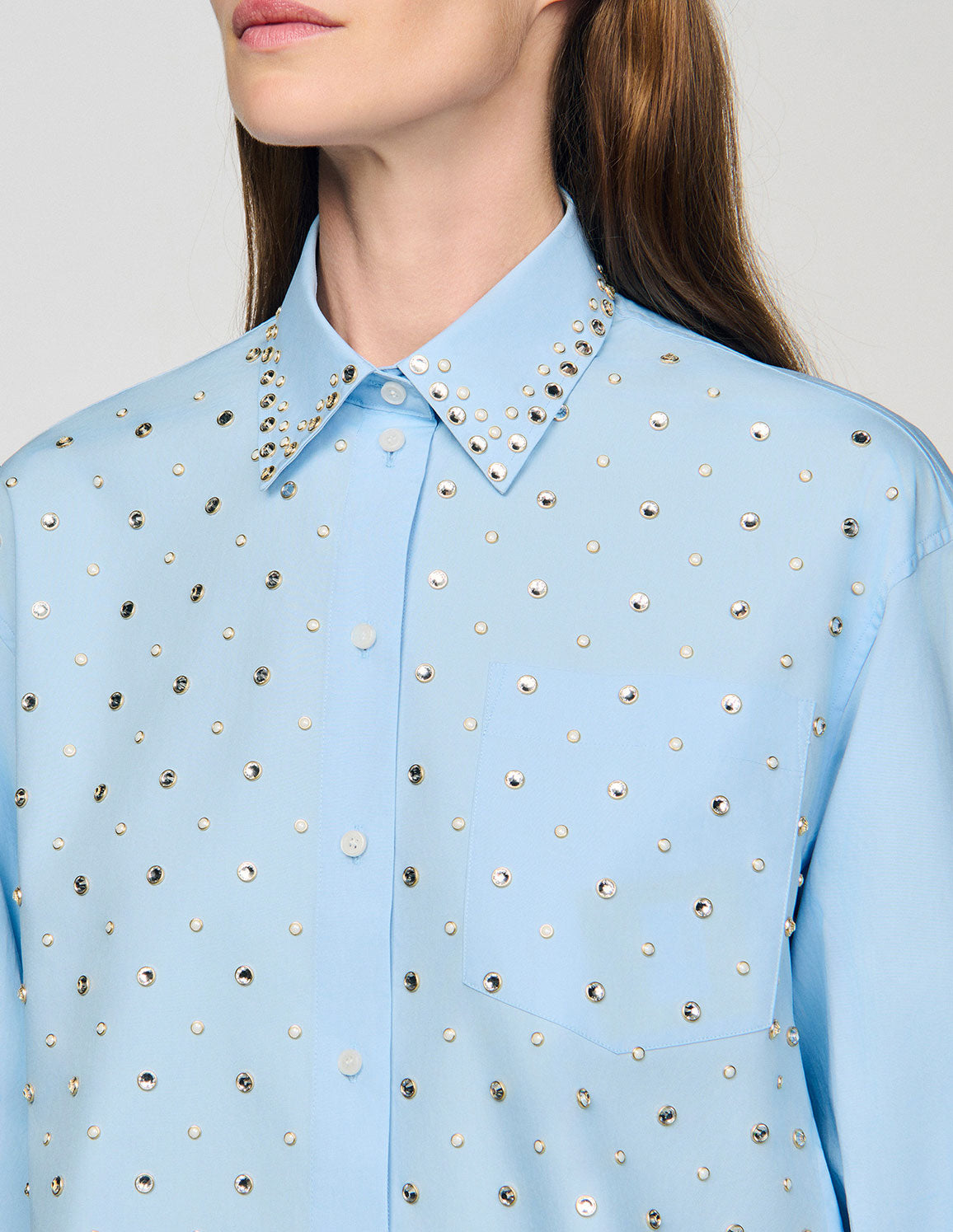 • Cropped shirt embellished with rhinestones, featuring a shirt collar, button placket, and patch pocket on the chest.