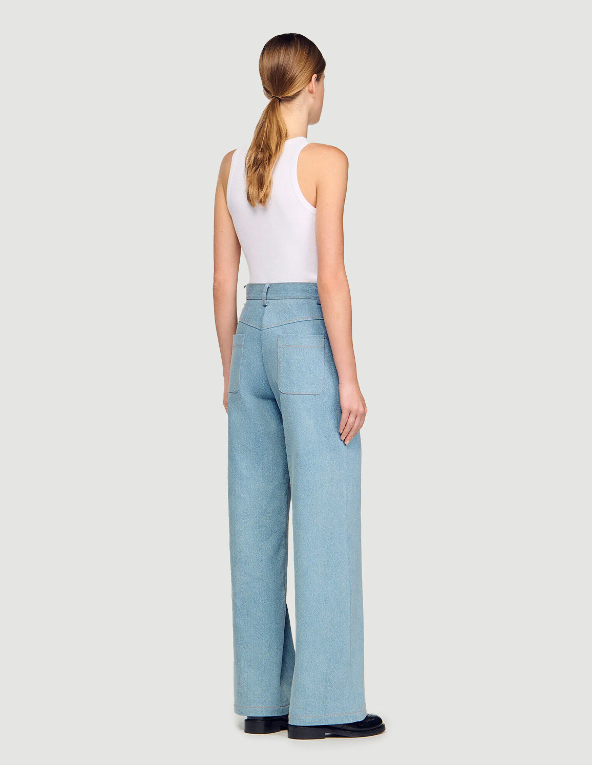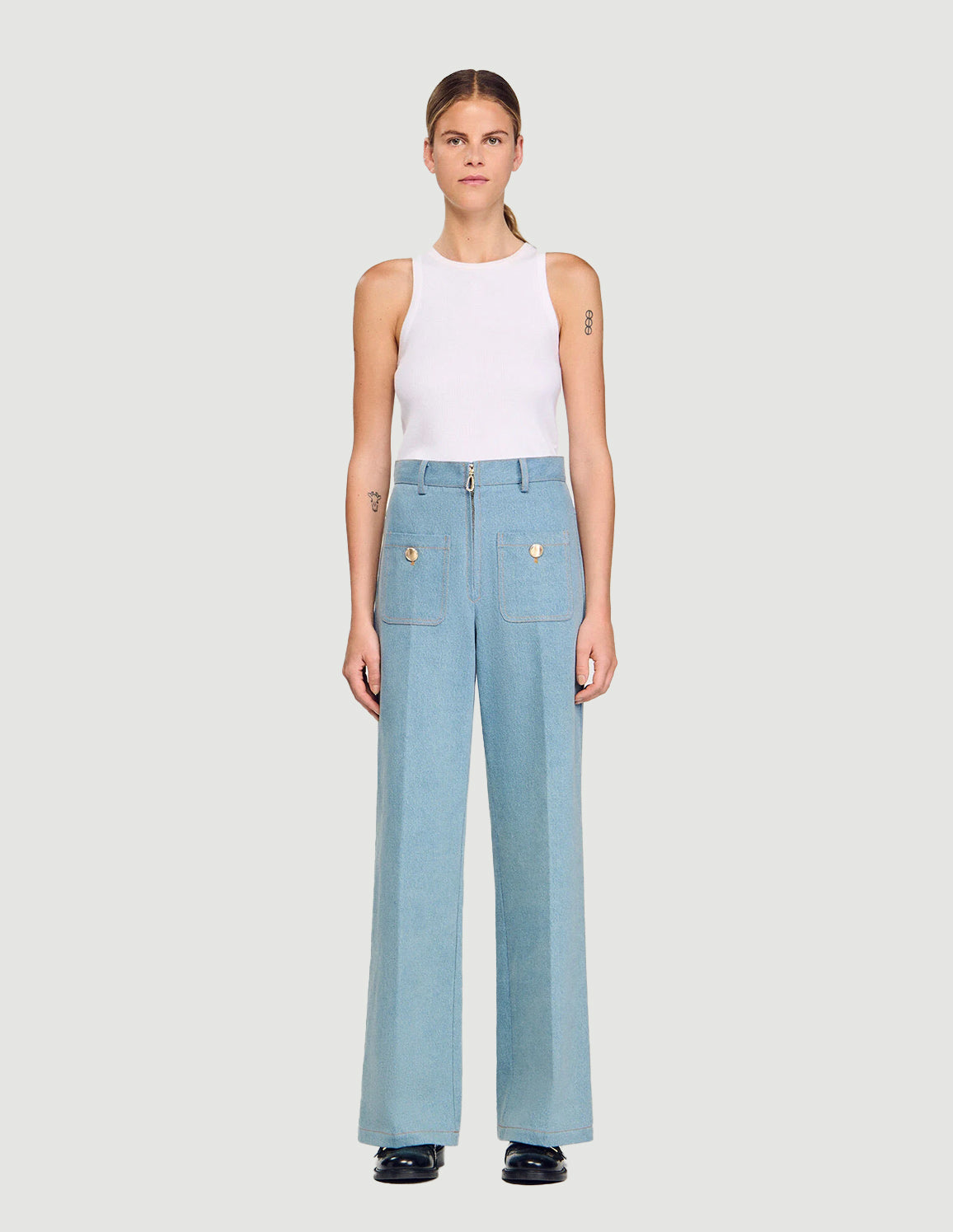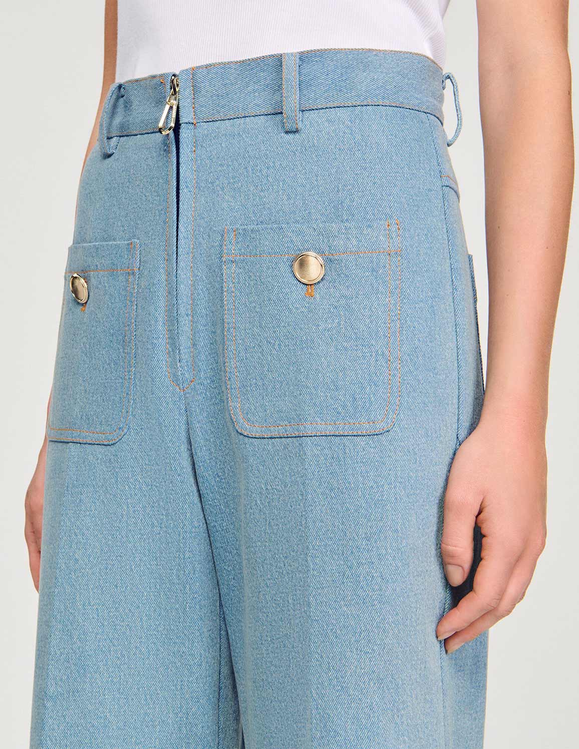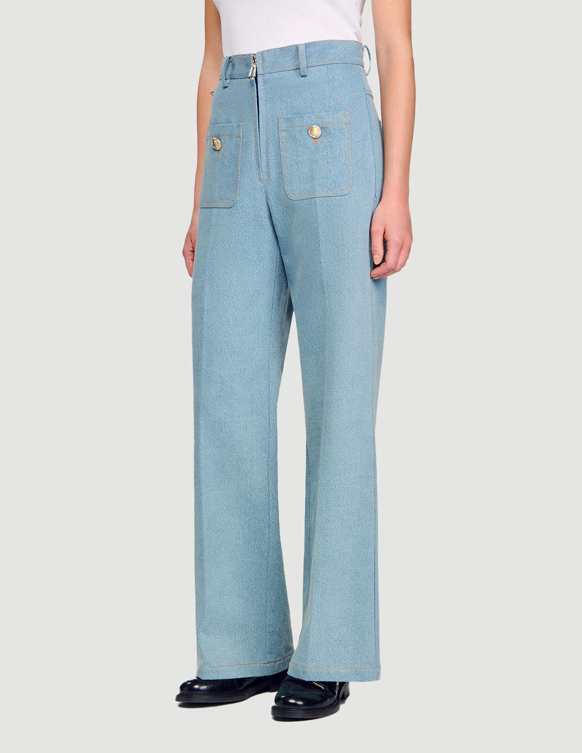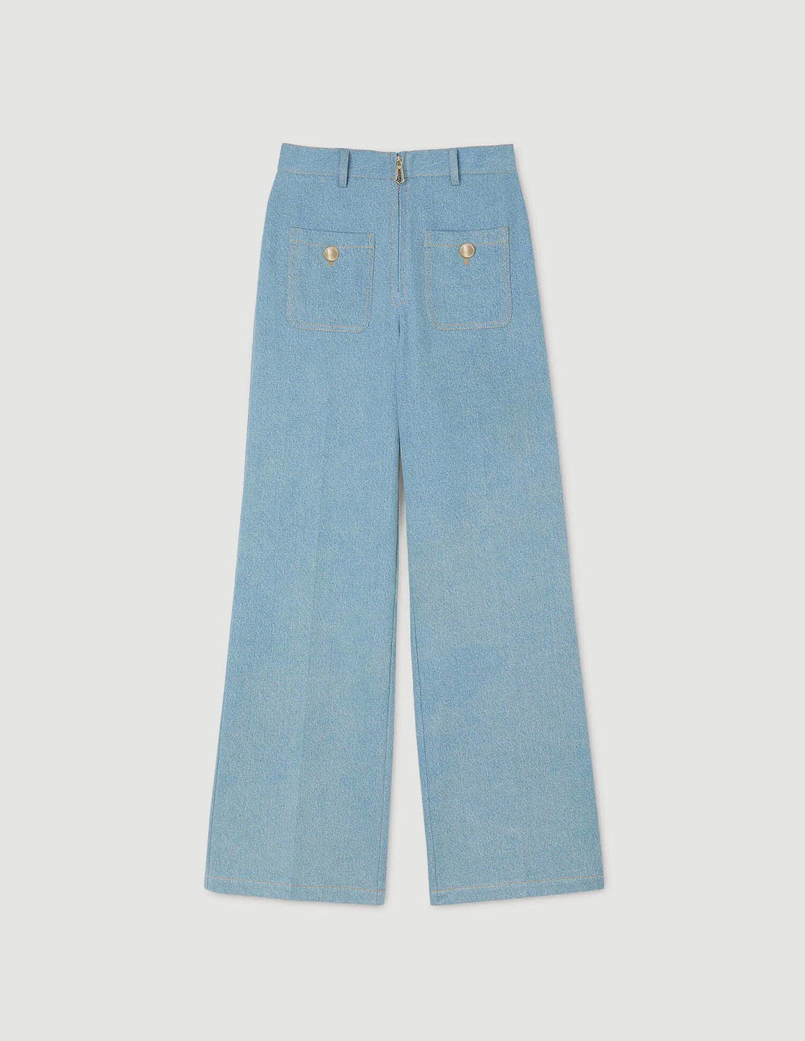 • High-waisted wide-leg jeans in faded denim, featuring buttoned patch pockets on the front and patch pockets on the back.