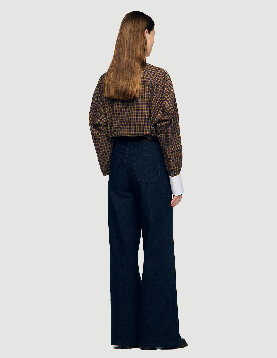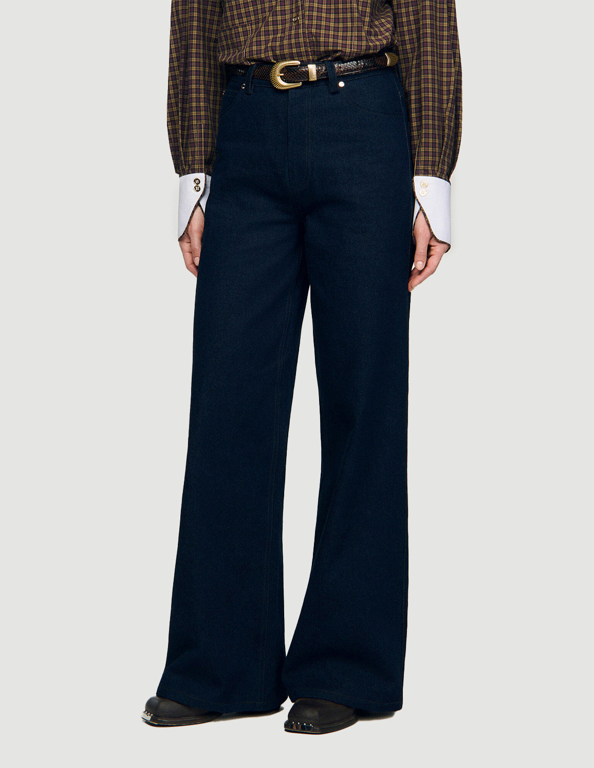 • Wide-leg raw denim jeans with mid-rise waist and five pockets.