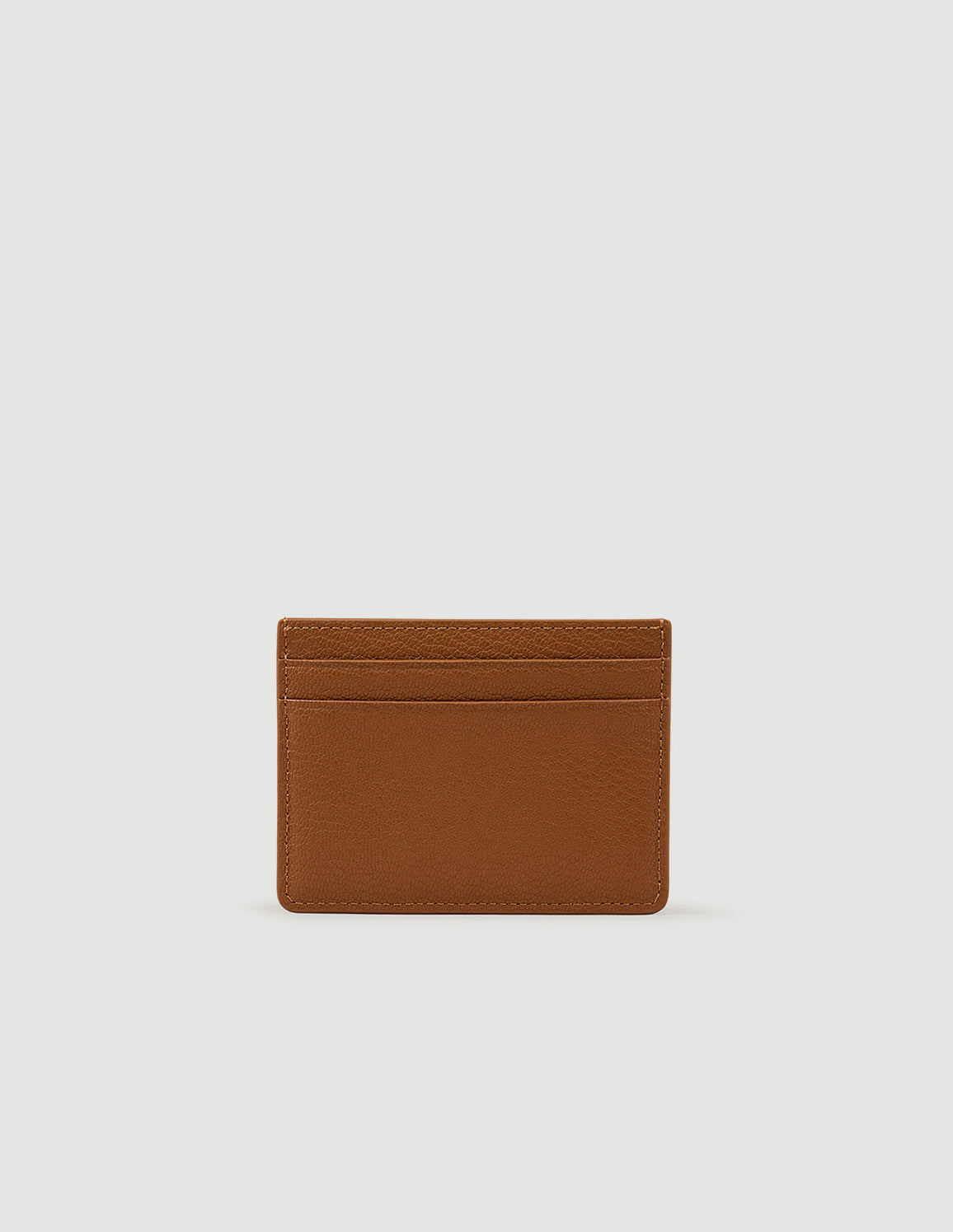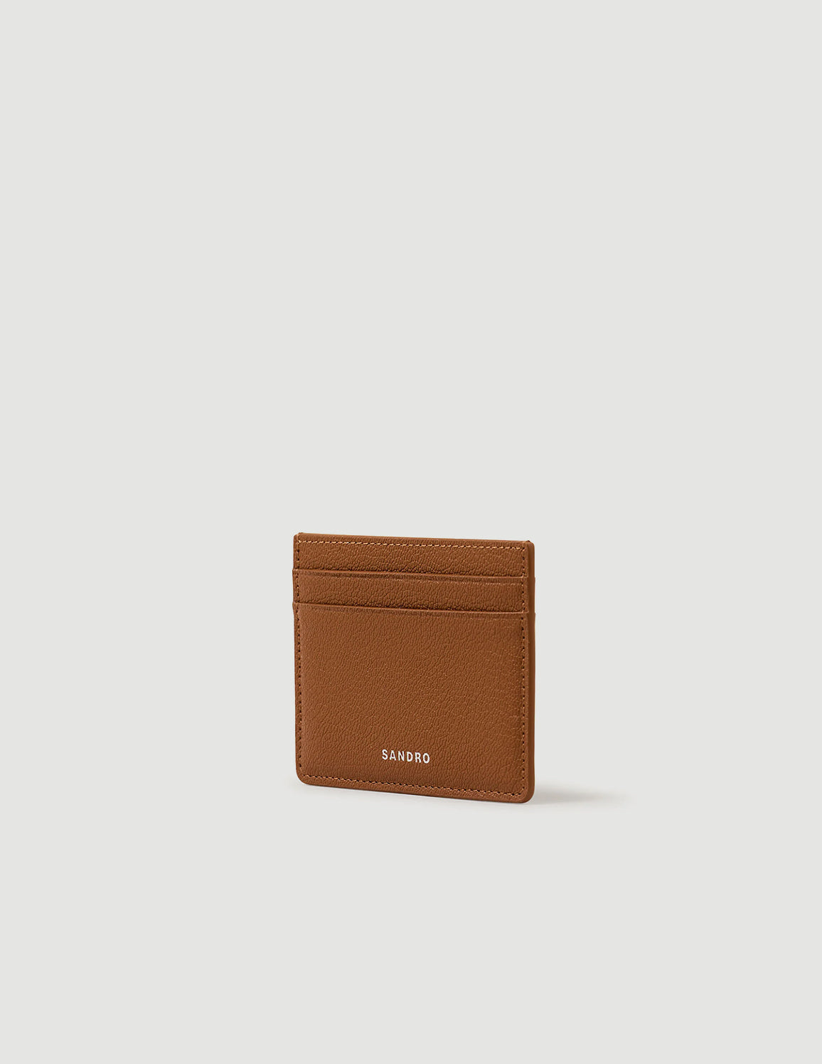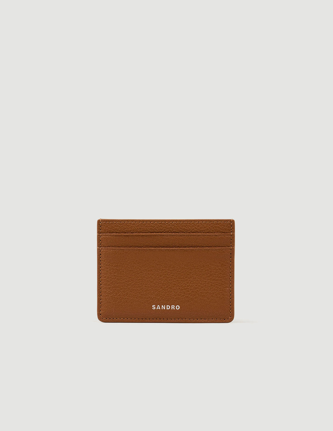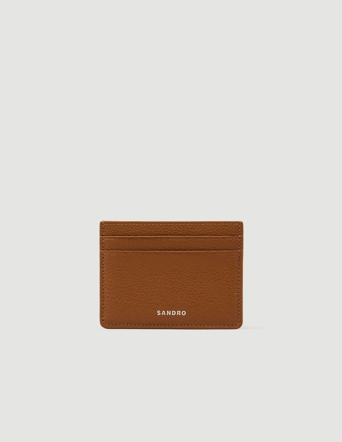 • Foldable grained leather cardholder with silver Sandro logo, featuring card slots.