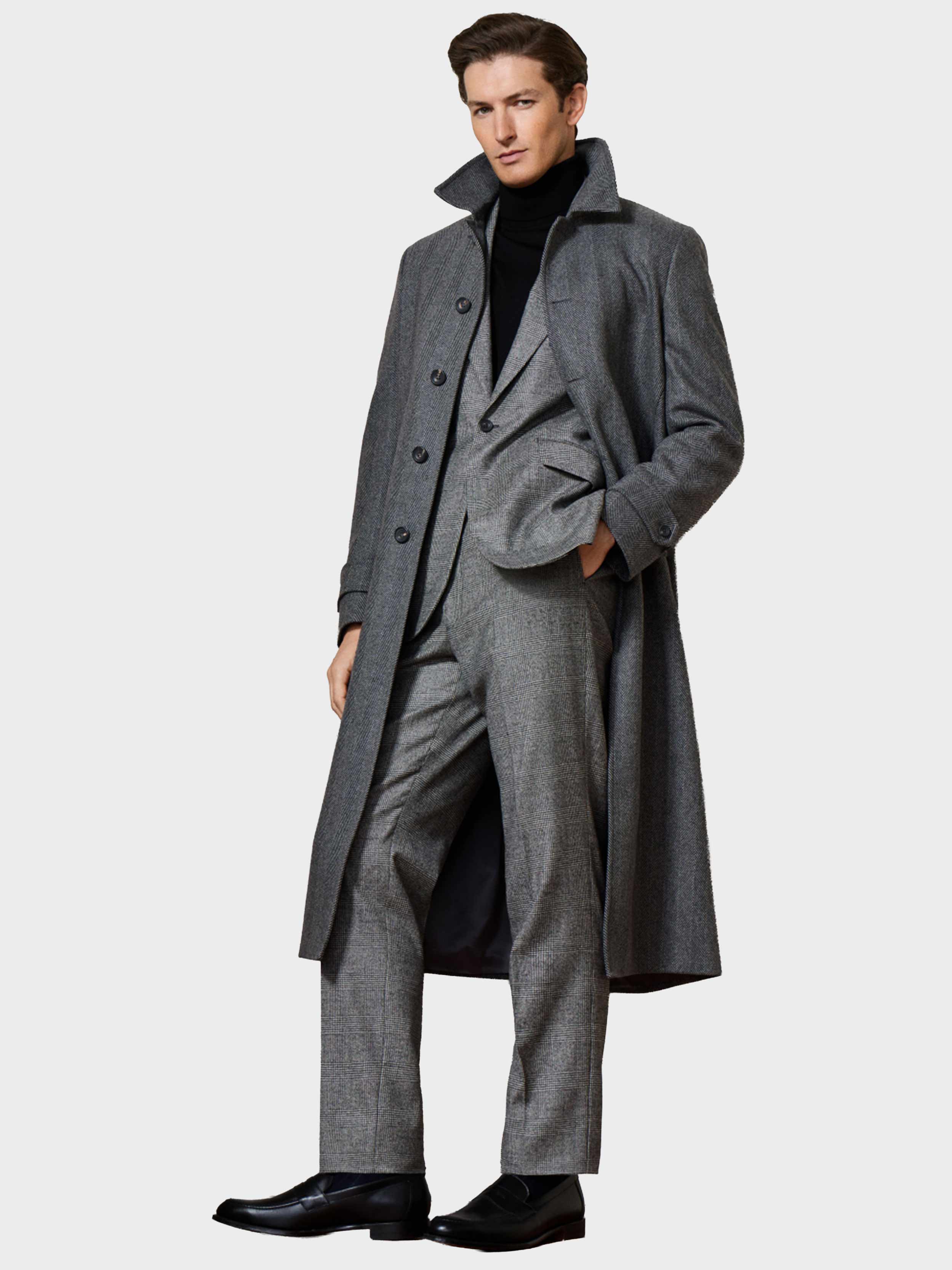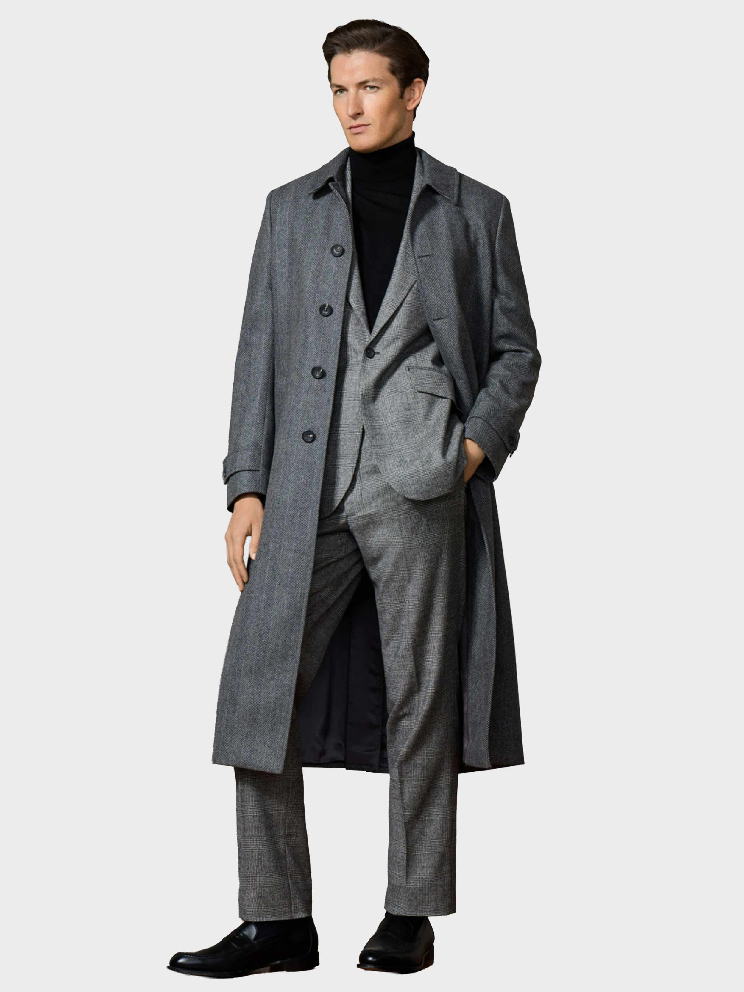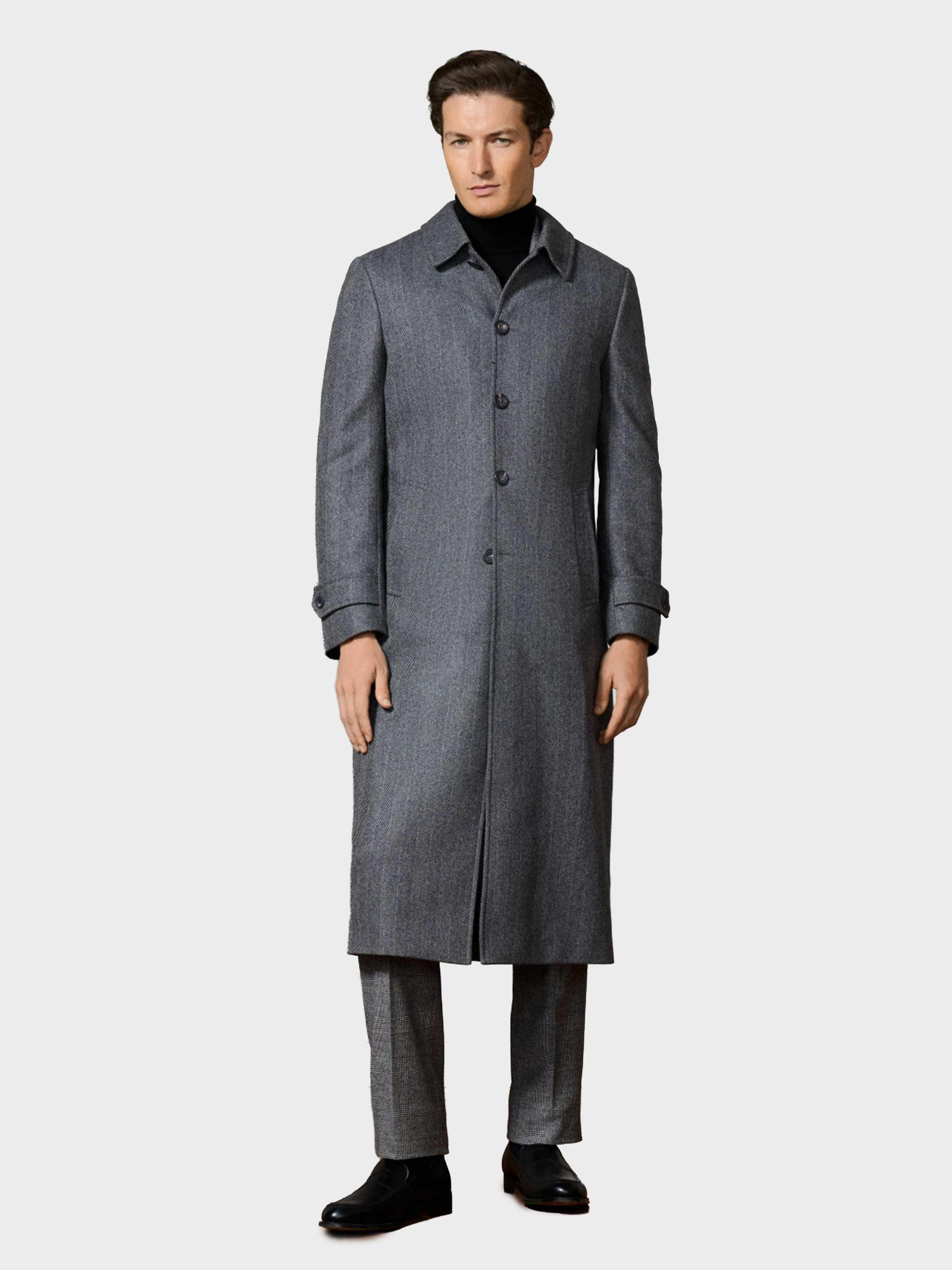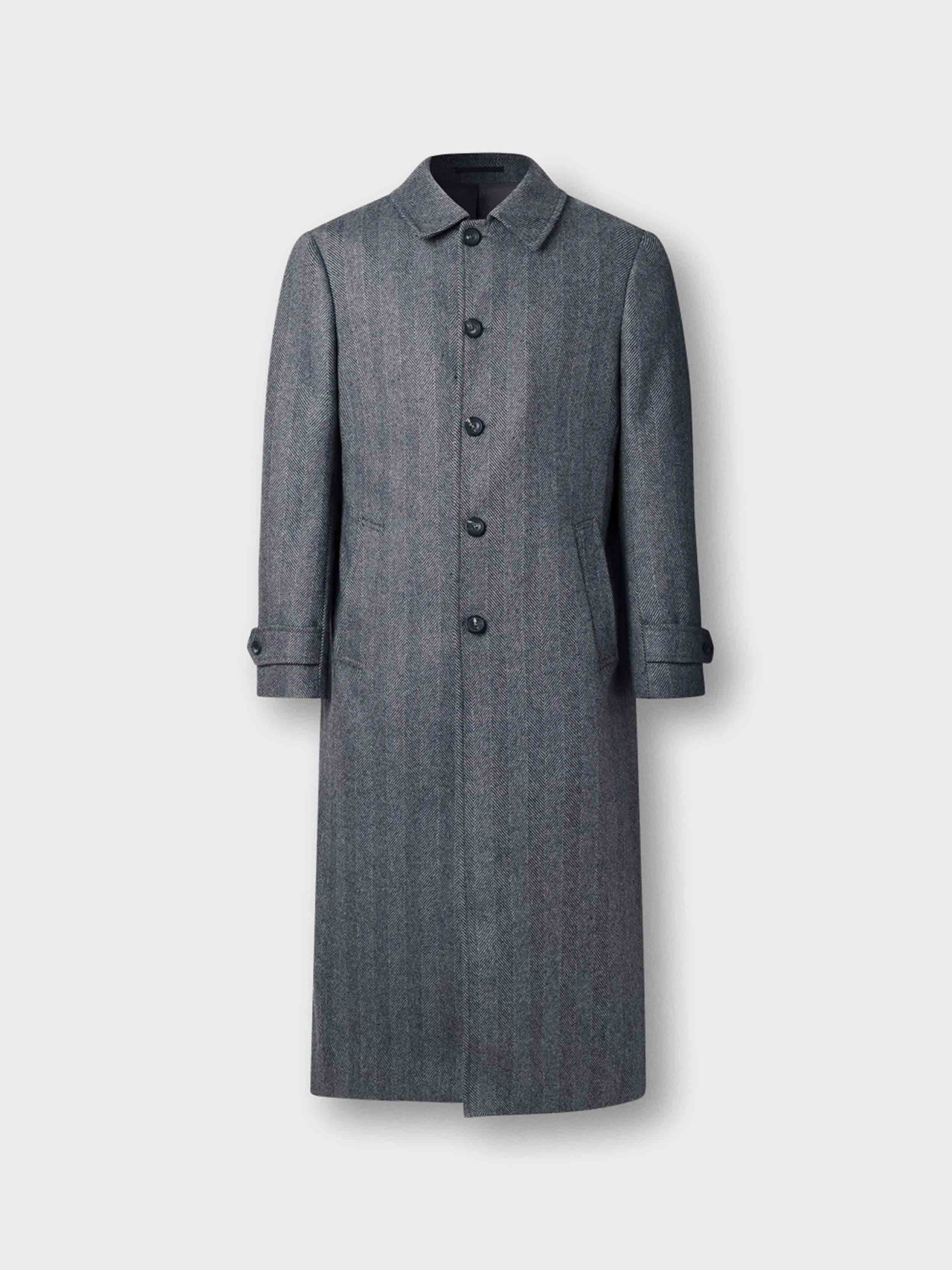 • This long overcoat is crafted from bold monochrome herringbone wool-cashmere blend fabric. It includes a shirt collar, side welt pockets, and a centre back pleat with a long buttoned vent, finished with genuine horn buttons for added sophistication.